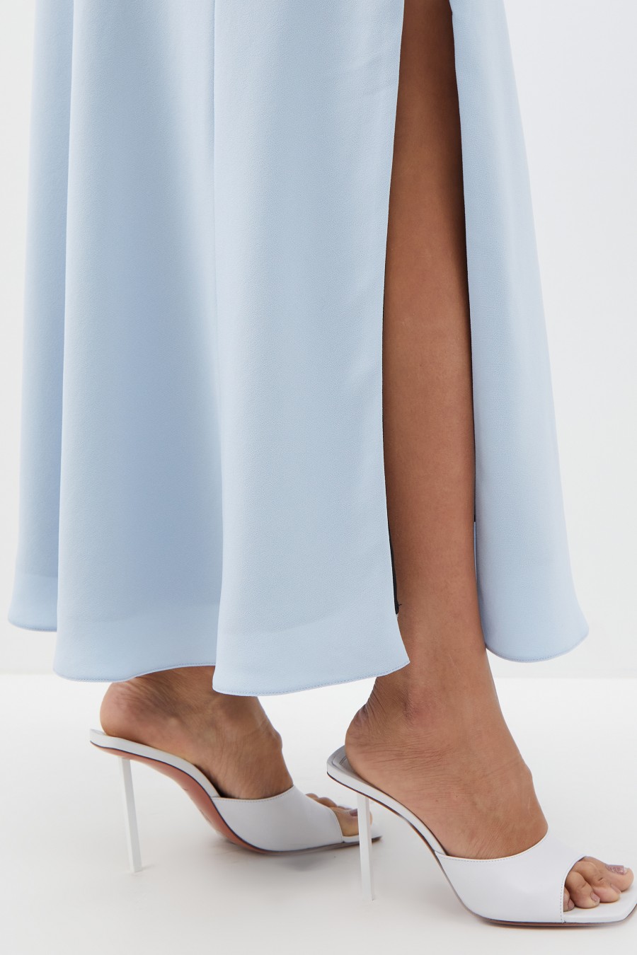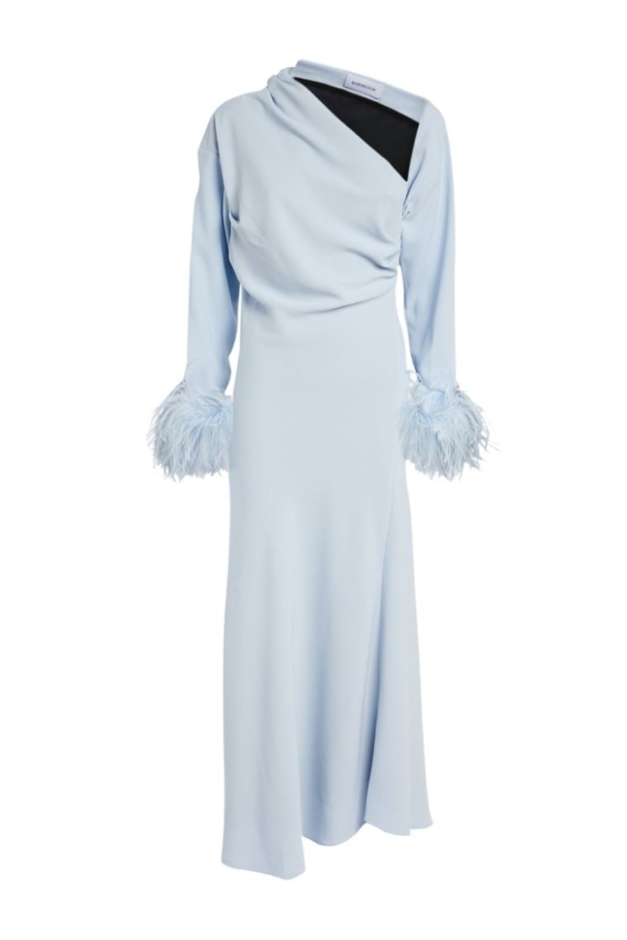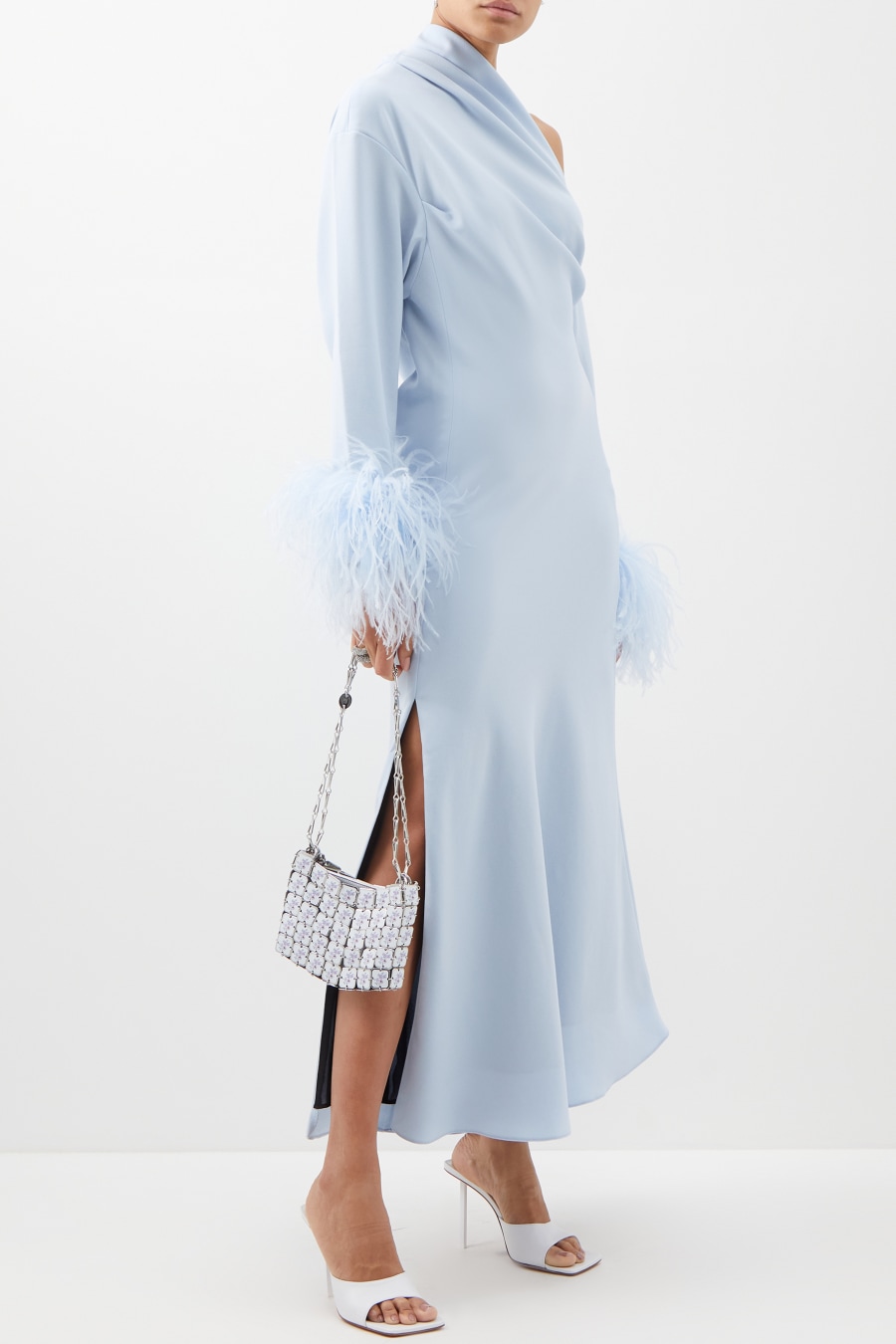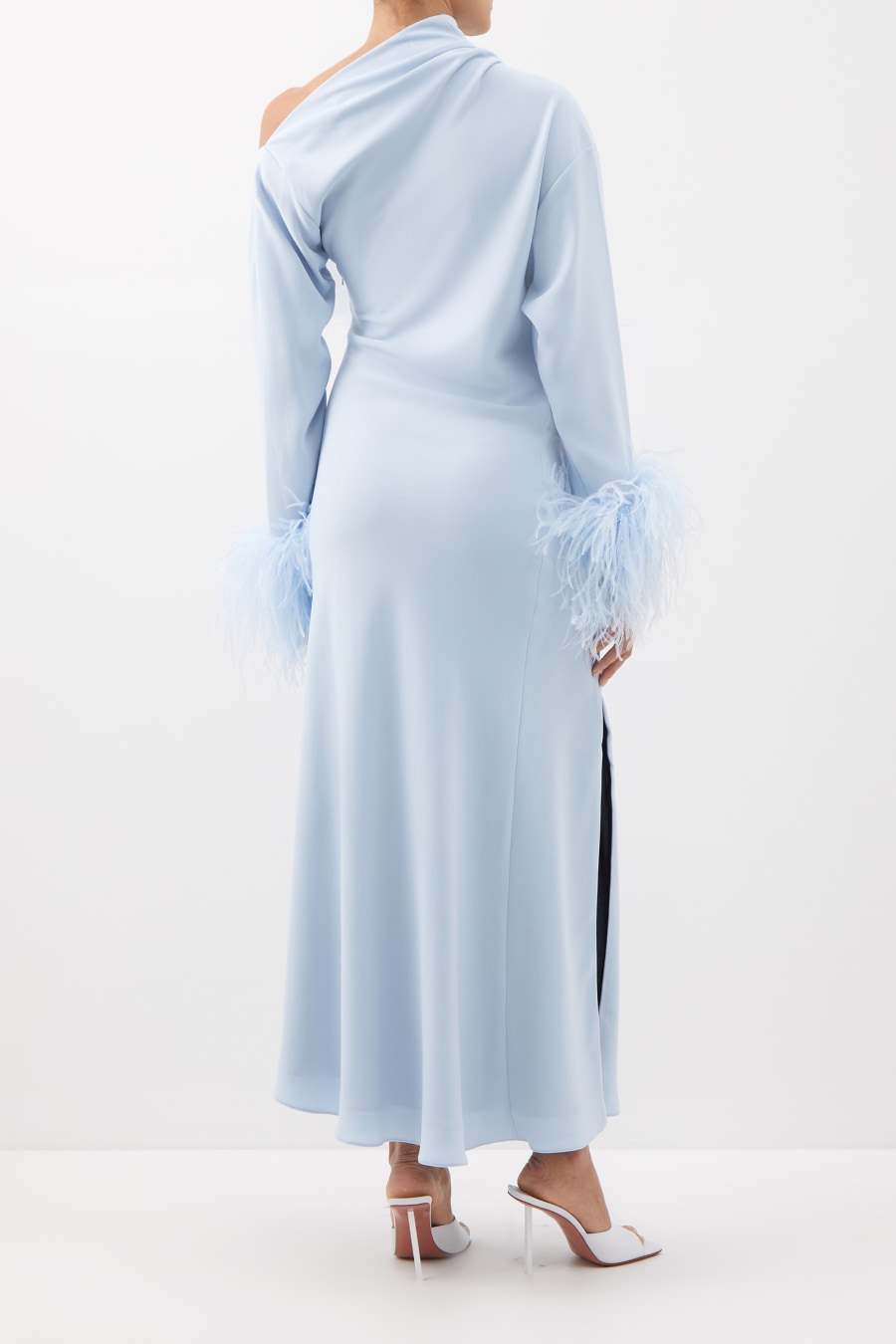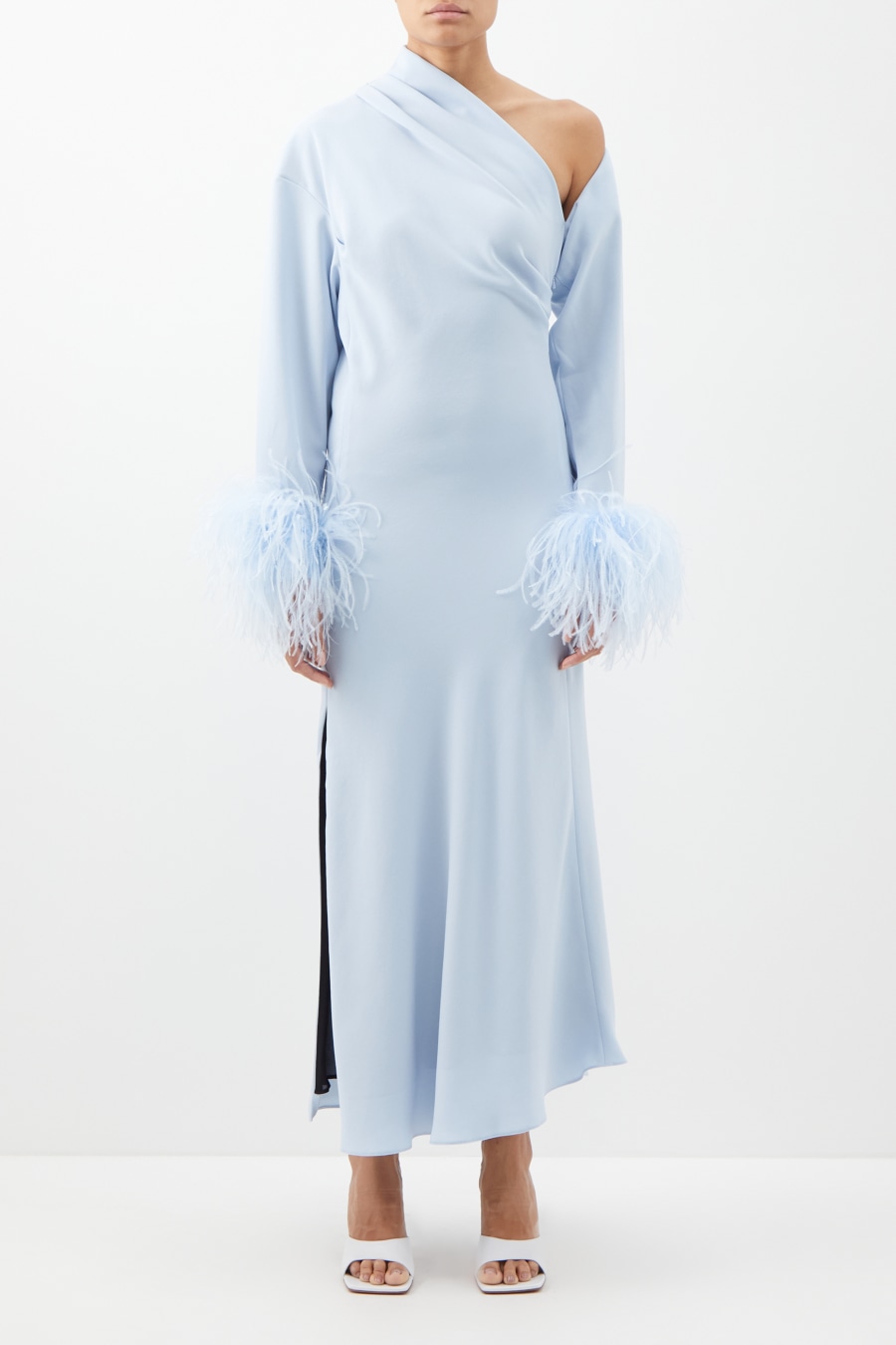 16Arlington's pale-blue Adelaide dress is shaped with a shoulder-bearing asymmetric neckline from lightweight draped crepe, with a slit hem an feathered cuffs.