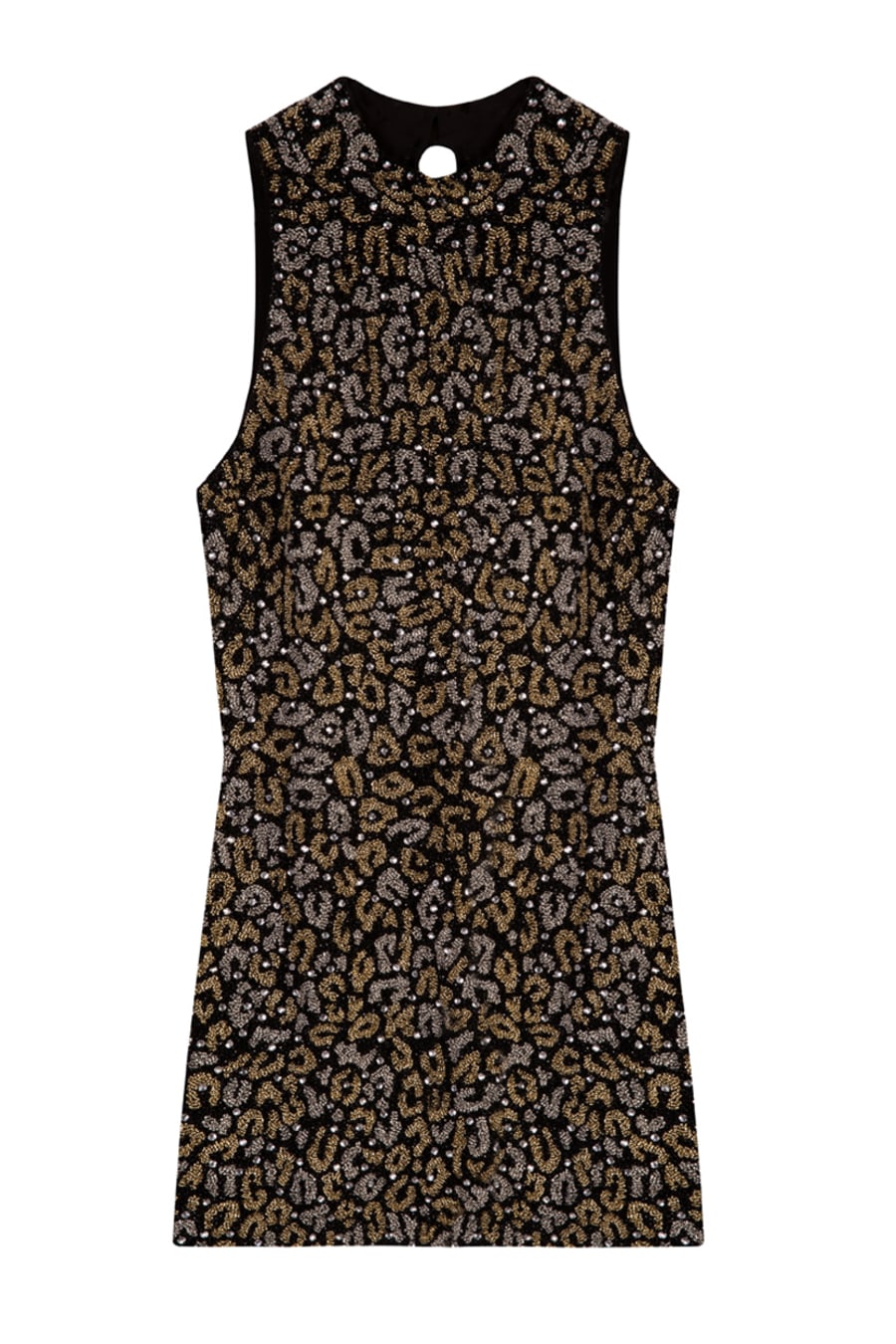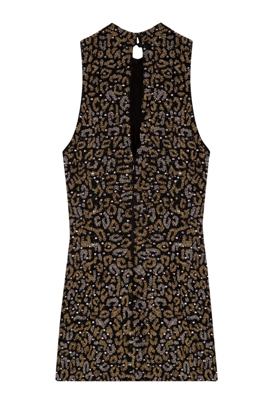 adorned with thousands of tiny twinkling black, gold and silver sequins, seed beads and crystals. The micro mini design has a high neck, cut away armhole and split back. Team with
