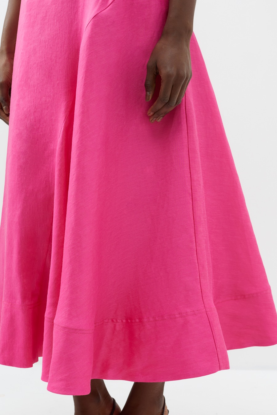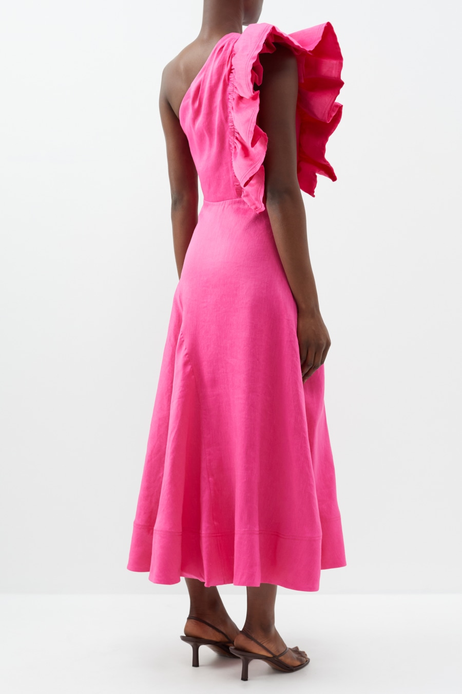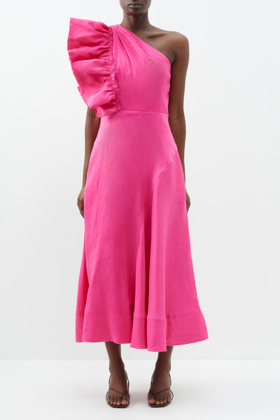 Aje’s asymmetric linen-blend Bonjour dress arrives in bright fuchsia pink with a statement ruffle to give your looks a dramatic finish.