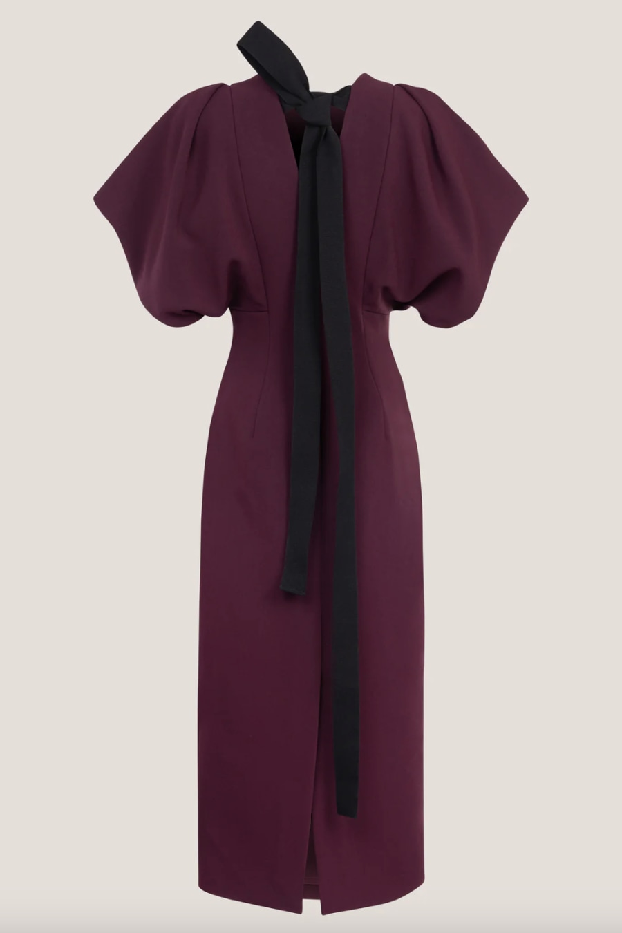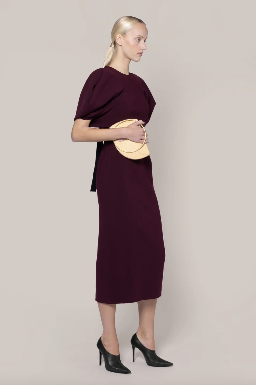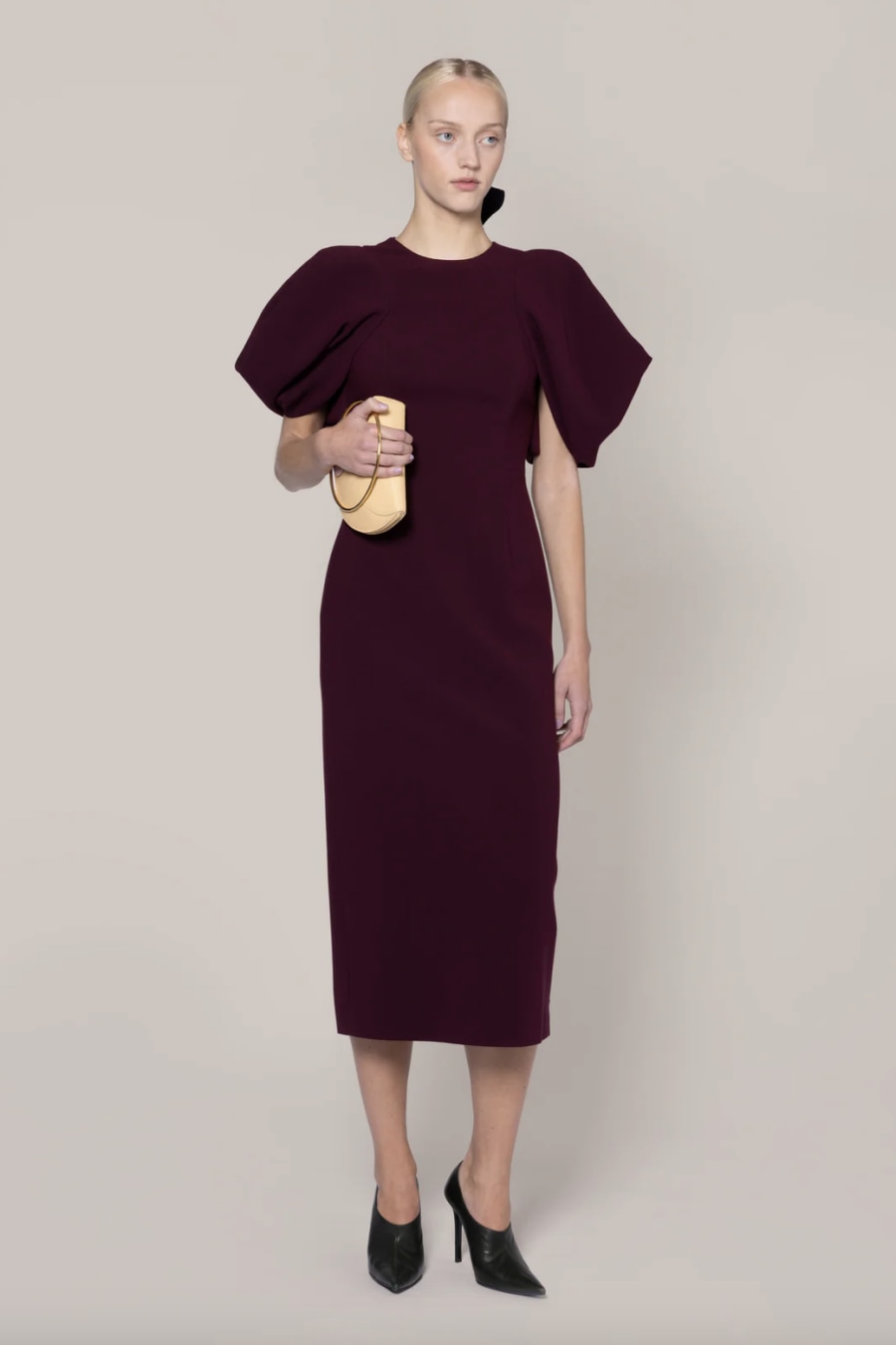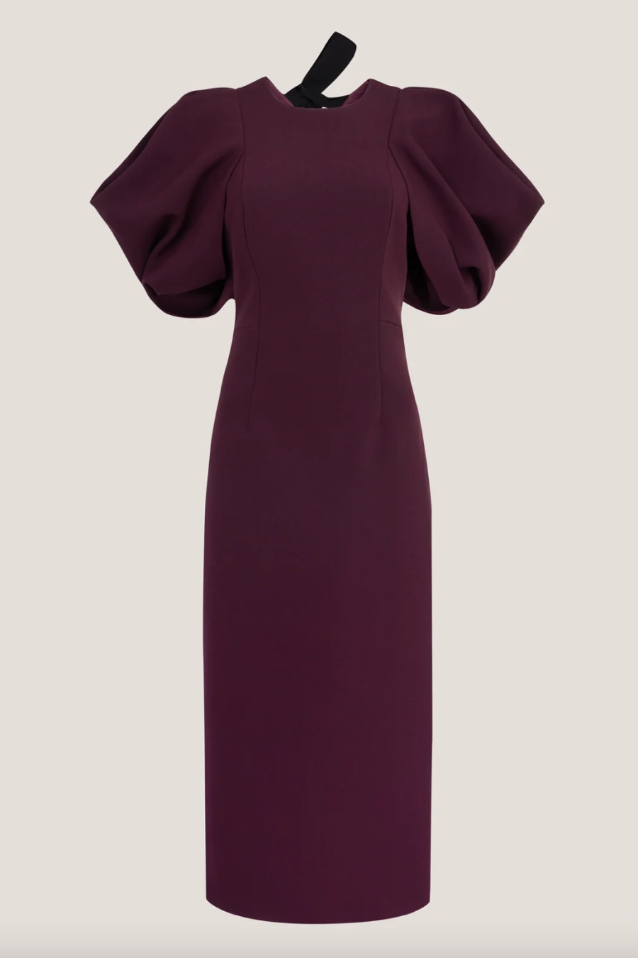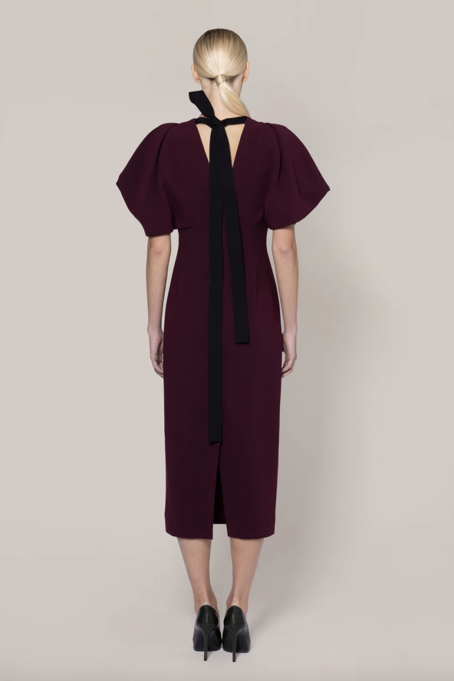 The CALITA dress features voluminous sculpted sleeves that add a bold, architectural flair to its sleek silhouette. This fitted mid length dress is crafted in crepe with a sensual V back, finished with a black ribbon tie at the nape.