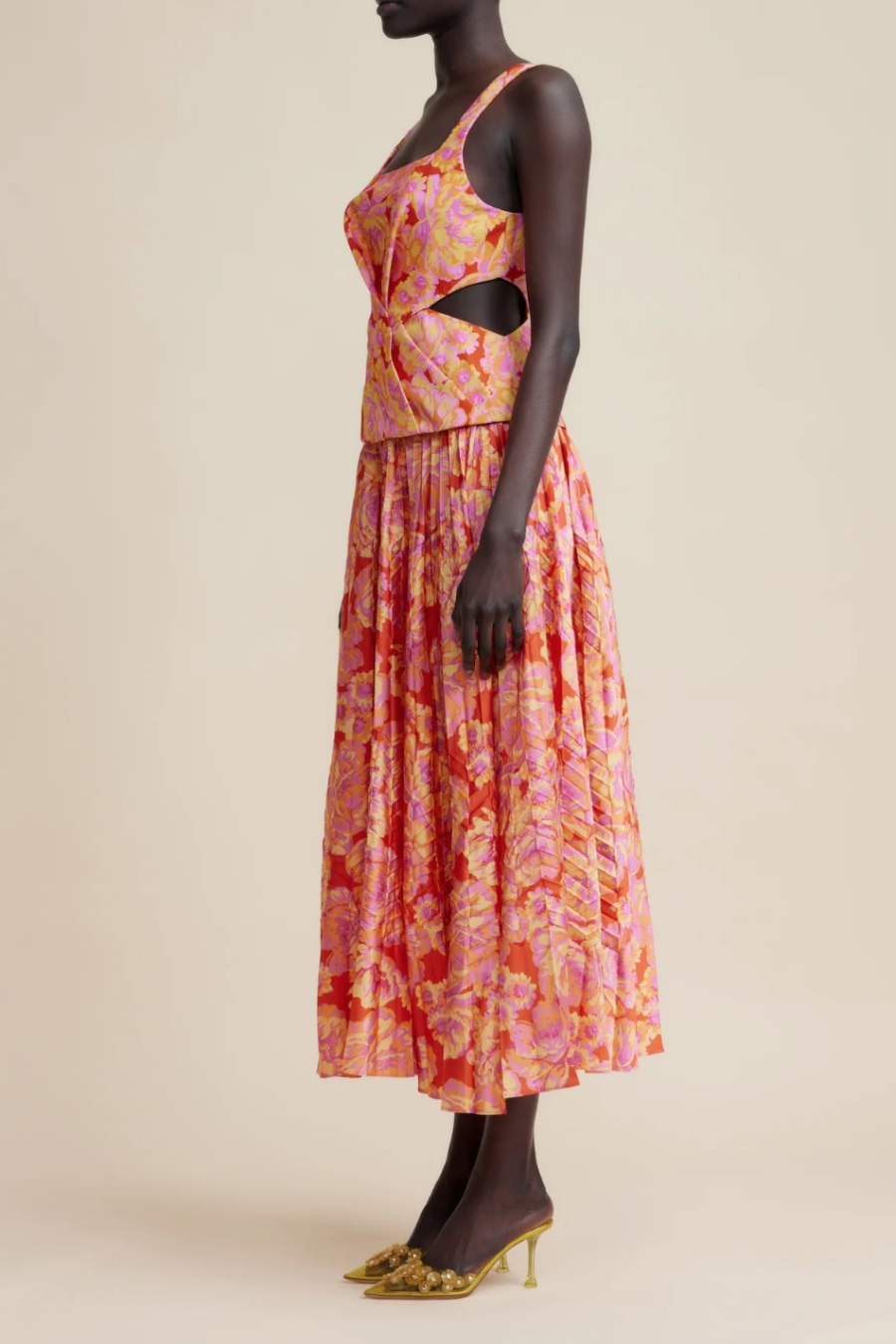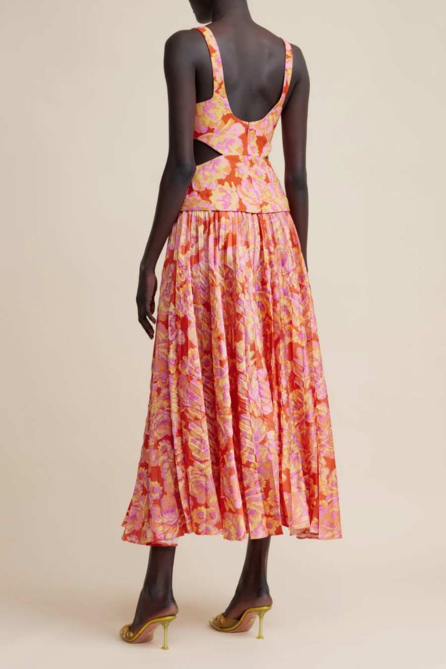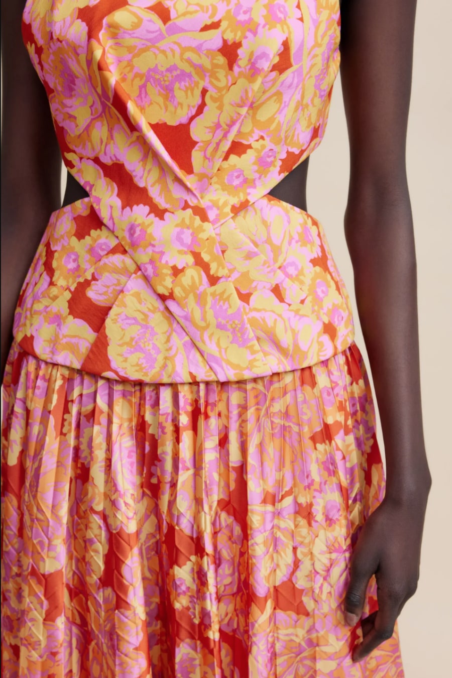 A statement silhouette in our key Summer Bloom colour way ~ the Chester Dress is designed with the event season in mind. Fitted at the bodice and flowing toward the hem, this piece features side bodice cut outs, scooped backline, twisted detail and a soft pleated skirt.