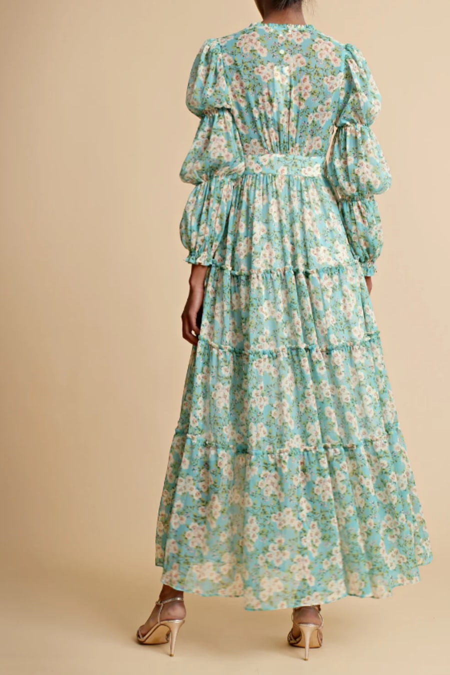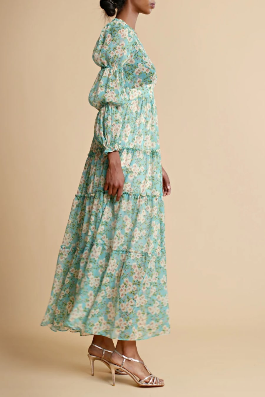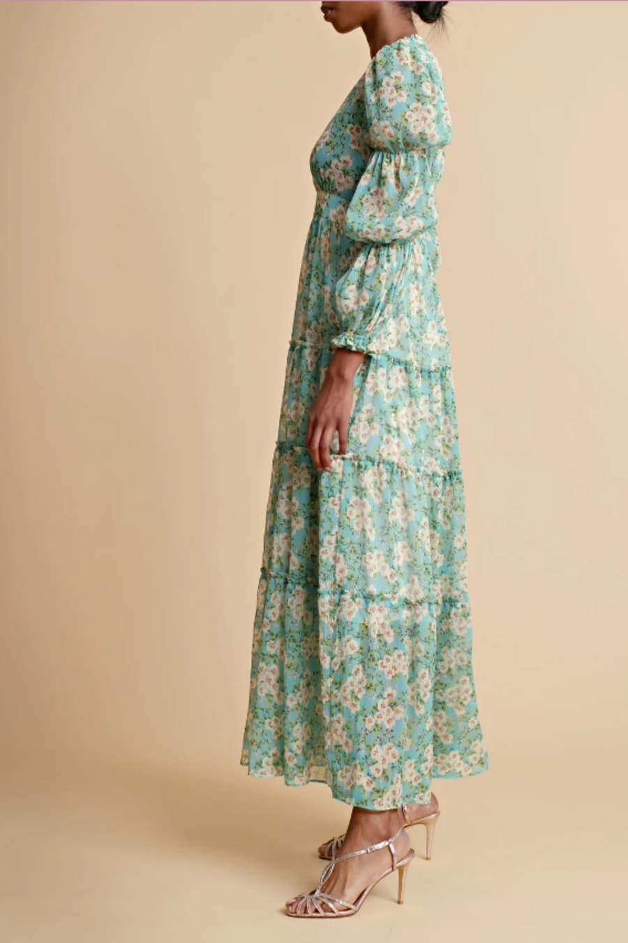 The Chiffon Maxi Dress is cut in our slightly sheer and airy, recycled polyester quality. It has a maxi length, fitted waistline and long sleeves with smocking details, giving them a beautiful bounce. The dress has a v-neck with ruffle details. The skirt of the dress has lots of volume.