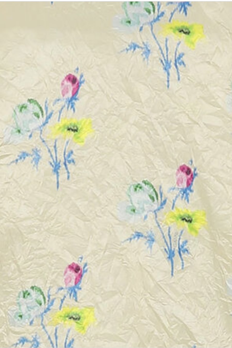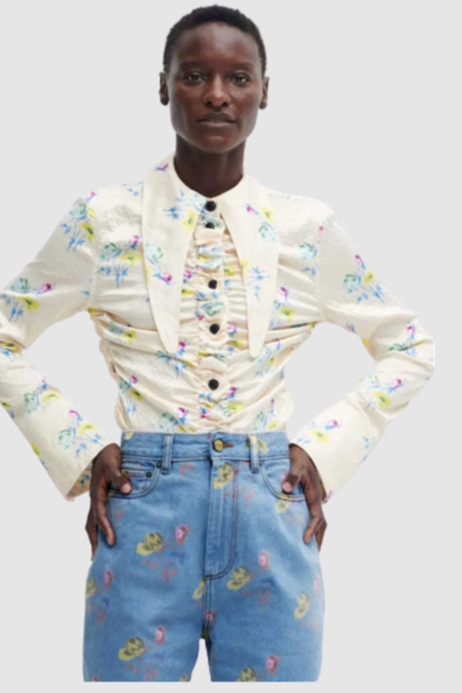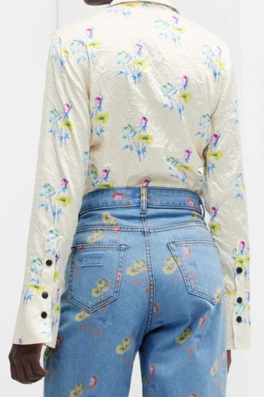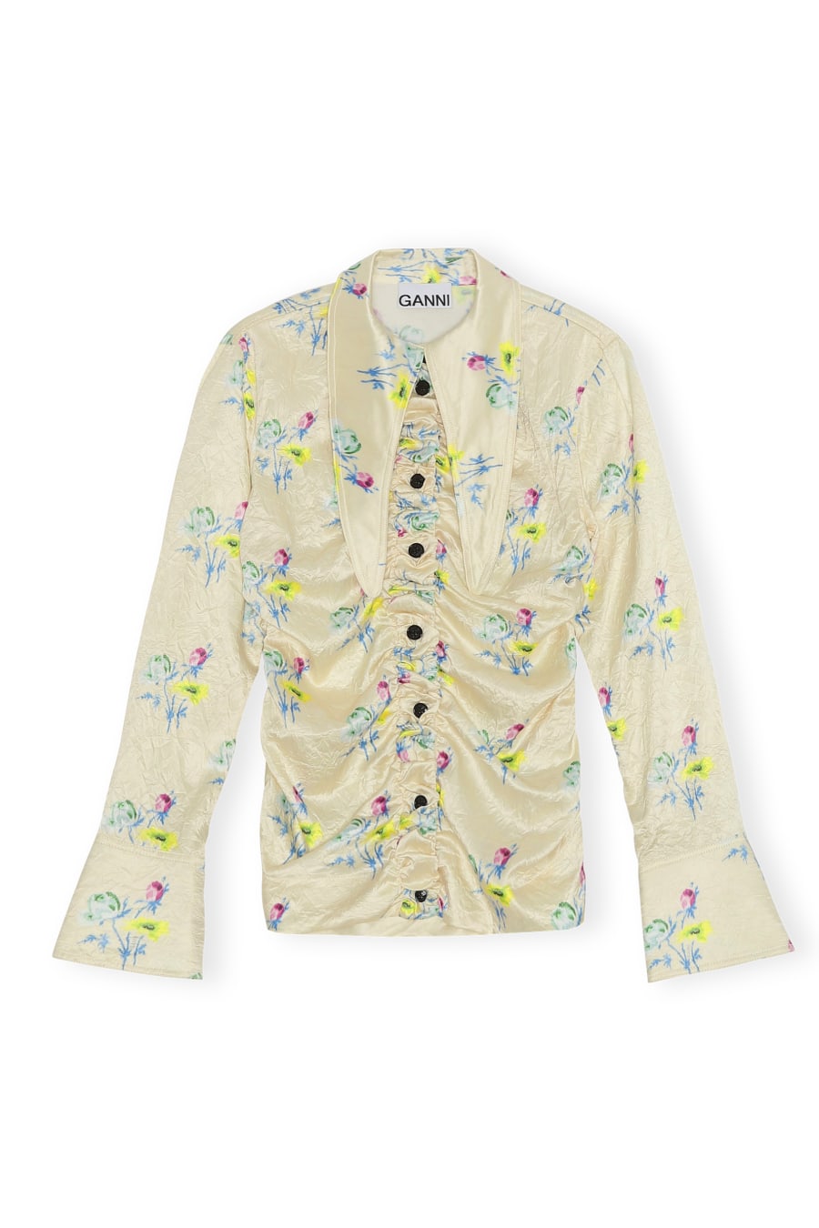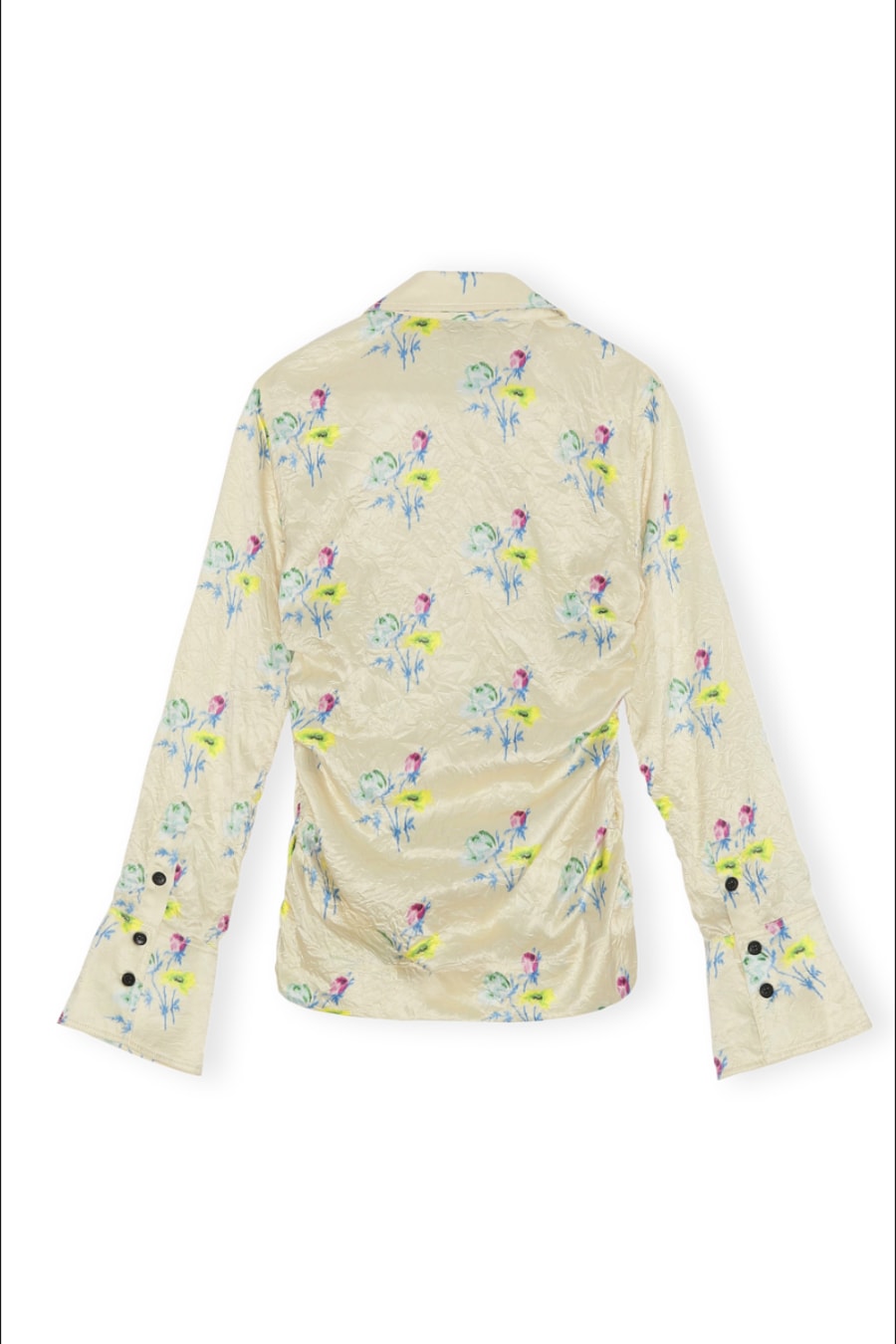 This is a silky shirt in crinkled satin, finished with a super long pointed collar, ruched sides, and gathered button placket. Each wrist has loosely flared buttoned cuff for a bell-sleeve effect. Cut for a slim silhouette. Style open like a little jacket or buttoned up and tucked into jeans.