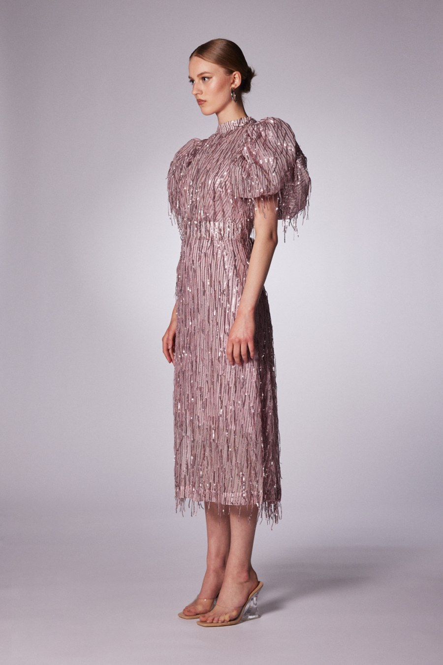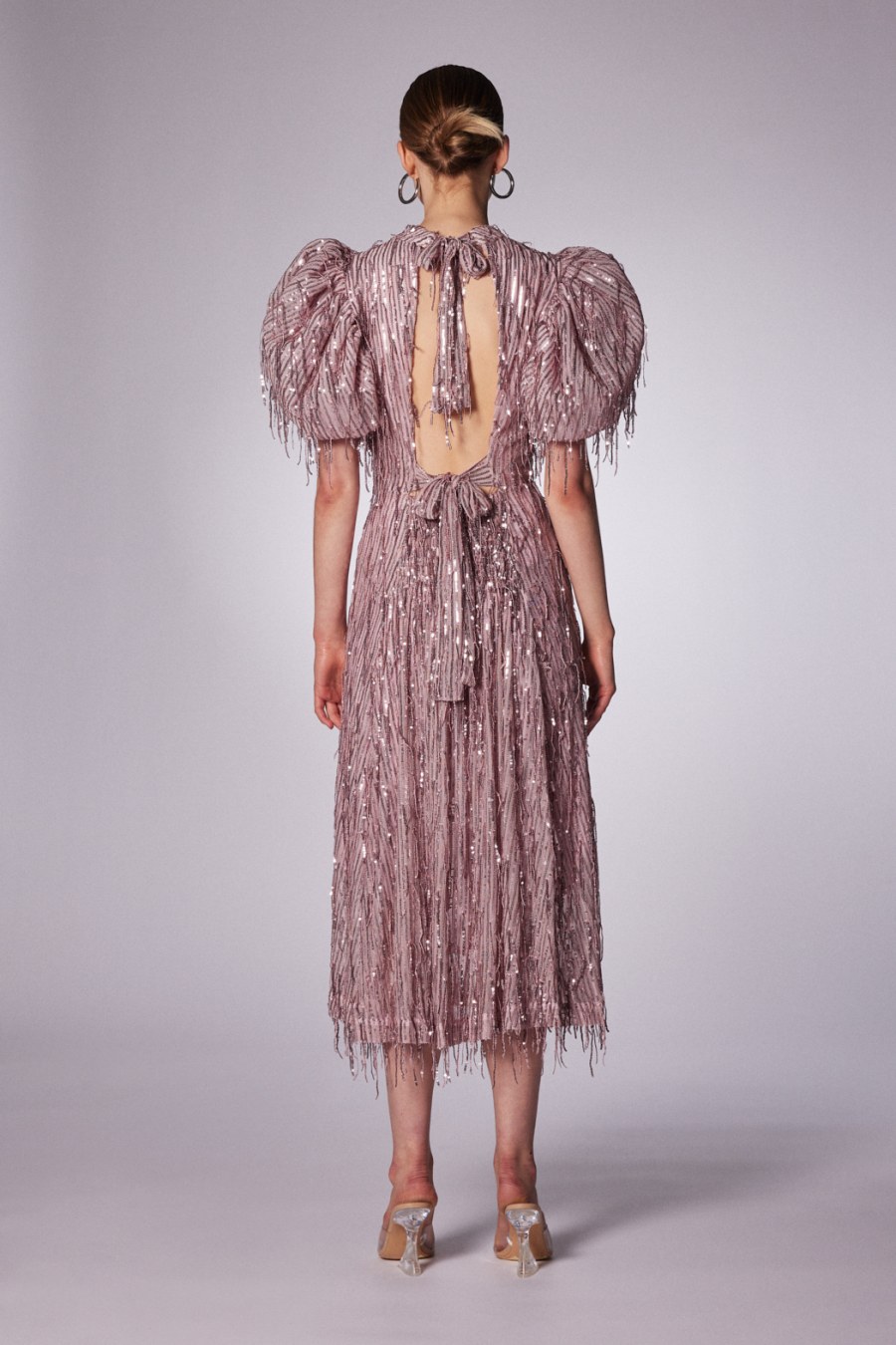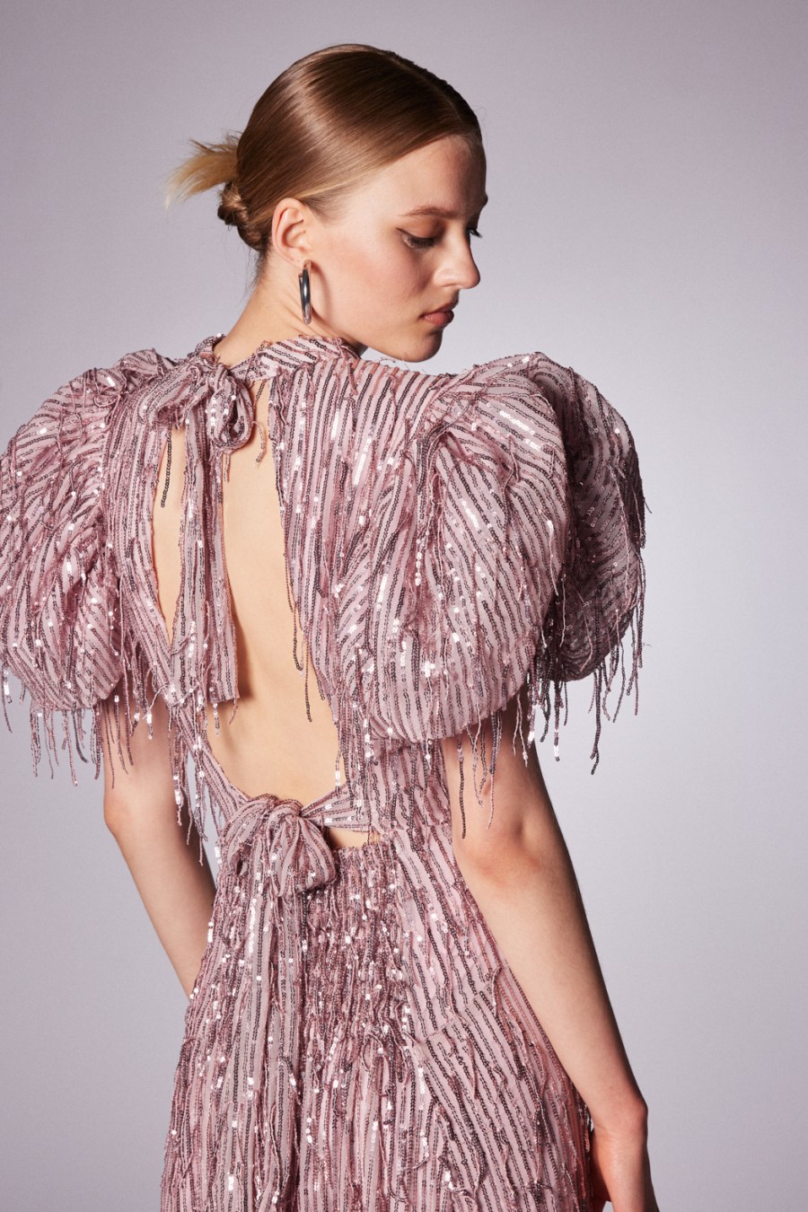 Regular-fit, round neck, short puffed sleeves, all-over sequin-embellishment and fringing, open back panel, fully lined