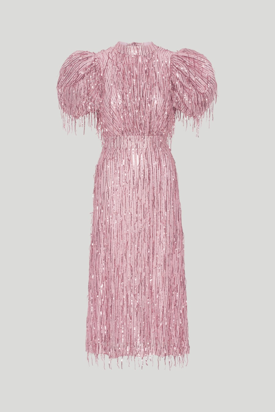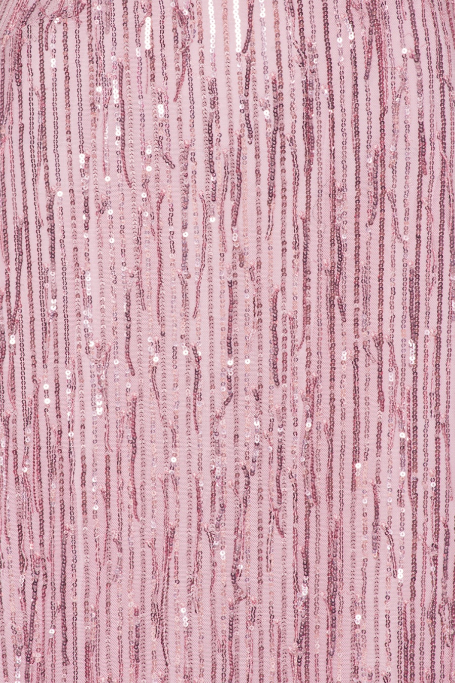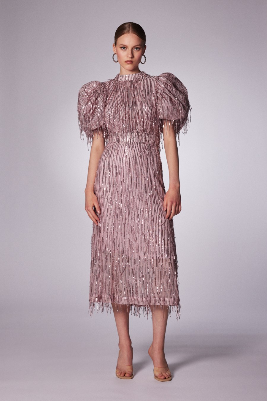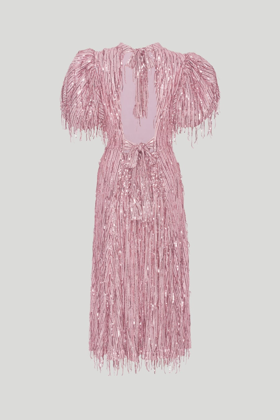 Regular-fit, round neck, short puffed sleeves, all-over sequin-embellishment and fringing, open back panel, fully lined