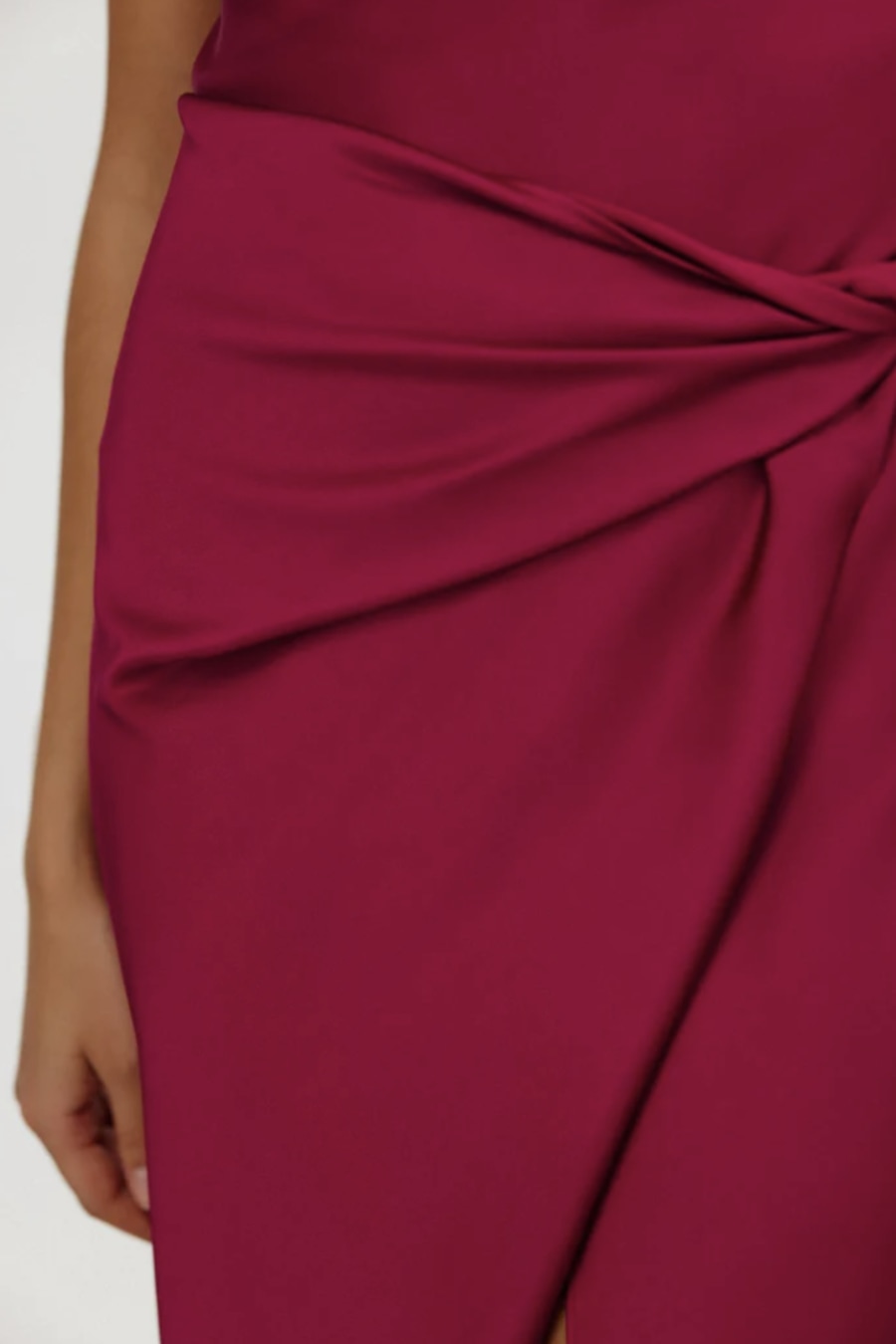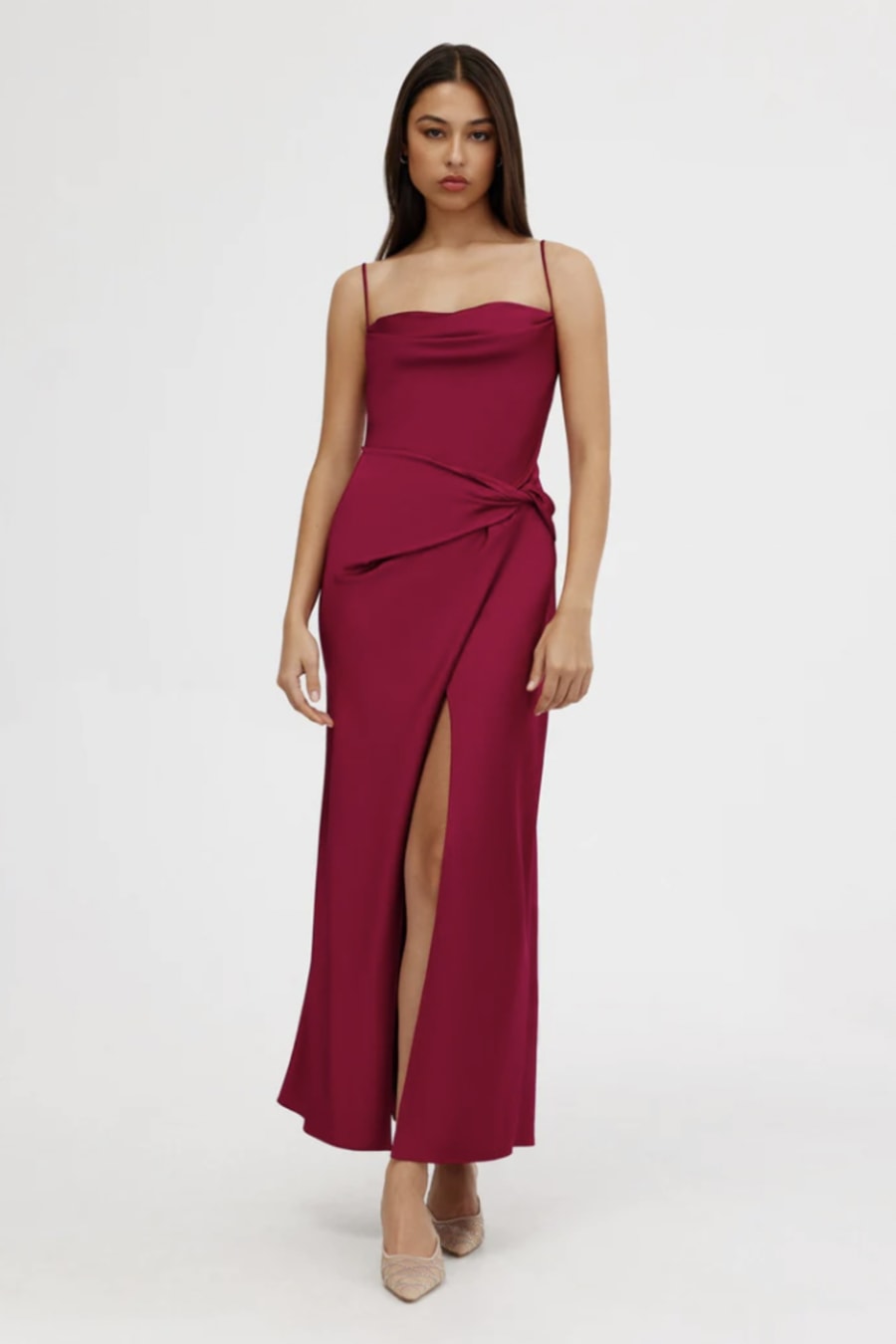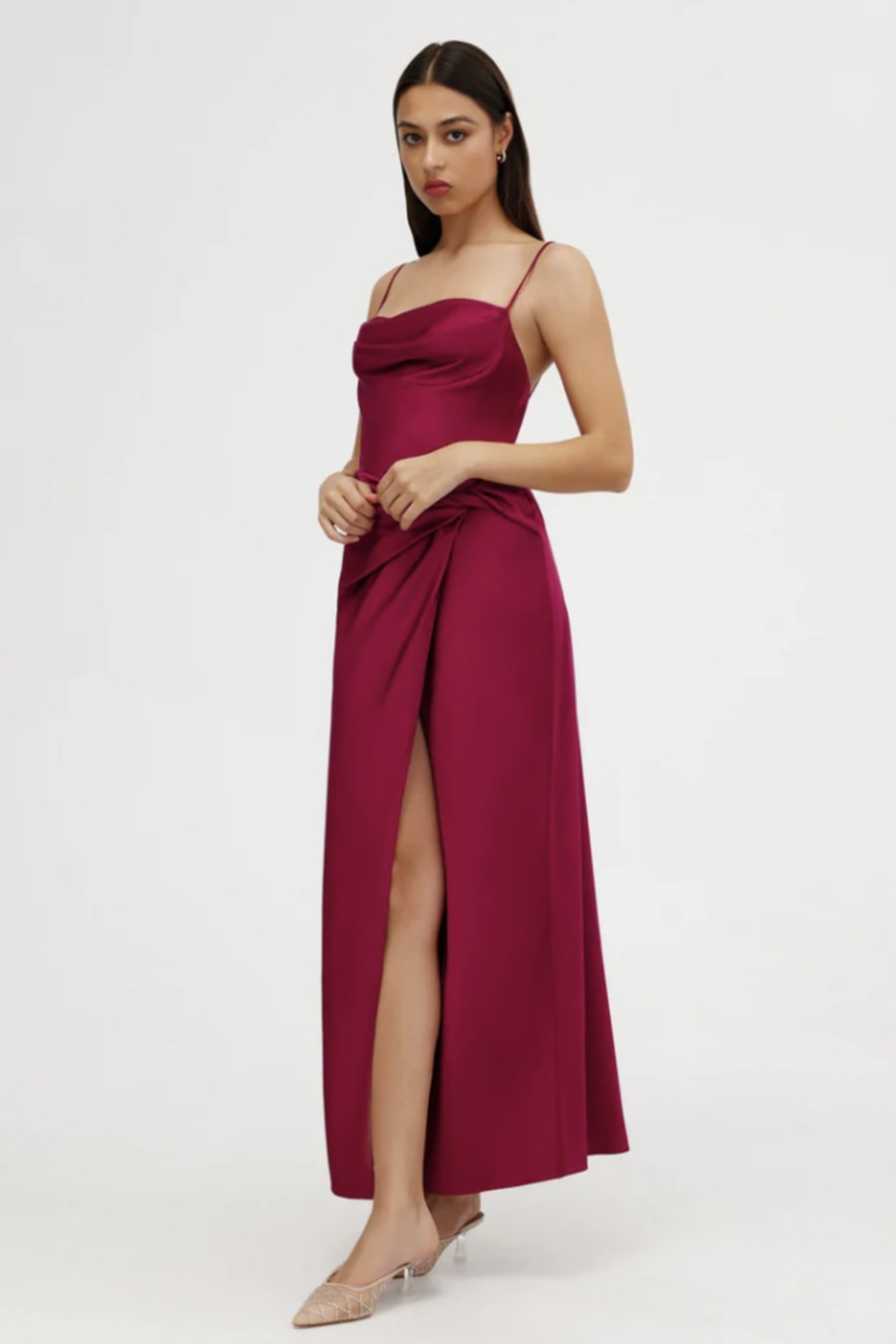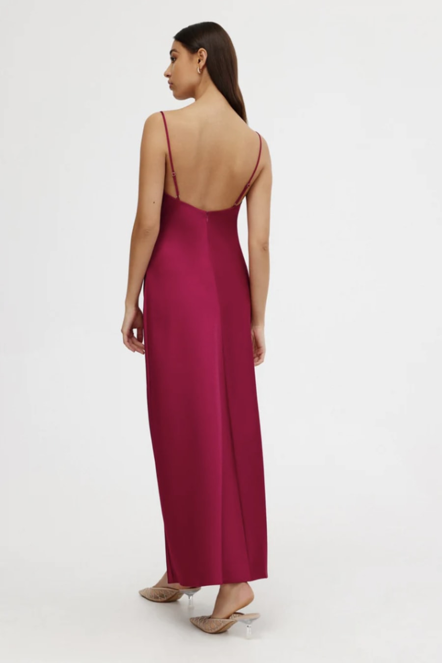An elegant silhouette, designed to move with the wearer. The Esme Maxi Dress in Raspberry is crafted from our soft touch satin fabrication. Subtle cowl neckline, draping detail at the waist, accentuated split and spaghetti straps. A great option for bridesmaids.