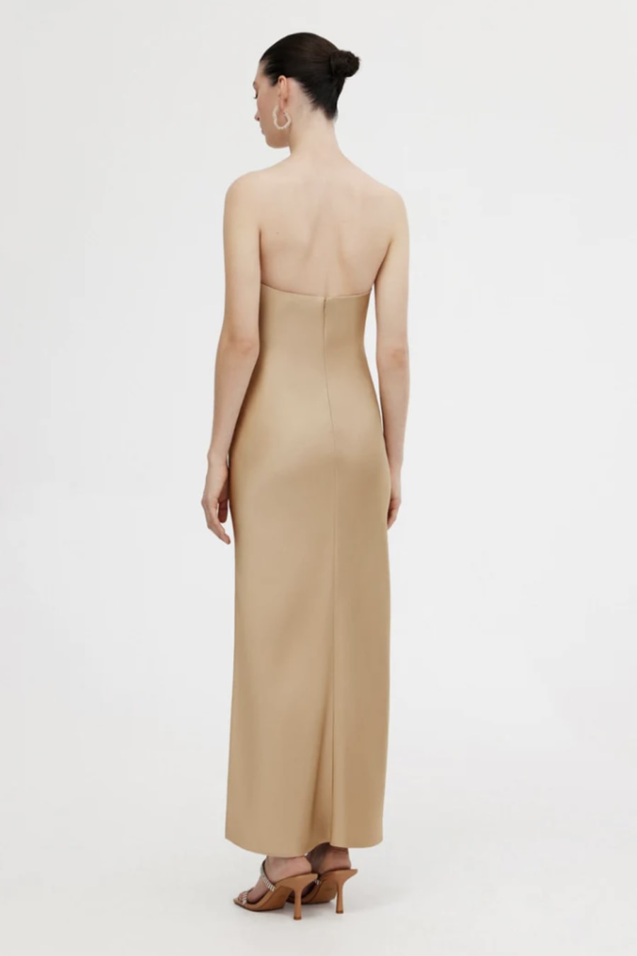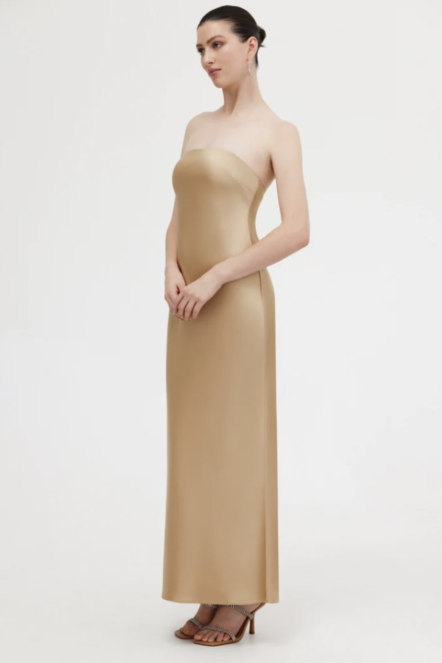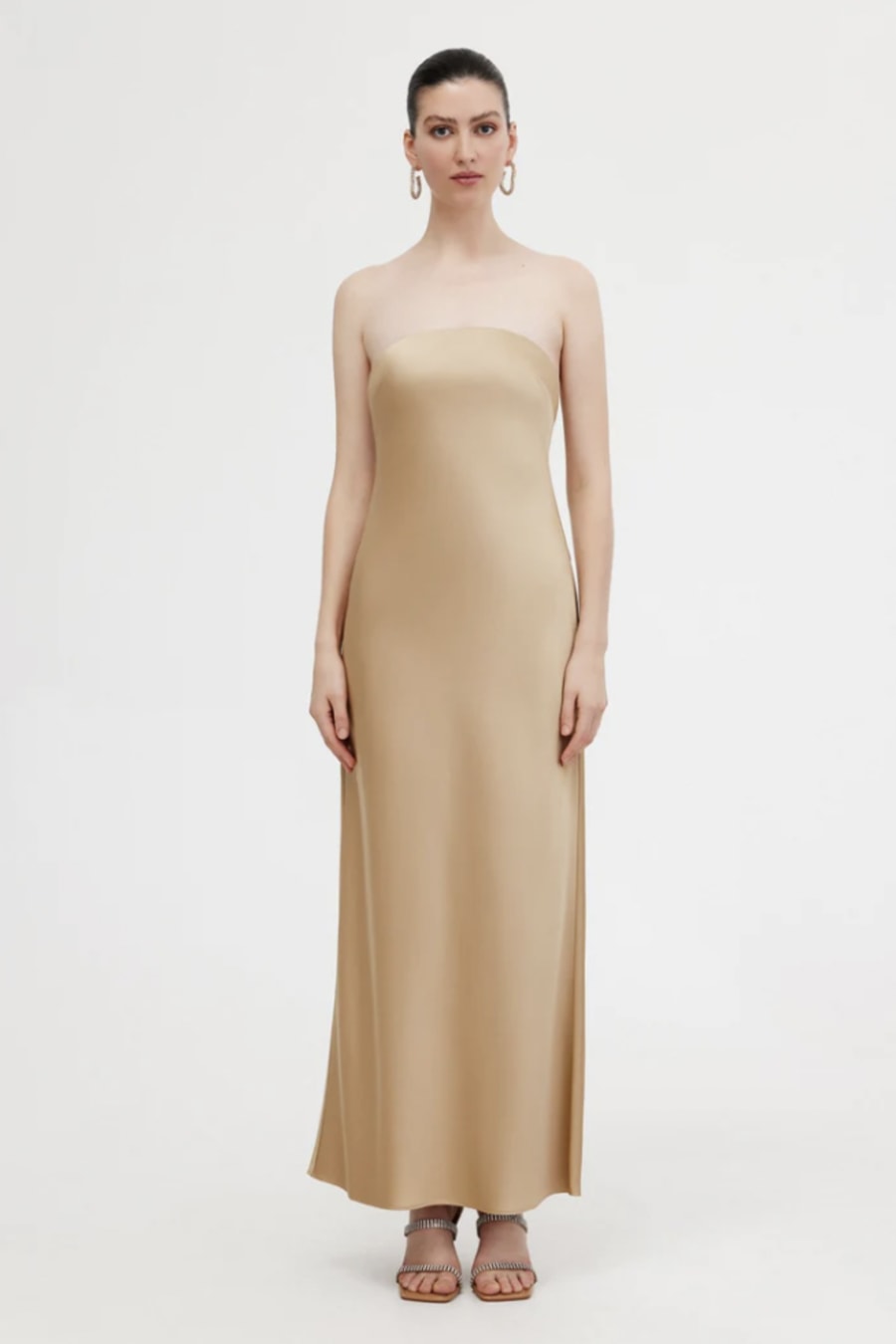 Crafted with the event season in mind, the Esme Strapless Dress in Sand is an elegant silhouette. Crafted from our luxurious satin fabrication, this strapless silhouette is designed to flatter the feminine form. Pair back with a simple heel for a complete look. A great option for bridesmaids.