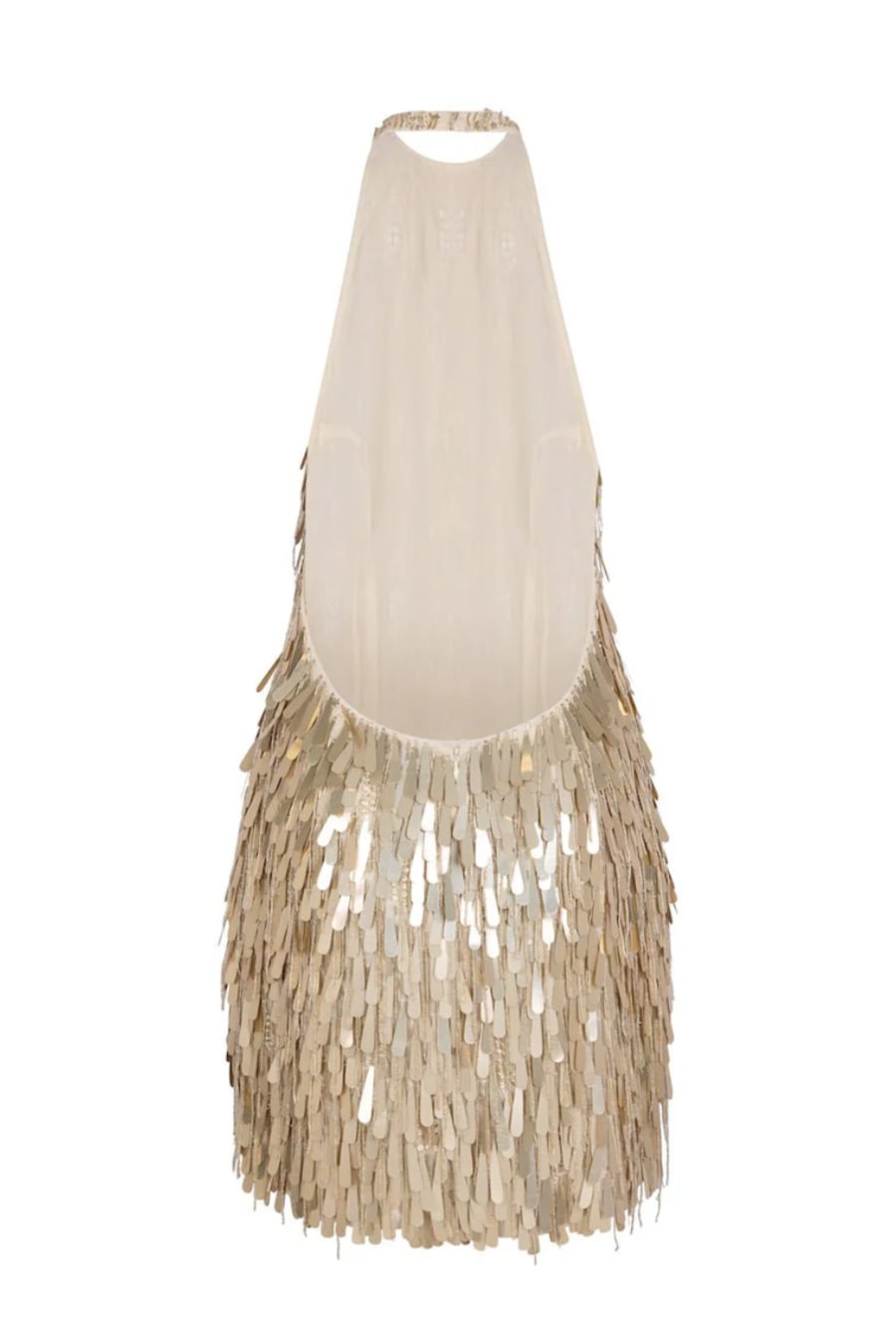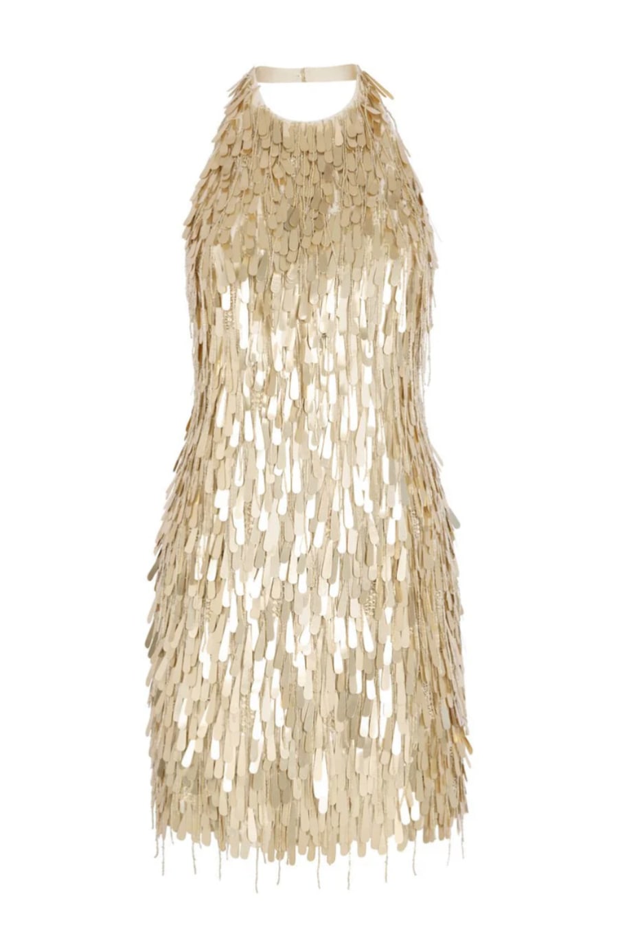 Fleur is hand embellished with countless champagne gold beads and sequins that sparkle in the light. Drenched in tiny star sequins, clusters of dangling teardrop shape paillettes, and strings of tiny silver beads, it shimmers as you move. This mini backless halter dress promises to sparkle under the disco lights.