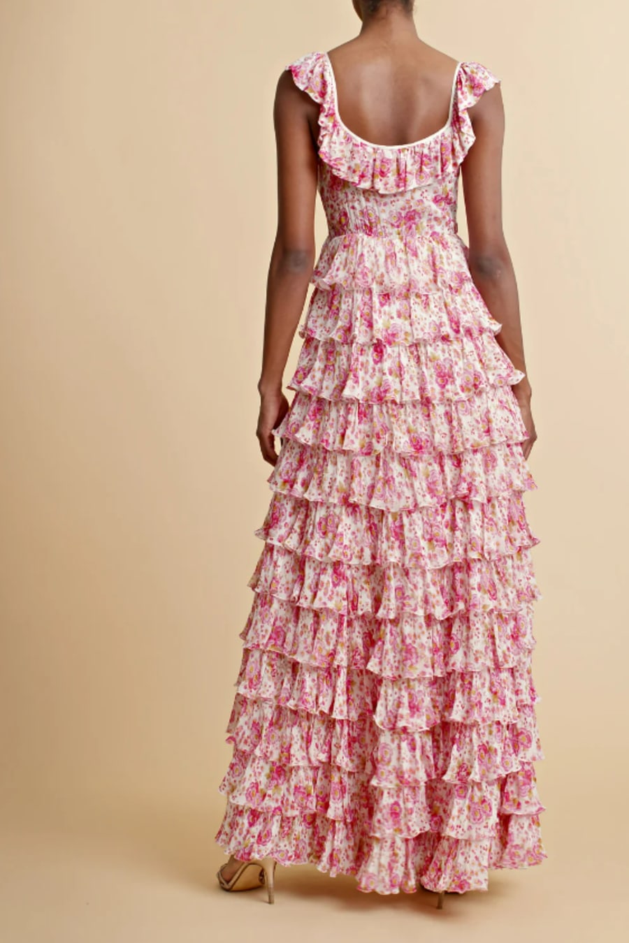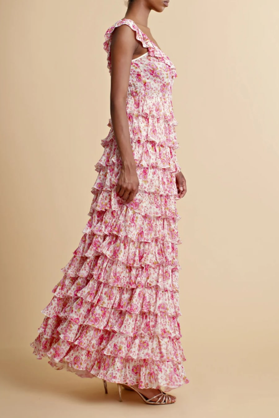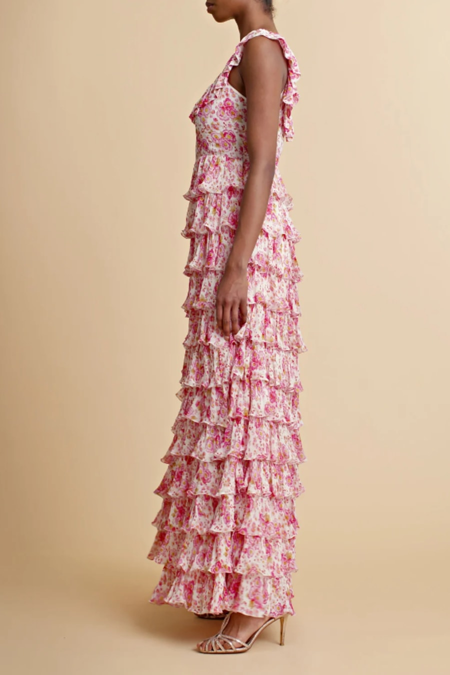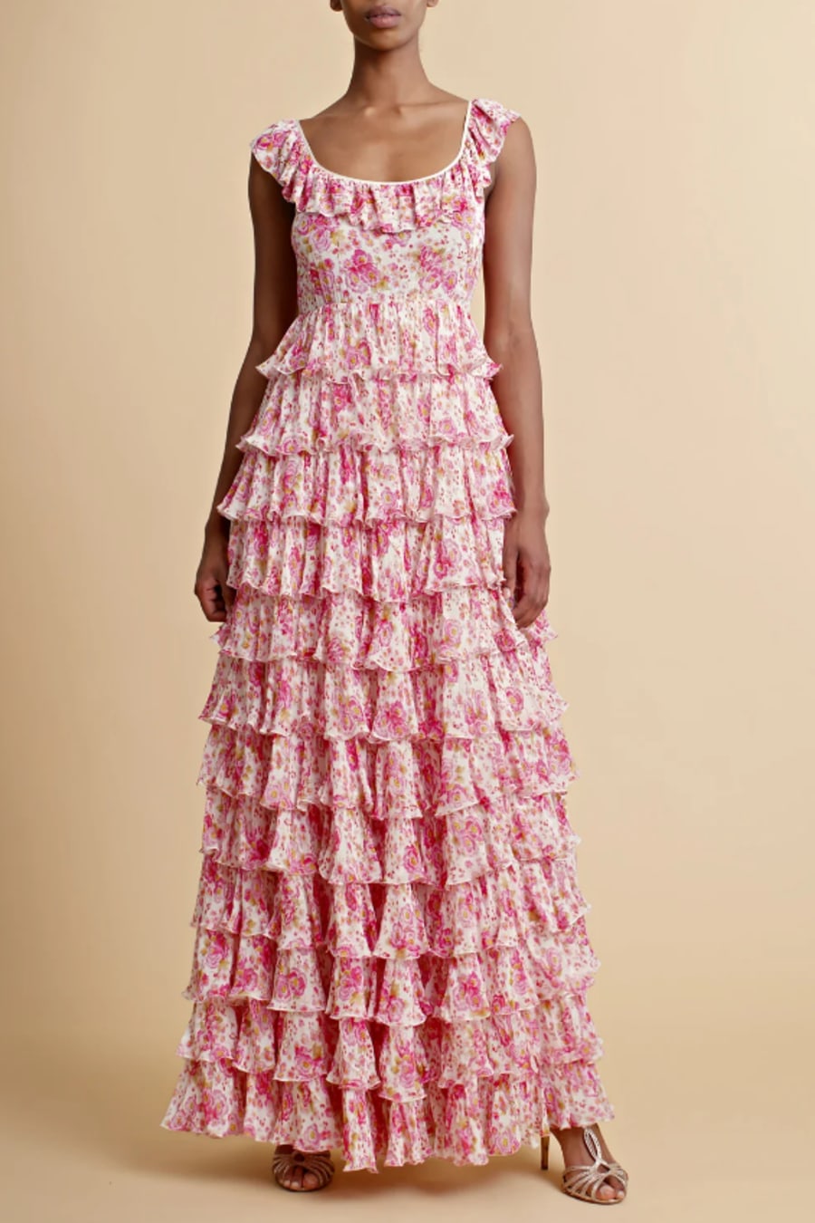 The Georgette Ruffle Gown is cut in our very delicate FSC certified viscose georgette quality. It has a maxi length, fitted top and big, voluminous skirt made of ruffles. The dress has straps over the shoulders with ruffle details, and a round neckline.