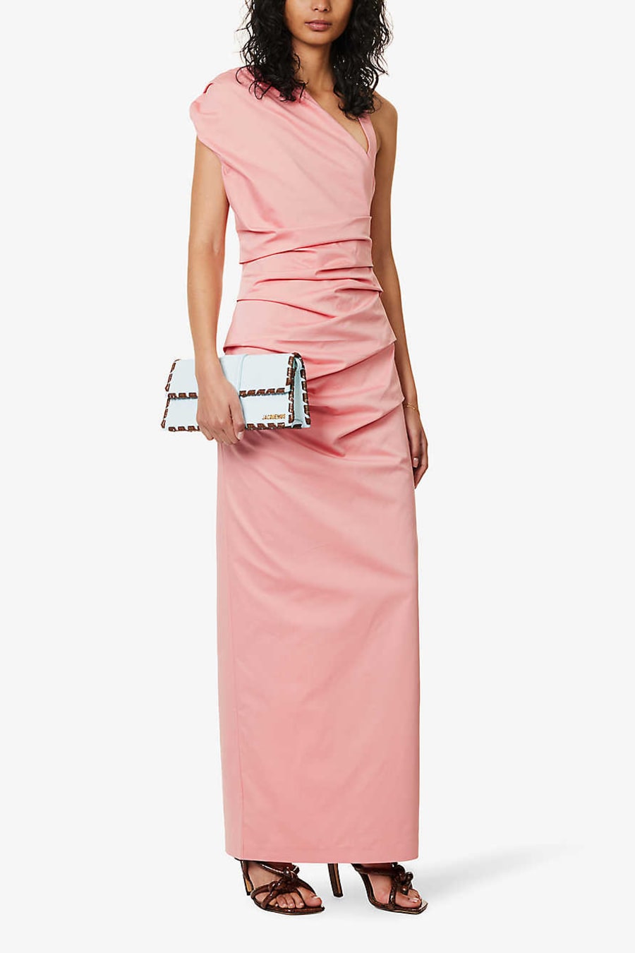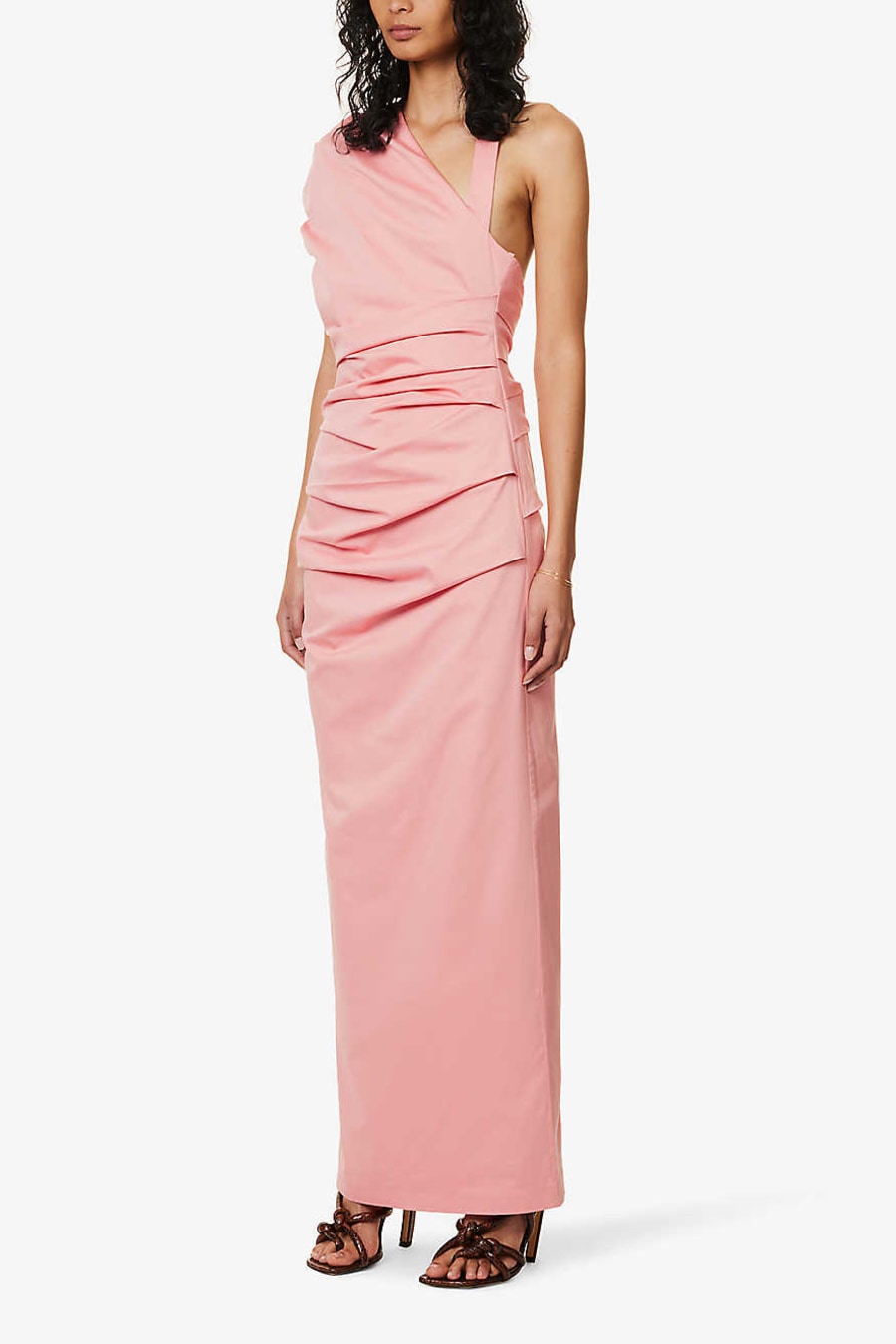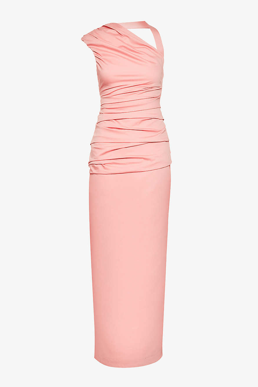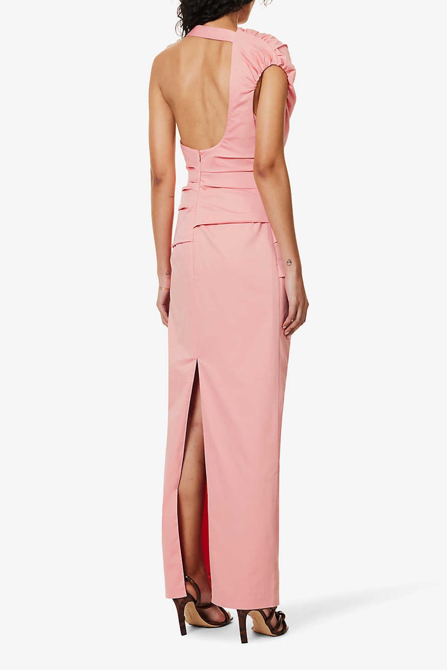 Regular fit, asymmetric neckline, open back, structured gathering at waist, split at back, lined