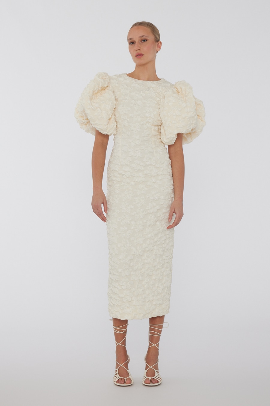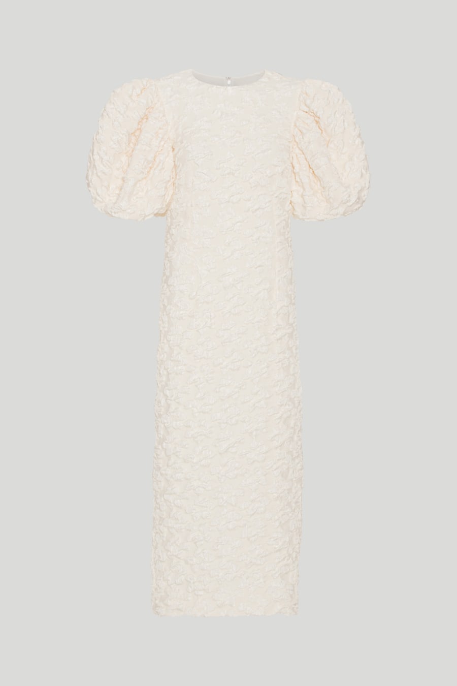 ROTATE WEDDING. THE JACQUARD MIDI PUFFY DRESS EGRET HAS A LONG AND TIGHT-FITTED SILHOUETTE WITH PUFFY SLEEVES. IT HAS A ROUND NECK AND CLOSES AT THE BACK WITH AN INVISIBLE ZIPPER. THE DRESS IS MADE IN A BEAUTIFUL JACQUARD FABRIC, WHICH GIVES THE DRESS AND ELEGANT LOOK.