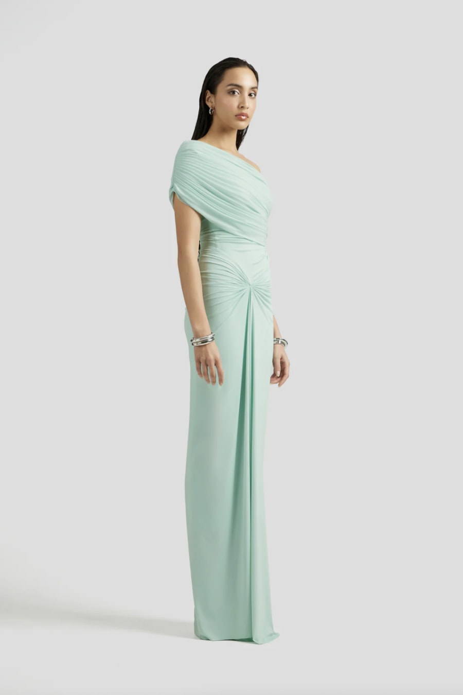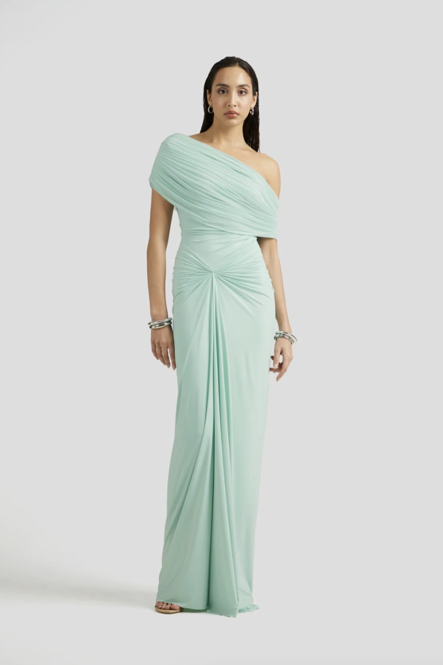 The design seamlessly blends a one shoulder top with a modern aesthetic, striking the perfect balance between classic and contemporary. The gathered center bottom artfully accentuates the waist, creating a flattering and dynamic silhouette.