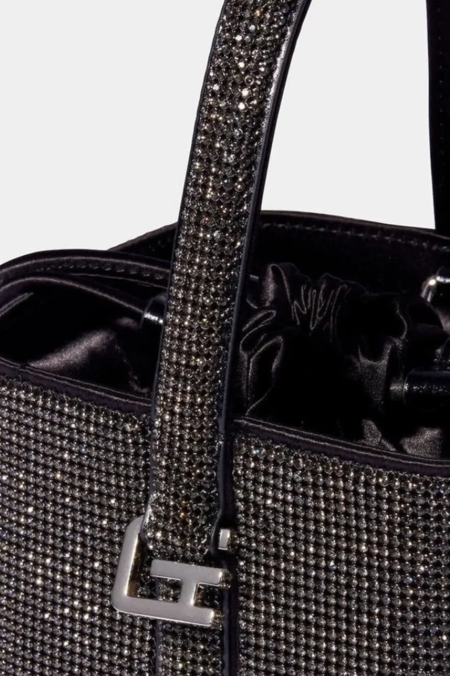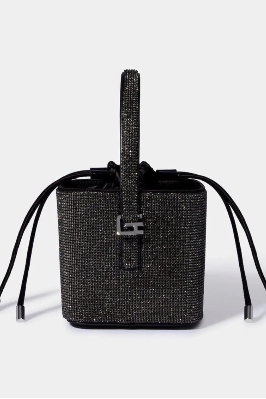 Meticulously designed, LE CAREE seamlessly blends elegance and usability. Its rhinestone handle adds celestial beauty, complementing the detachable crossbody chain strap for a seamless transition from handheld to hands-free. Crafted from rhinestones, satin, and recycled vegan PU, LE CAREE's drawcord closure ensures security with allure.