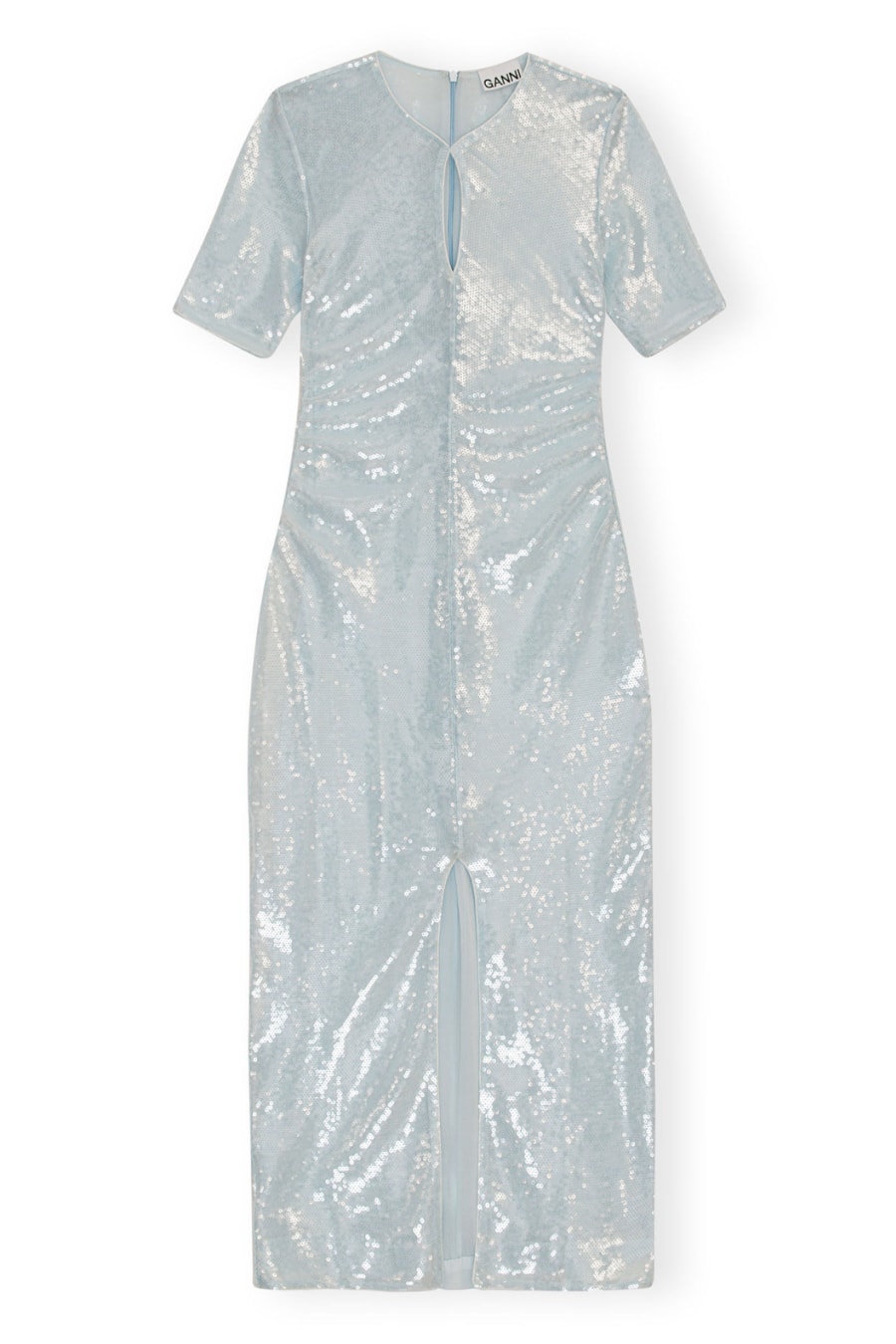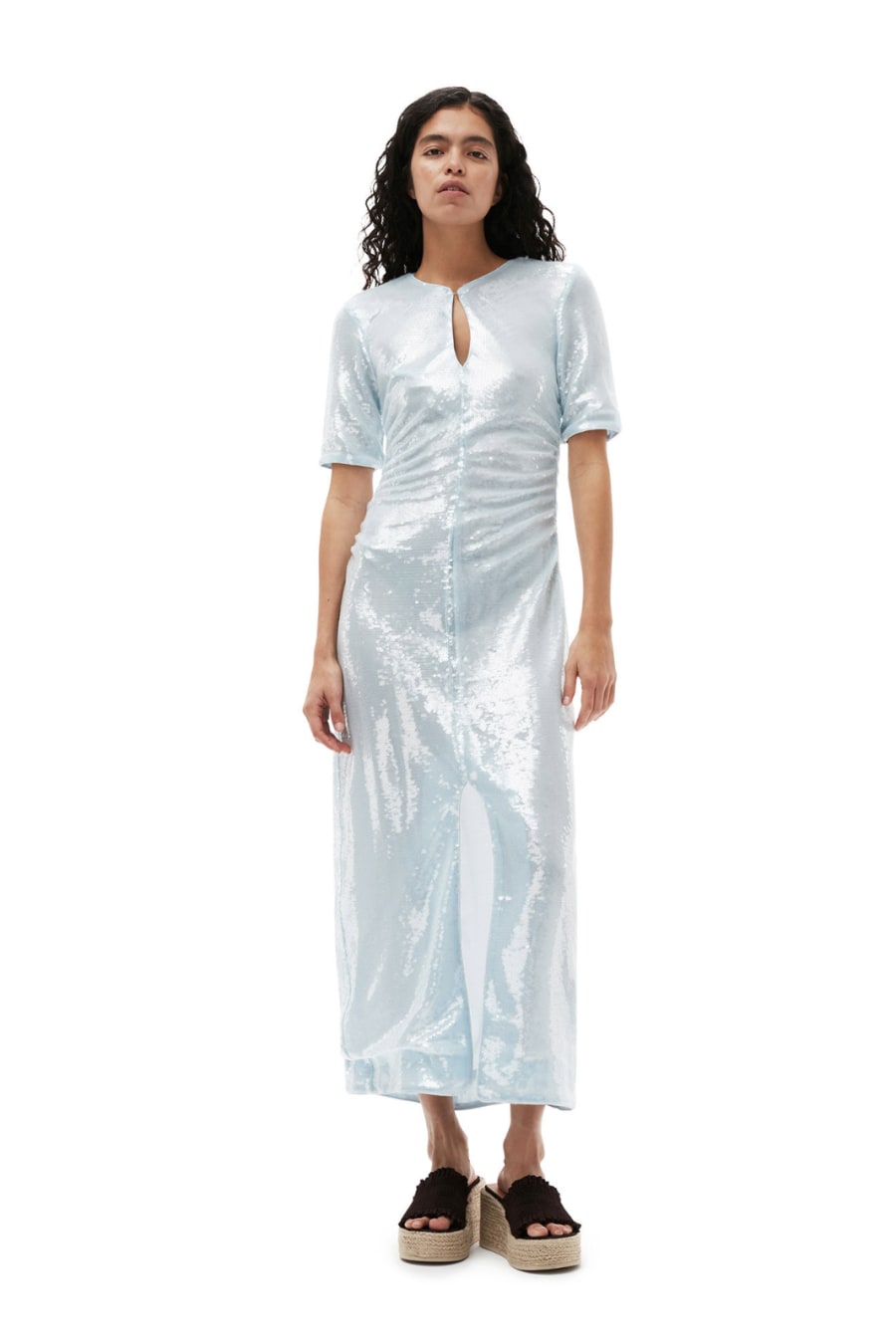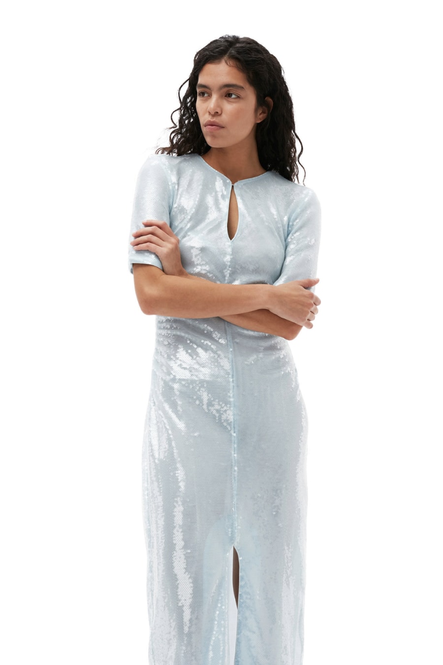 This Light Sequins Maxi Dress is made from recycled polyester. The dress is designed for a slim fit and features a round neckline, a cut-out detail, elbow-length sleeves, sequins, a zip closure at the back and a high slit at the front.