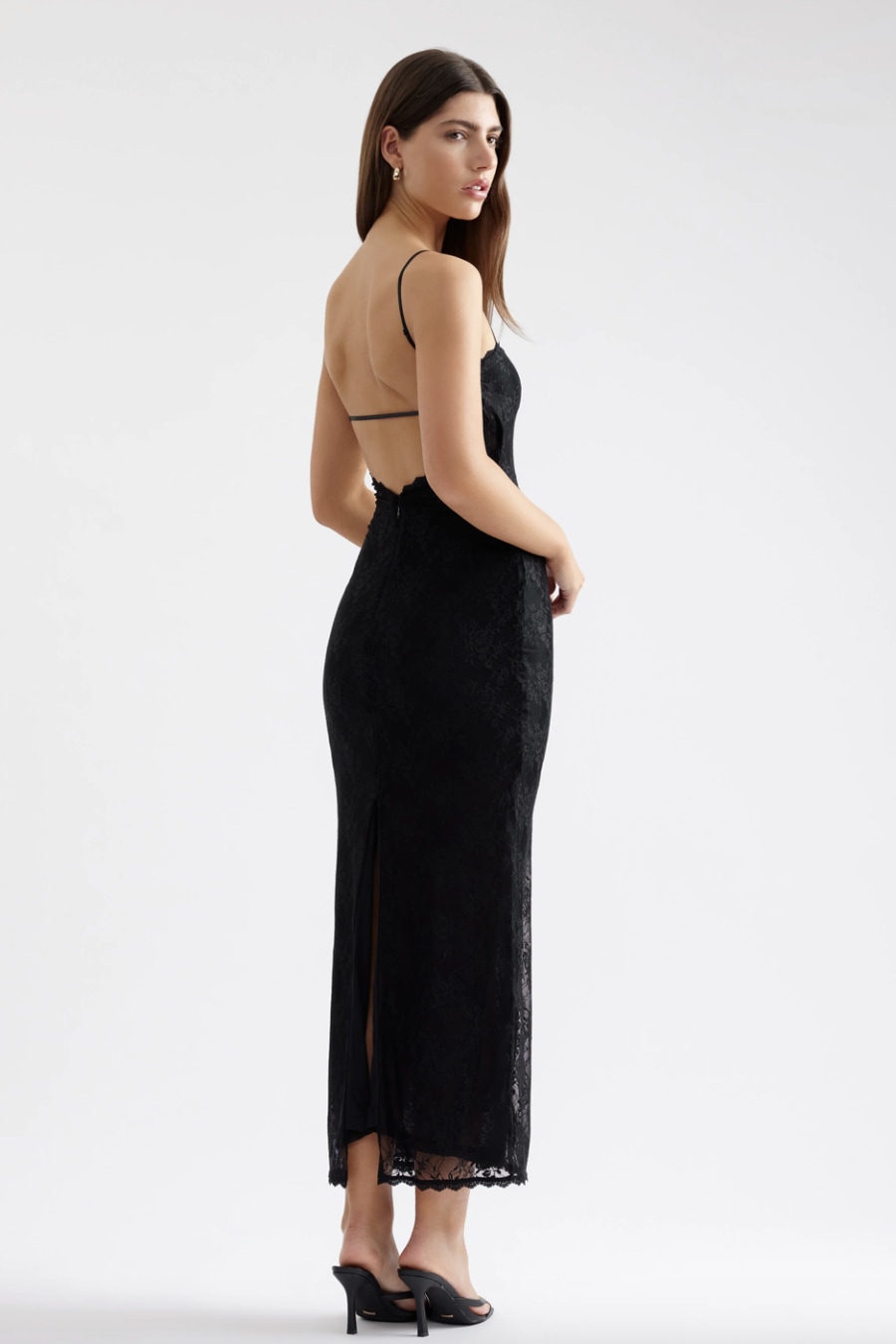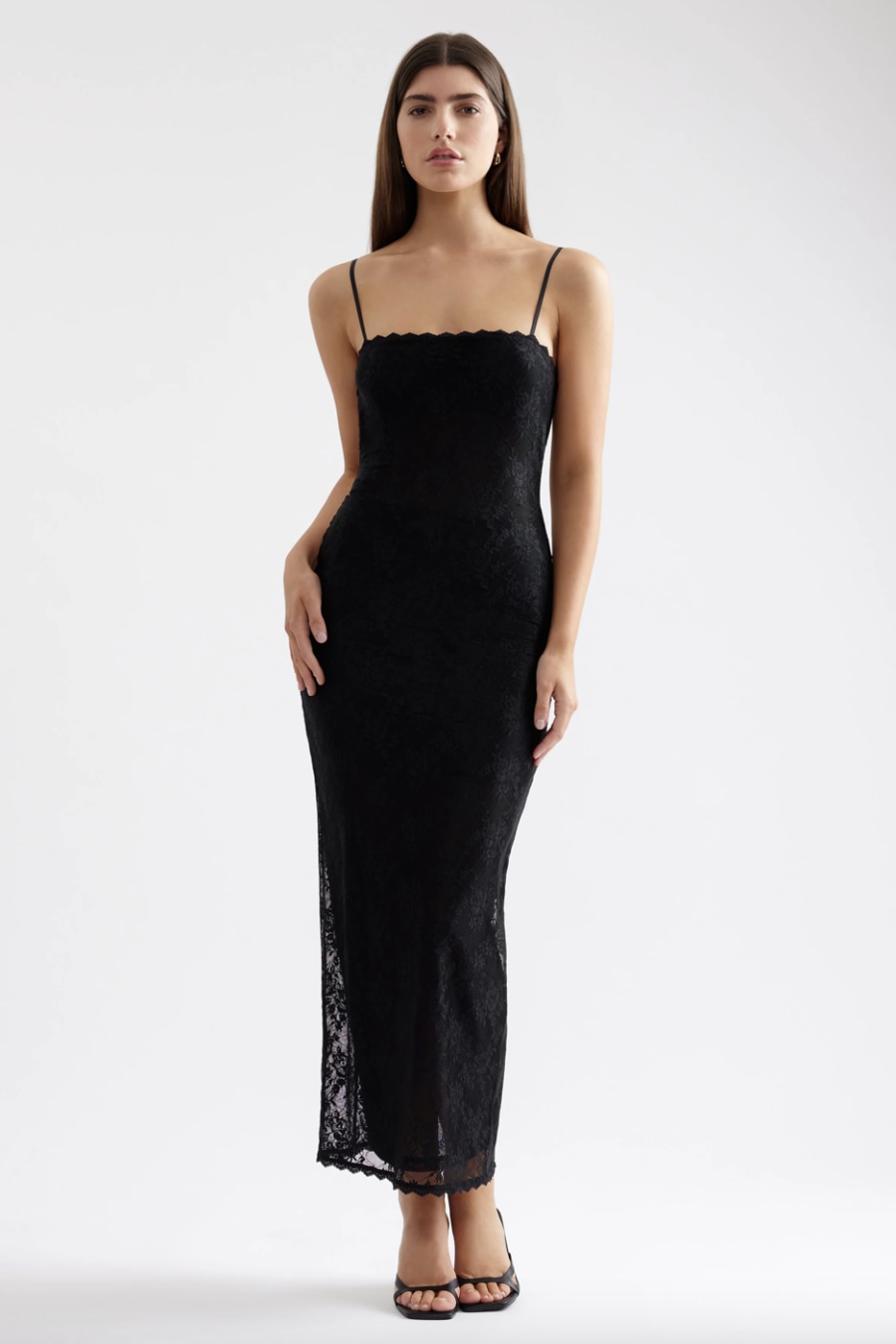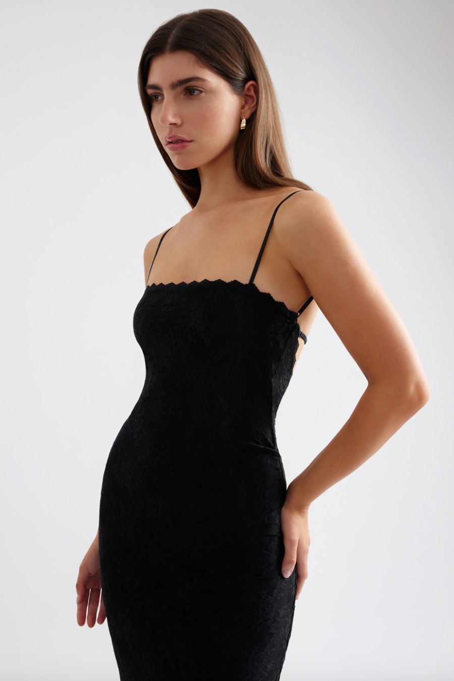 The Liza Dress is effortlessly elegant, perfect for any occasion. Crafted from stunning lace with scalloped trim, it falls to an ankle length for timeless appeal. An open back with an adjustable elastic strap adds a touch of allure while ensuring a comfortable, secure fit.