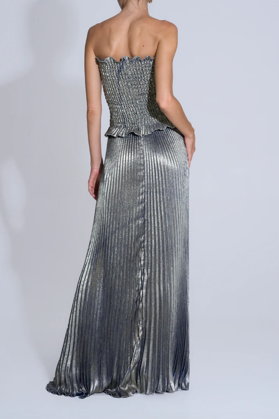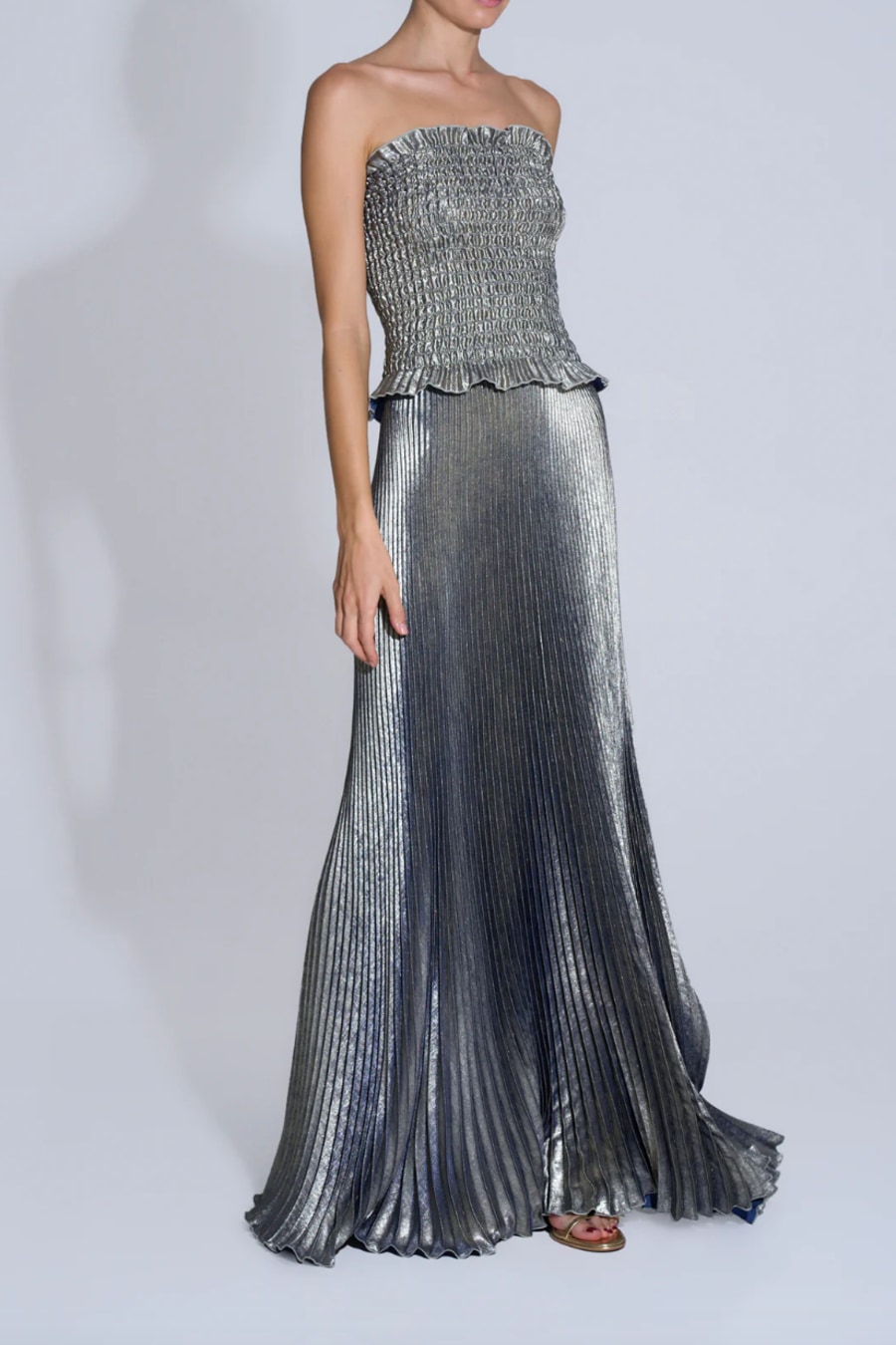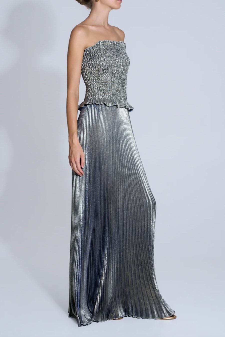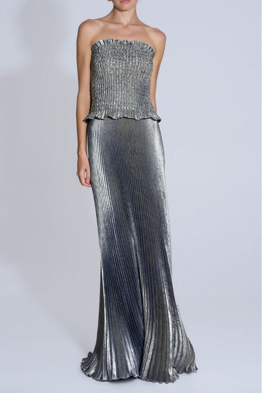 The Maya Gown is a stunning strapless dress featuring an elasticated ruched bodice that effortlessly flatters the figure. Its elegant design flows into a floor-length skirt adorned with graceful umbrella pleats, creating a sophisticated yet modern silhouette. Perfect for formal events or special occasions, this gown offers both comfort and timeless style.