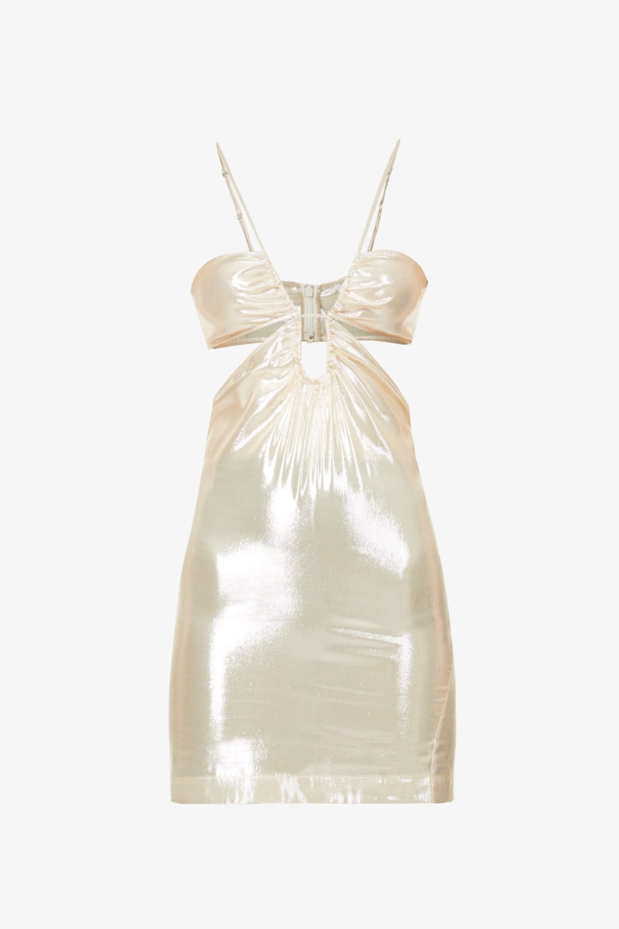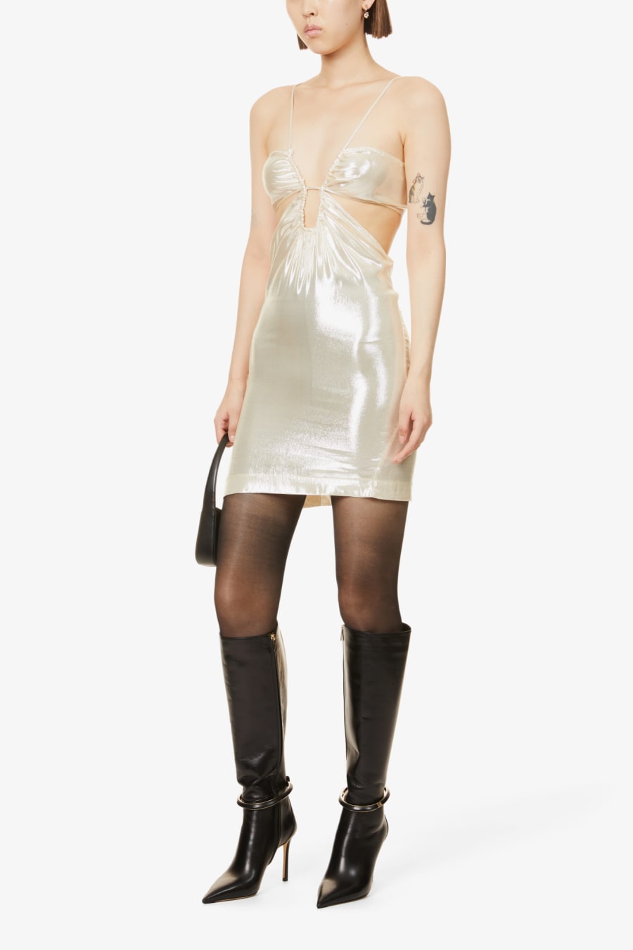 Regular-fit, plunge V-neck, adjustable shoulder straps, all-over metallic weave, cut-out at back, silver-toned hardware
