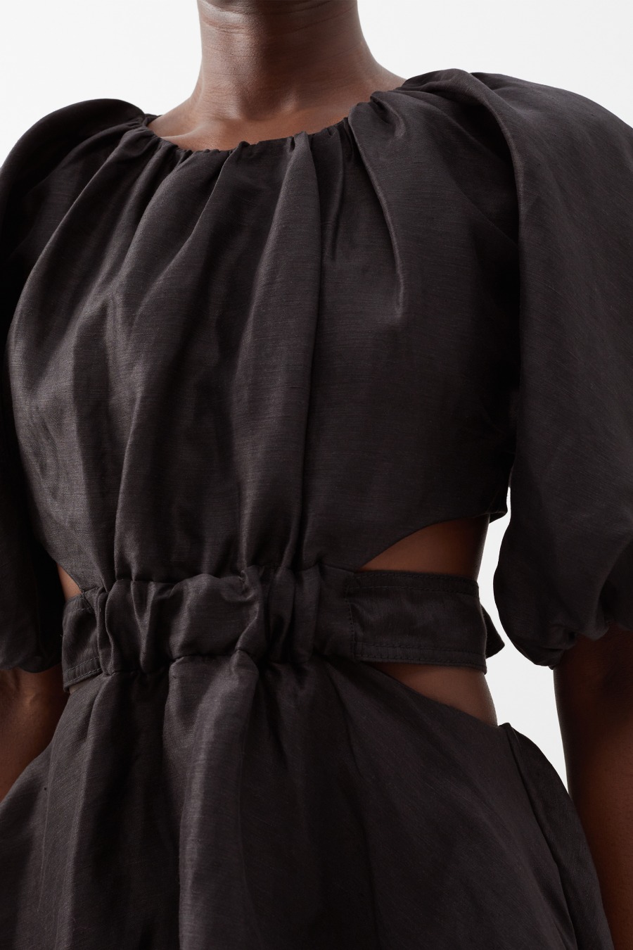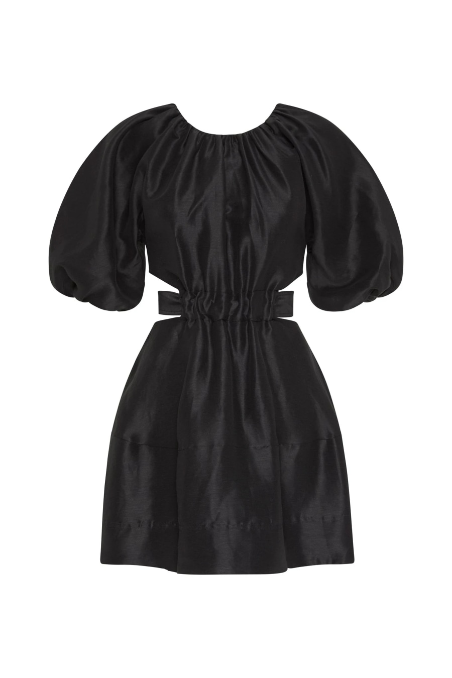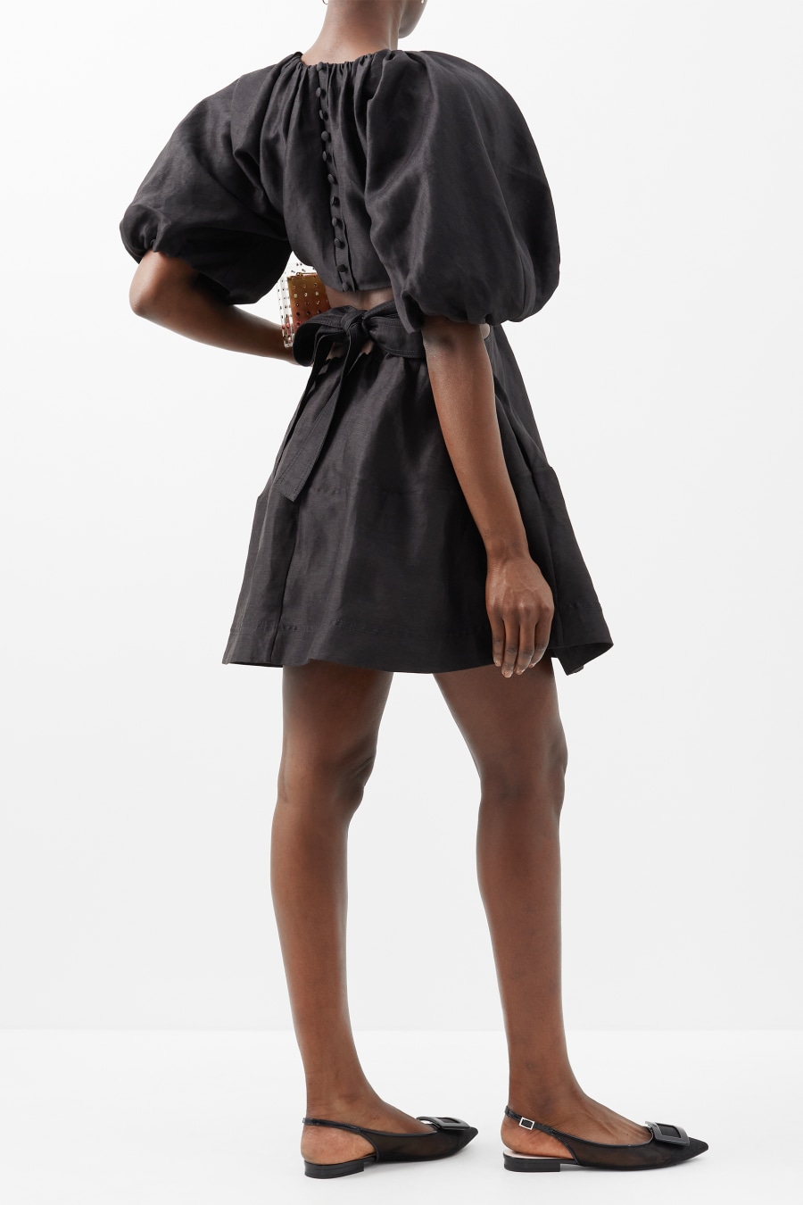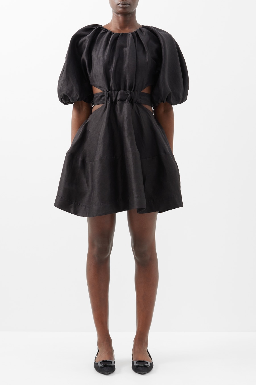 Named after the blooming flower, Aje’s black linen-blend Mimosa dress features waist-defining cutouts balanced with elegant puffed sleeves.