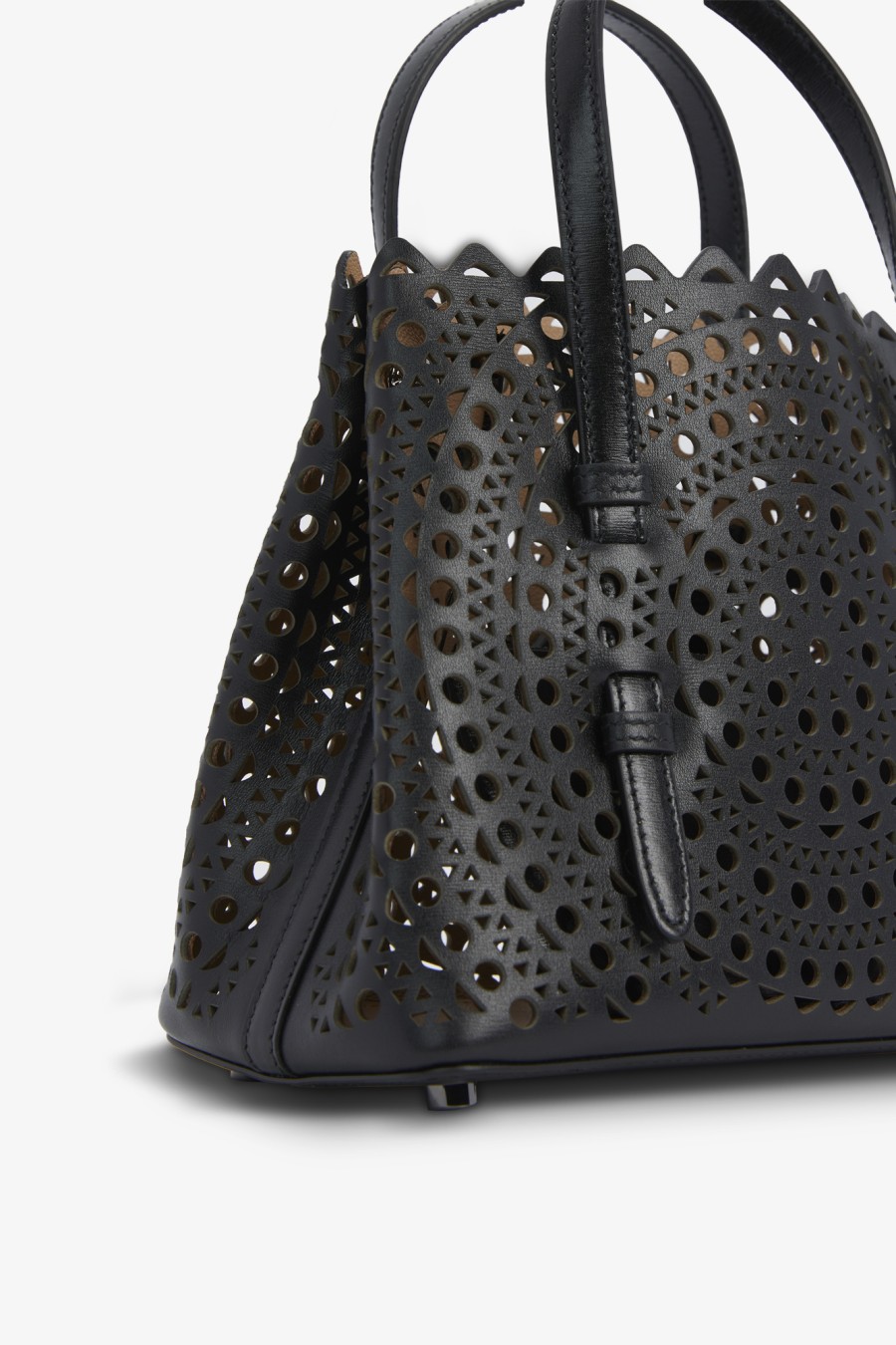 100% calf leather; lining 100% lamb leather. Open top. Double top handles, detachable adjustable strap, button fastening at sides, four protective feet at base, all over cut-outs, scalloped trims, one main compartment, internal zipped pouch.