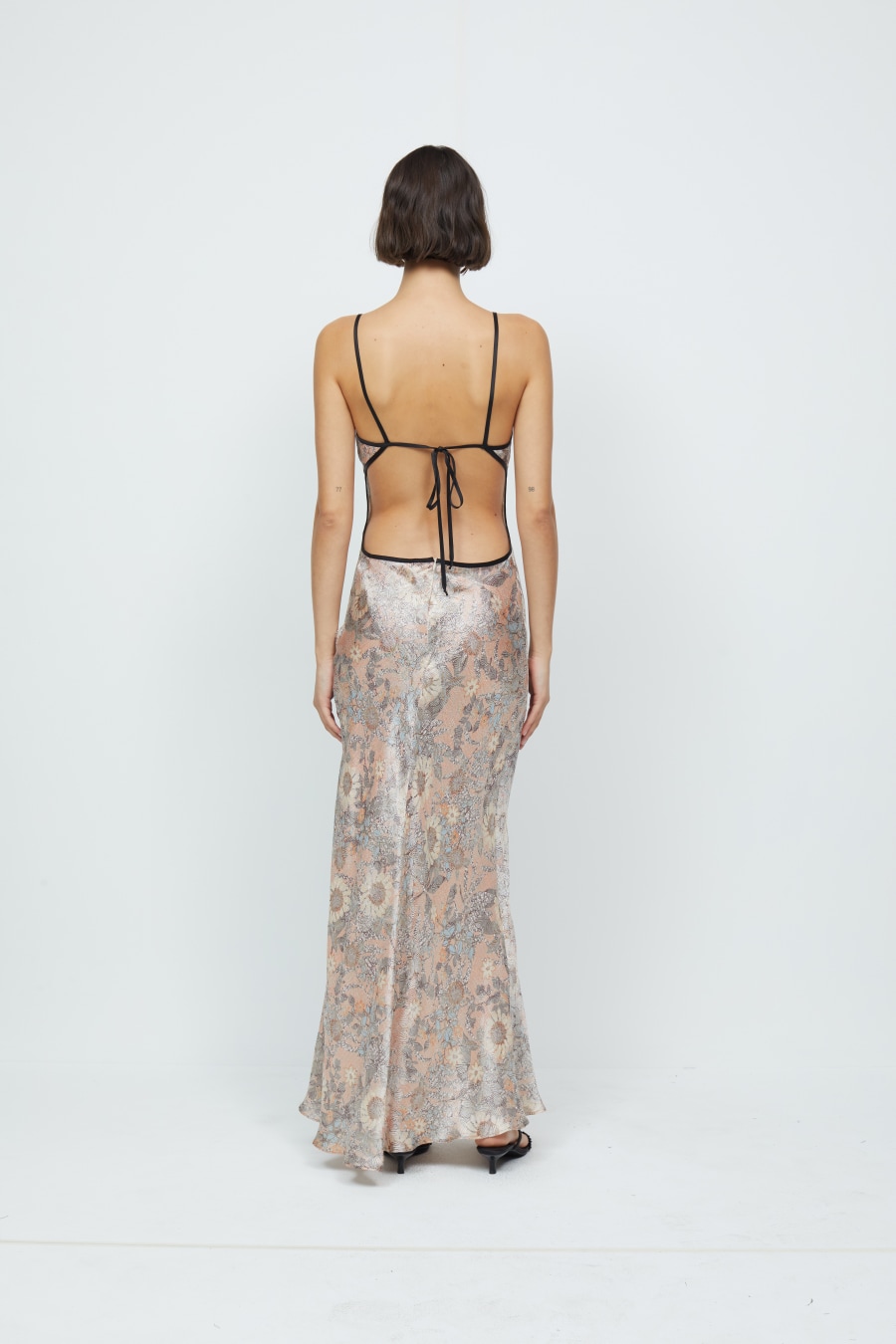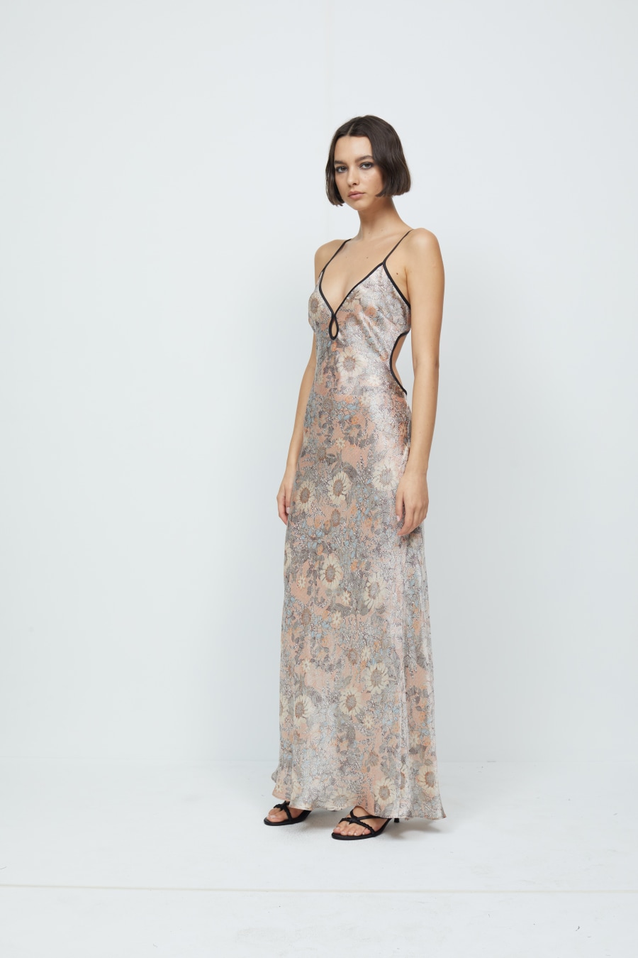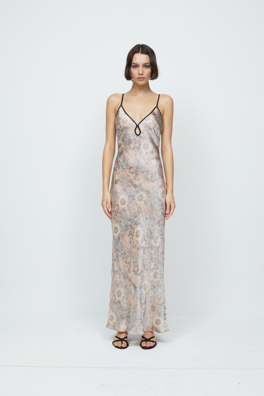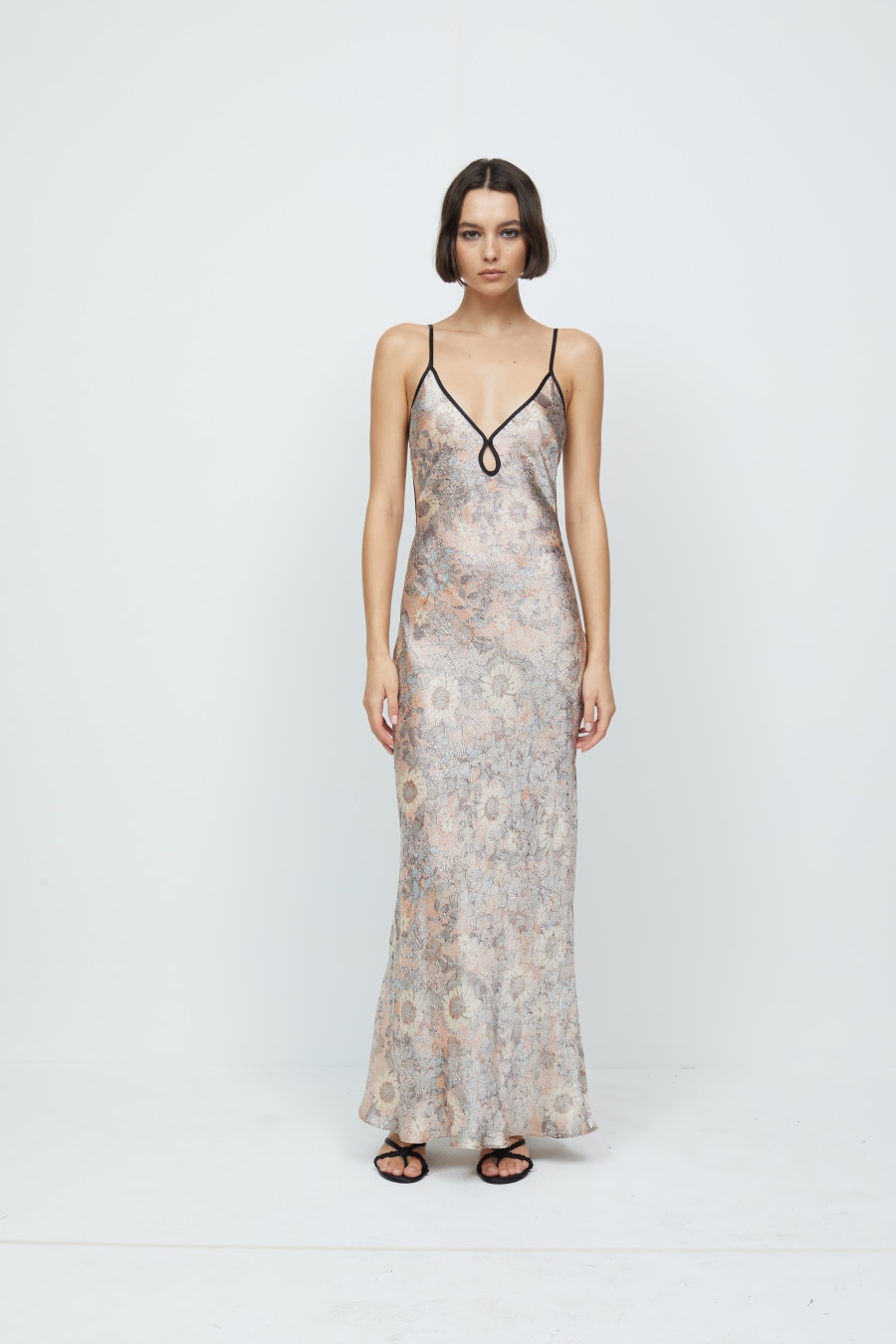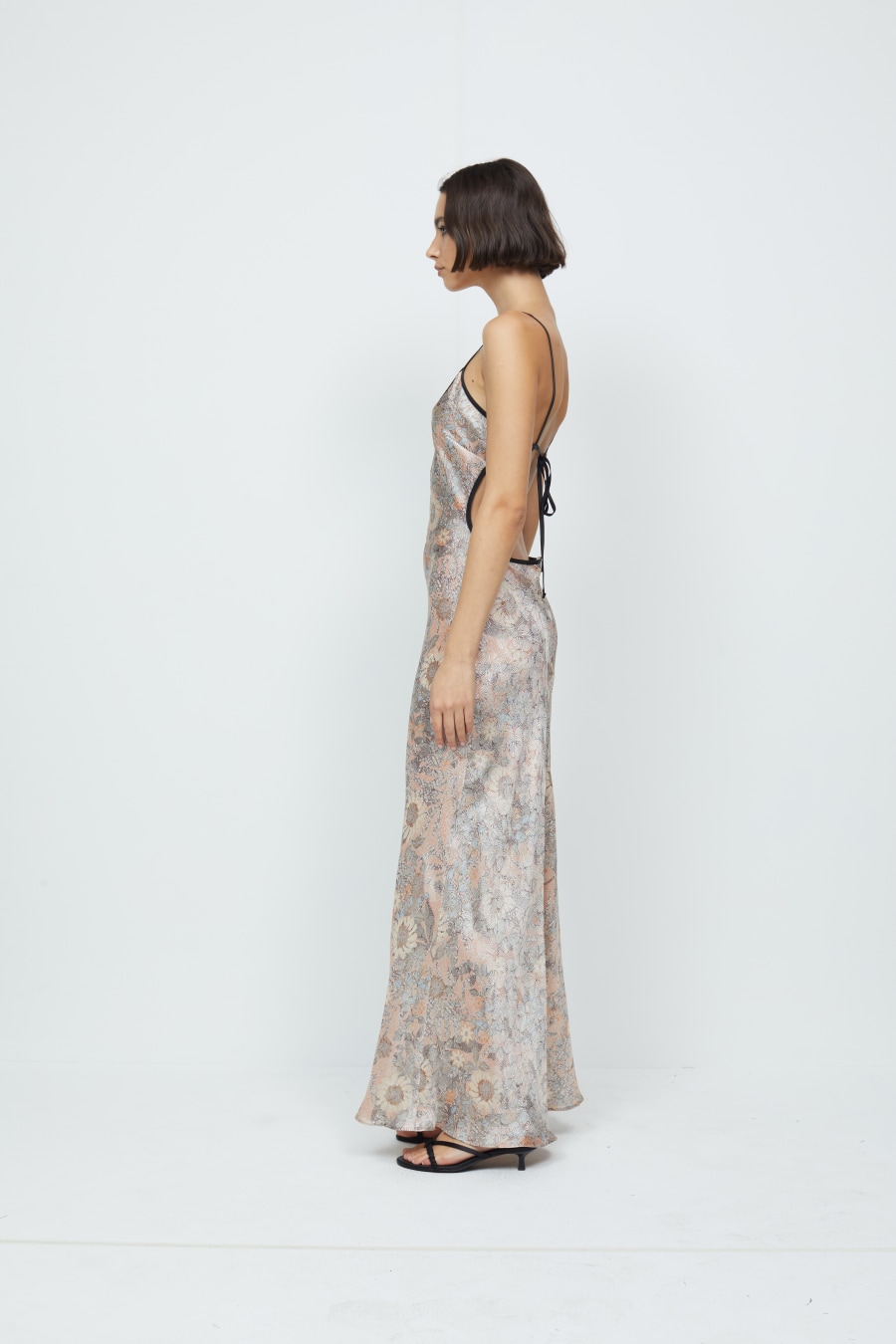 Inspired by a bestselling silhouette, the Nina Keyhole Maxi Dress is a refined eventwear style. The bias-cut dress features contrast binding which carries through to straps and finishes at tie detail, a keyhole cut-out at front, and an open low-cut back. This garment is certified Australian Made.