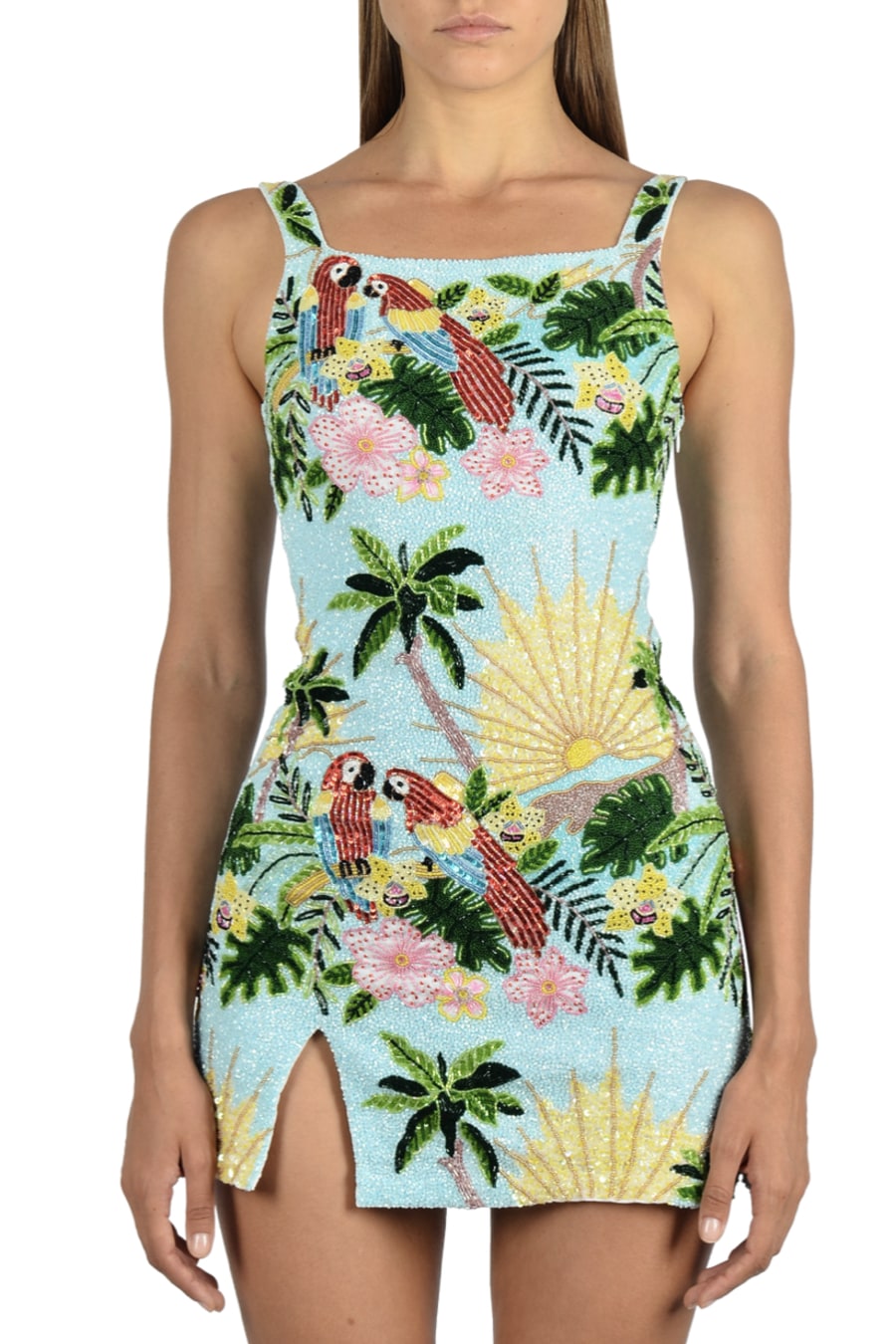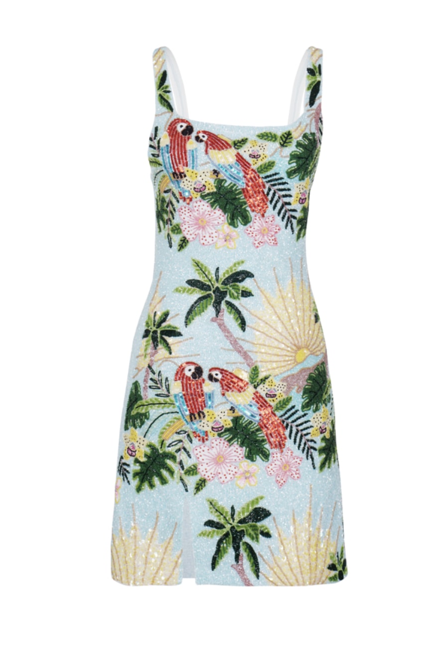 The new Pandora dress is hand beaded, meaning you're always shining in the sun. This dress features tropical motifs, inspired by our founder Hannah's new home in Bali.