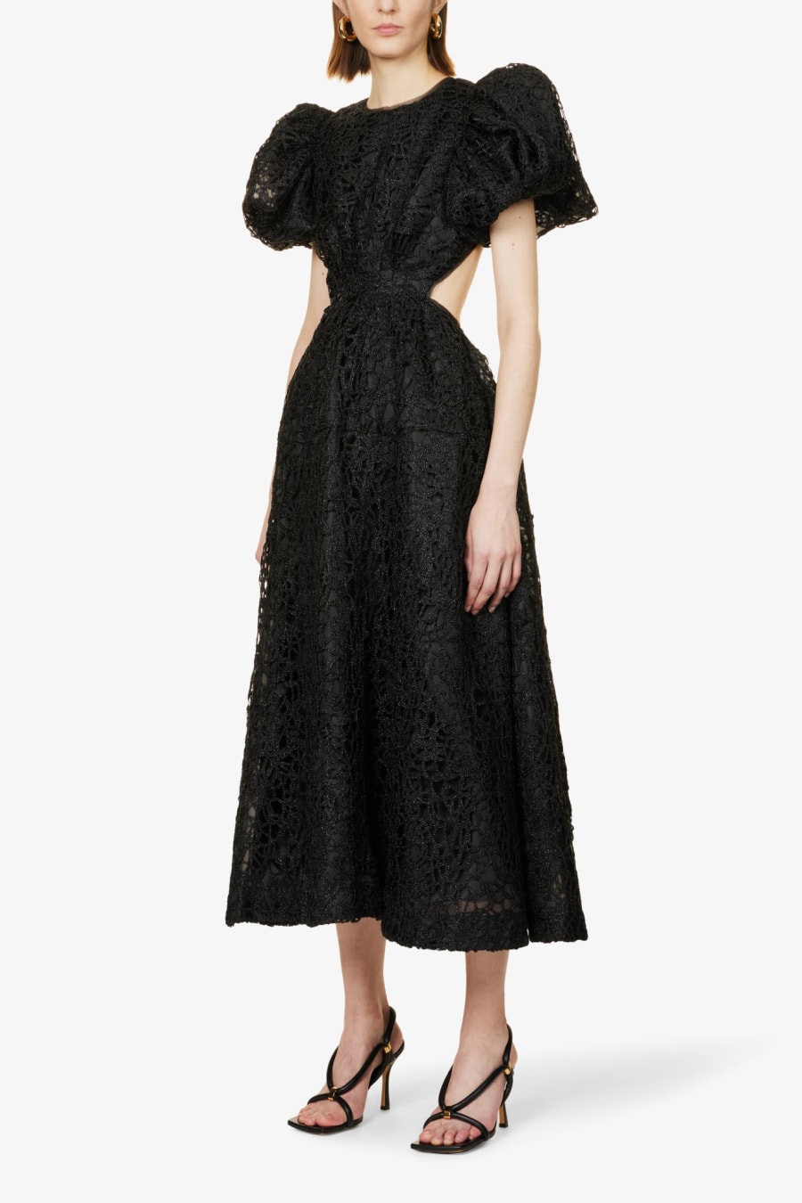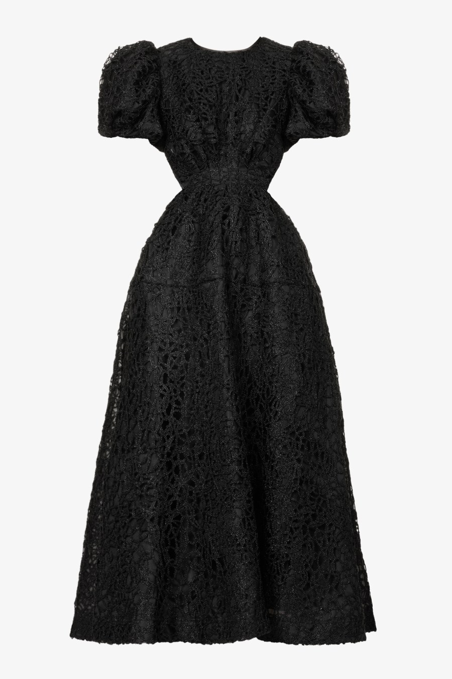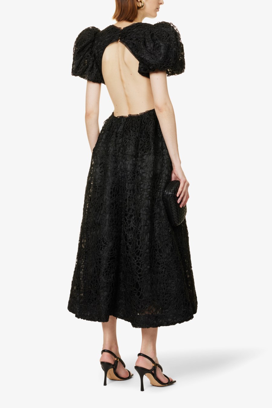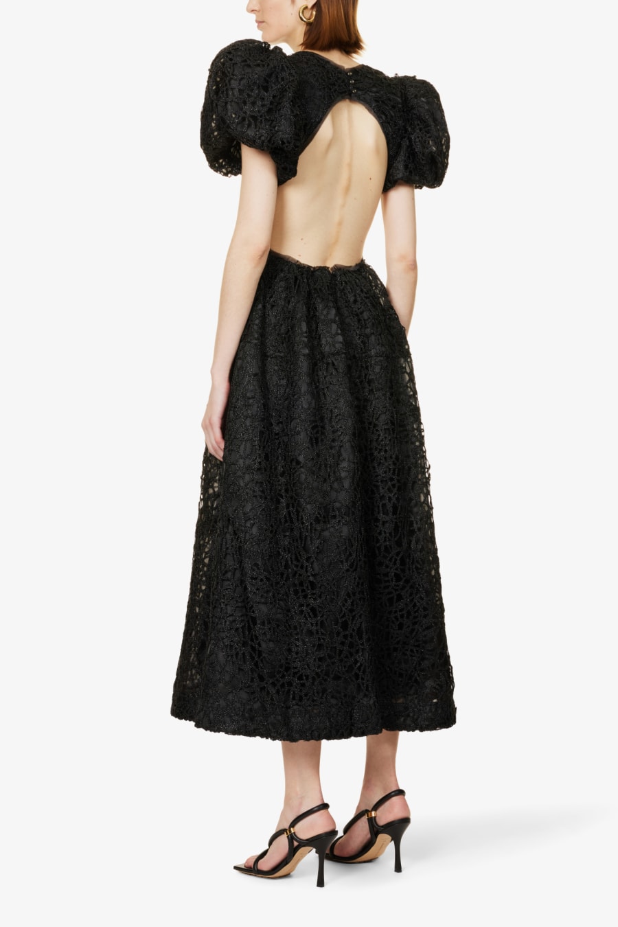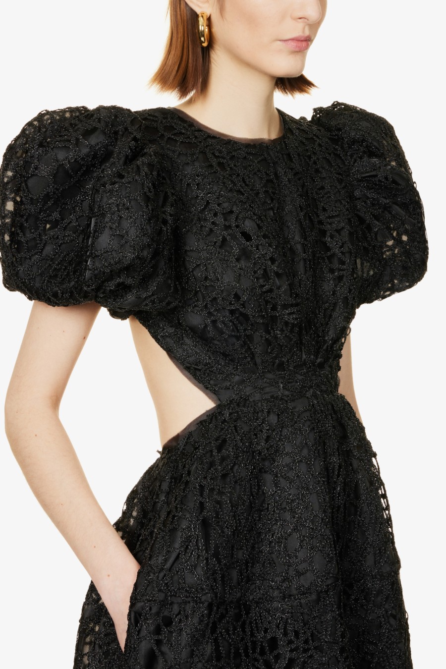 Regular fit, round neckline, short puff sleeves, open back, all-over embroidered overlay, flared hem