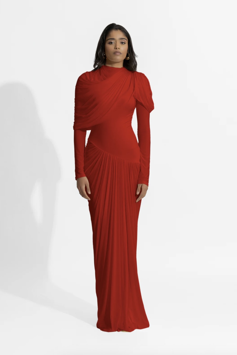 This elegant gown features a striking asymmetric drop waist and a beautifully pleated skirt that adds movement and grace. Drapes cascade elegantly from the shoulders, falling over the arms in an enchanting manner. The gown’s design combines sophistication with a touch of whimsy, creating a look that is both refined and captivating.
