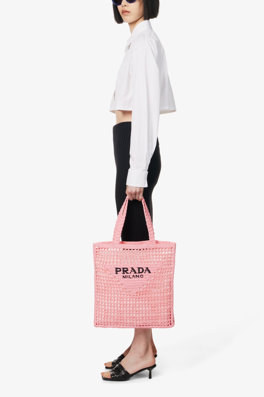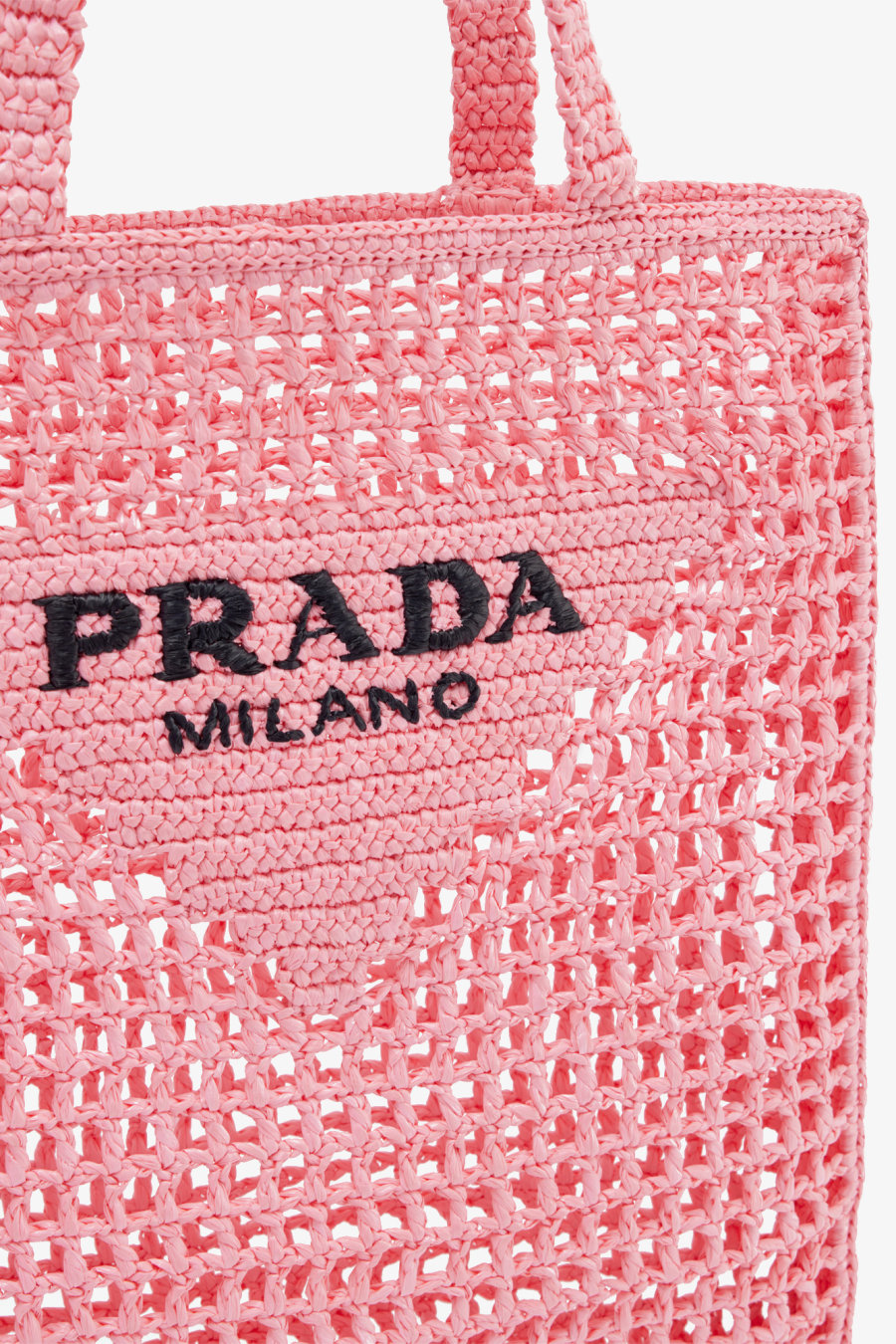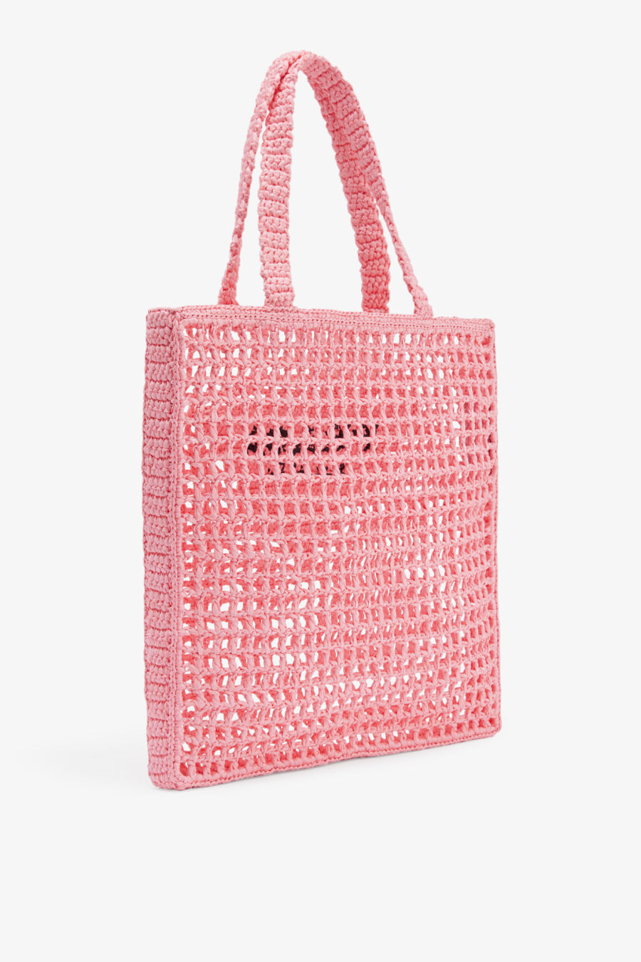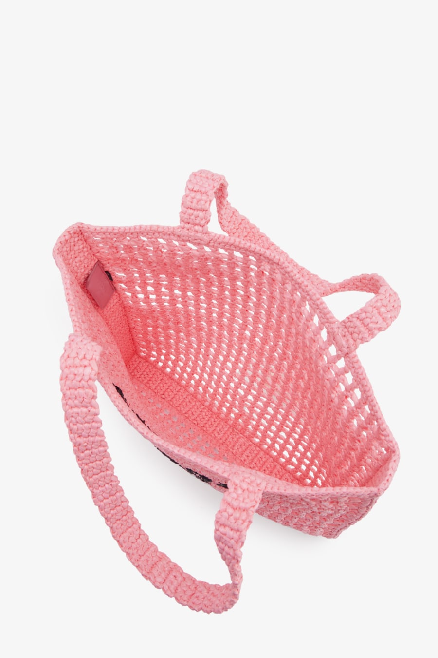 Open top. Double top handles, brand text pattern, all-over mesh crochet pattern.