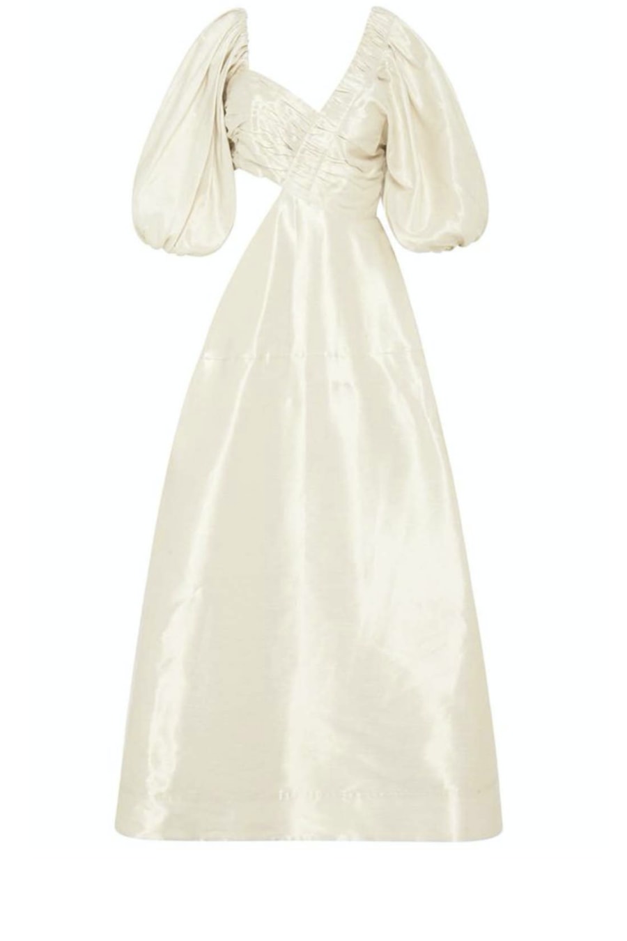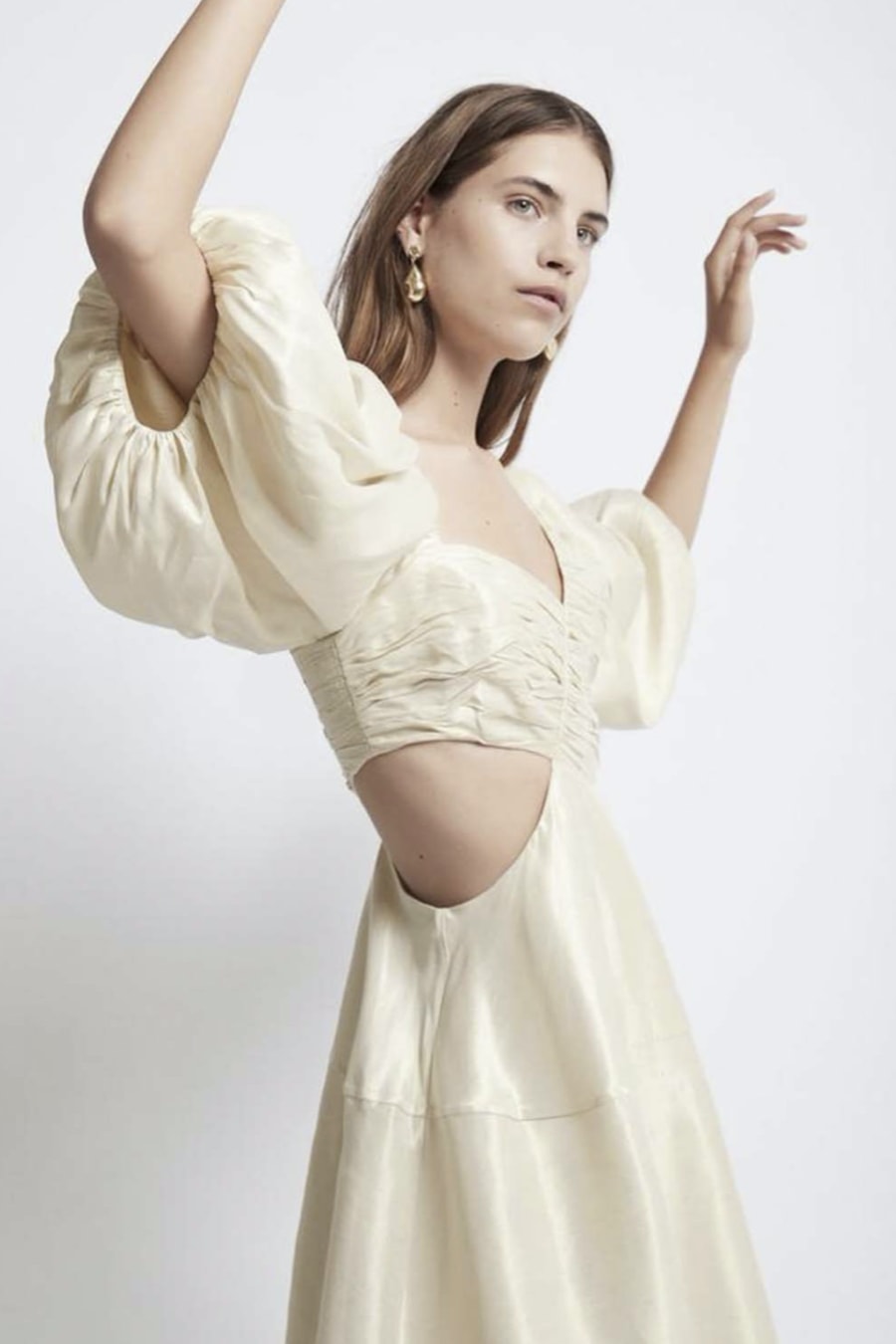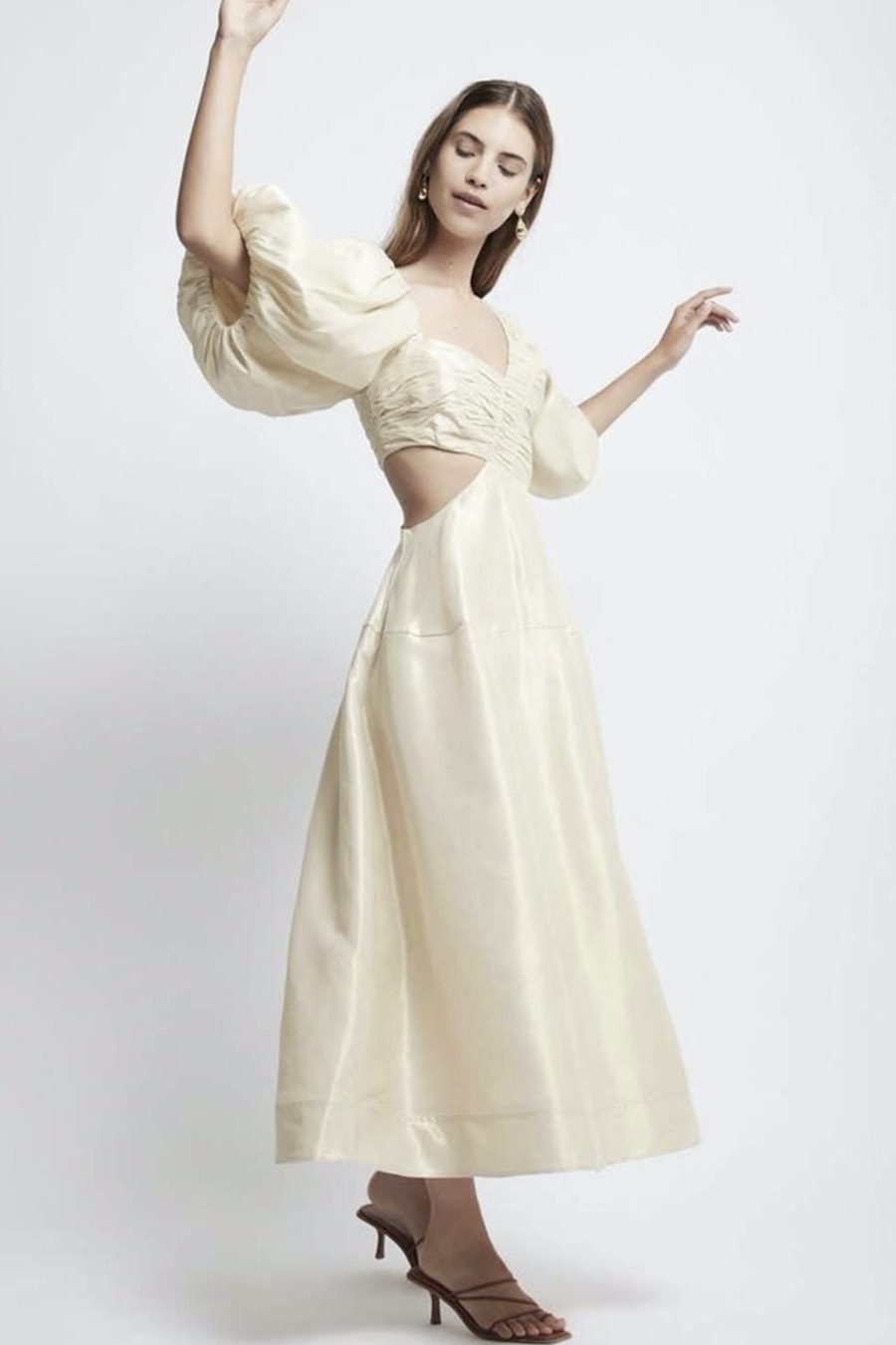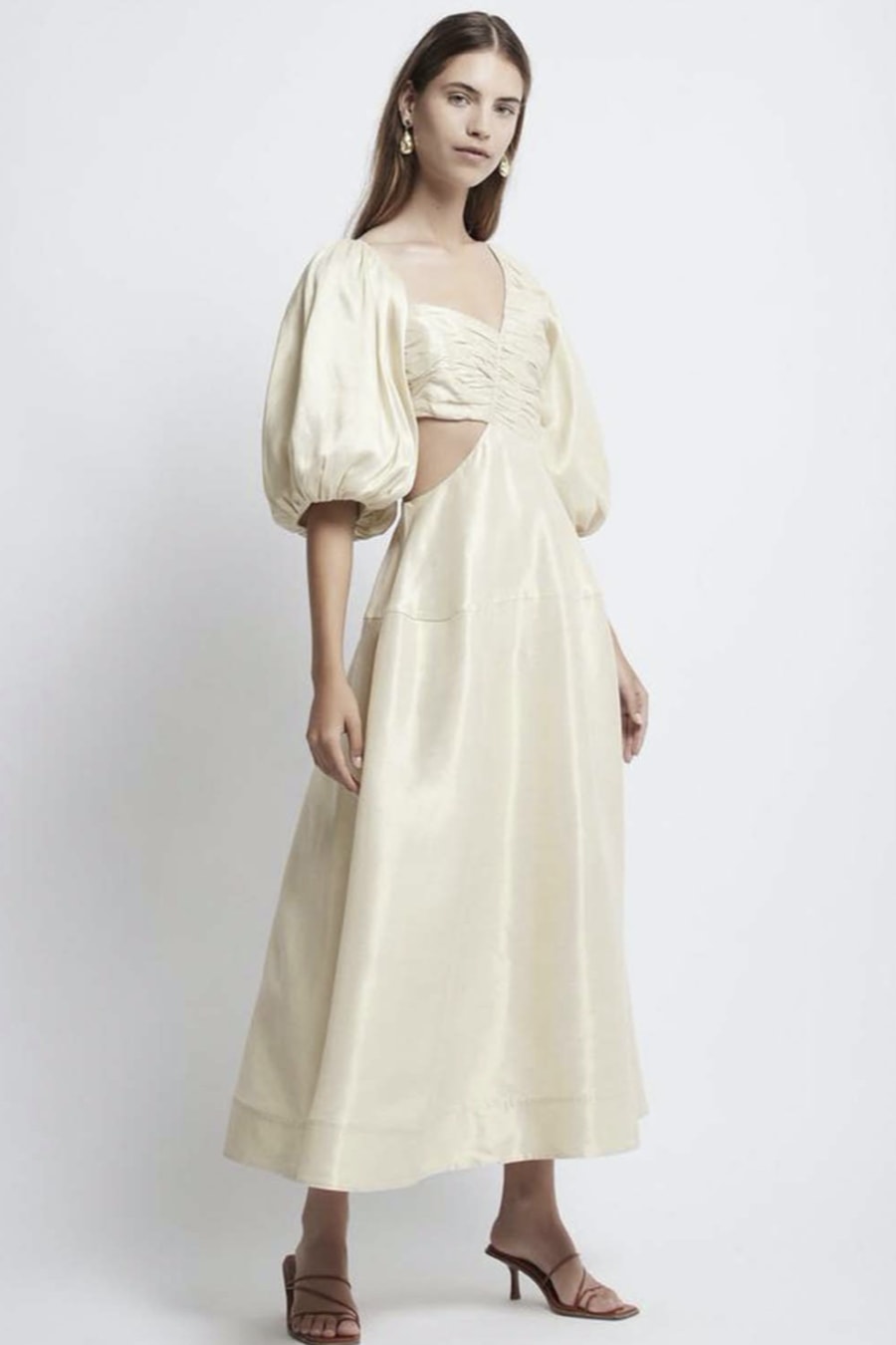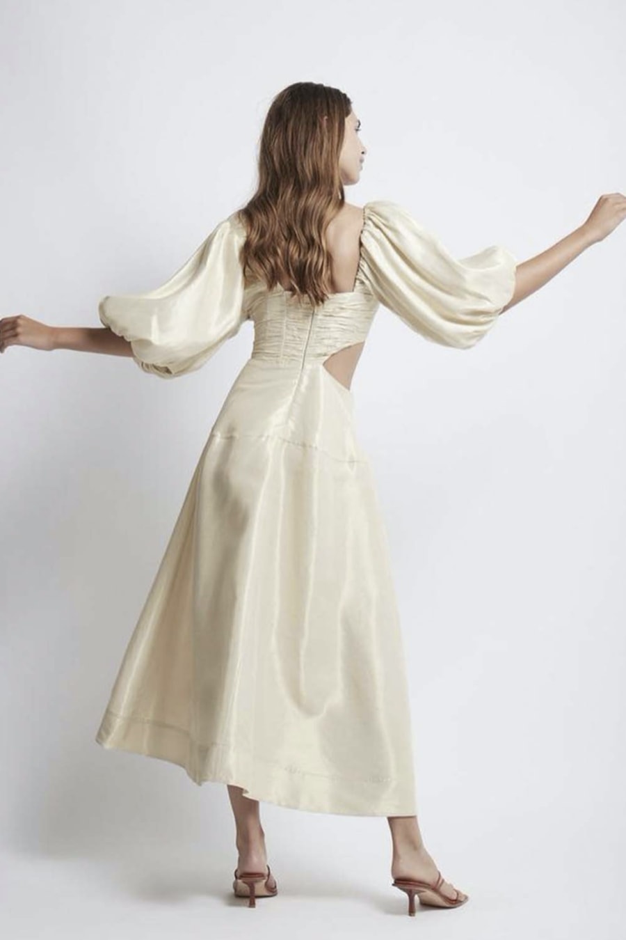 The Prima Lame Midi dress is a gold lamé, midi length dress with statement cutout details and an asymmetric bodice. Side pockets, cutout waist and gathered detail bodice. Statement n sleeve. Zip back closure.
