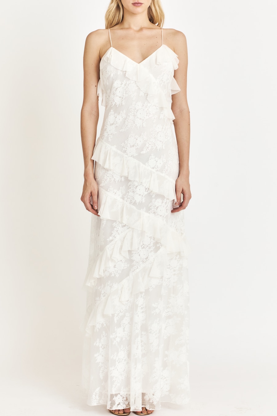 Designed for dancing, our Rialto Dress returns to match your LoveShackFancy fragrance. This must-have maxi stuns with new floral prints and overlapping, asymmetrical ruffles at the neckline that continue to descend through the entire skirt. Slightly fitted, this dress features a sexy silhouette and includes a side seam zipper for closure.