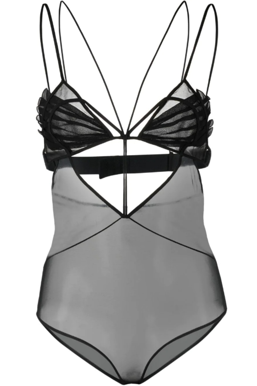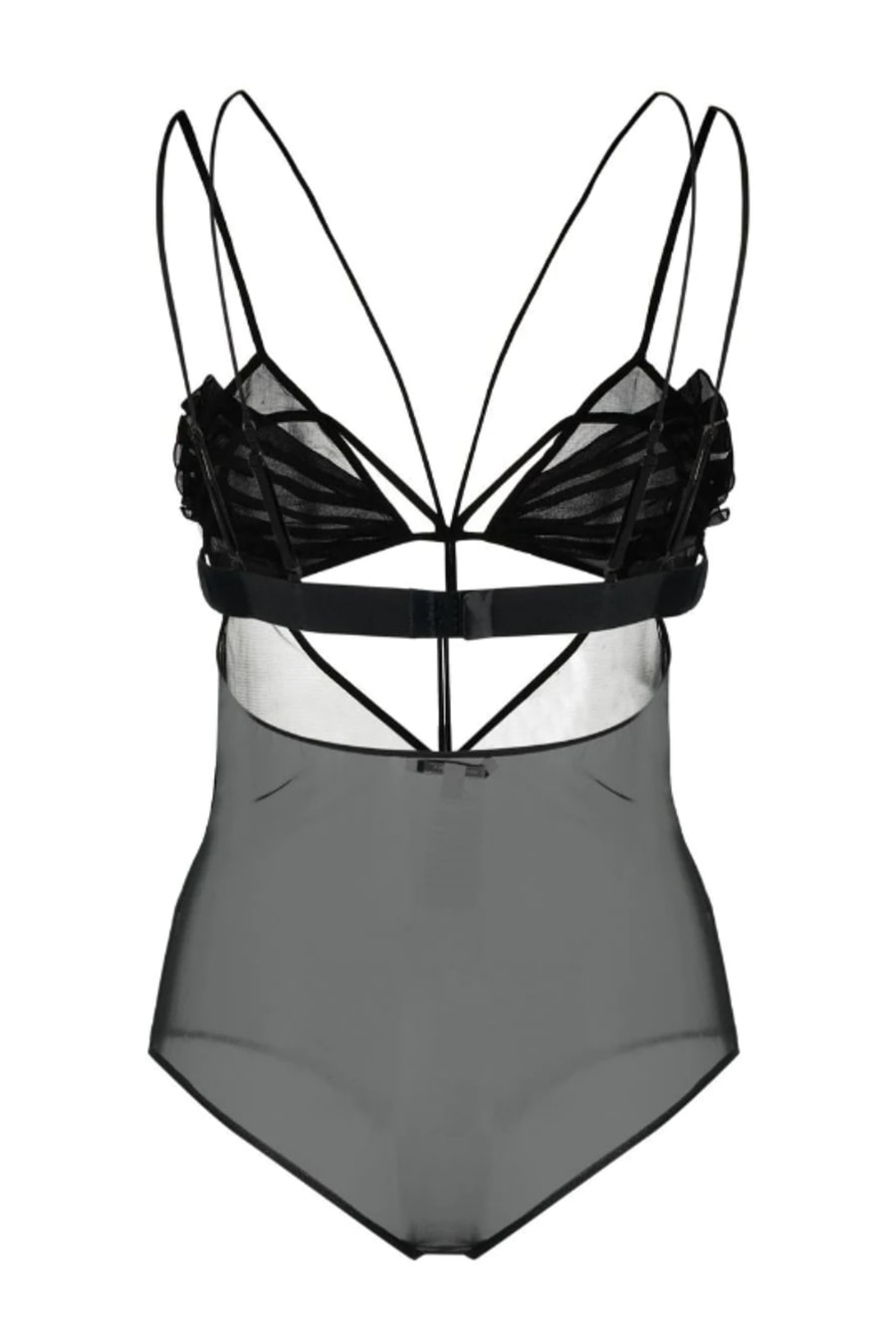 sheer-panelled spaghetti-strap body from Nensi Dojaka featuring sheer panelling, triangle cup, spaghetti straps, jet black, silk and stretch-design.
