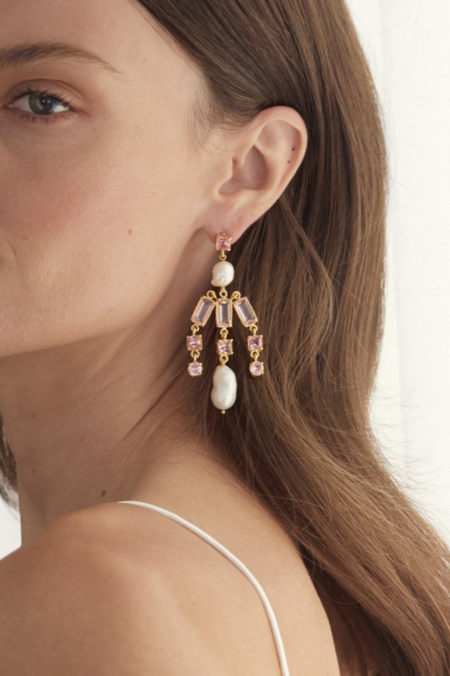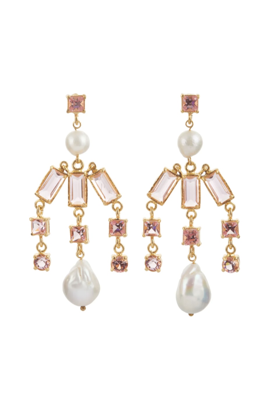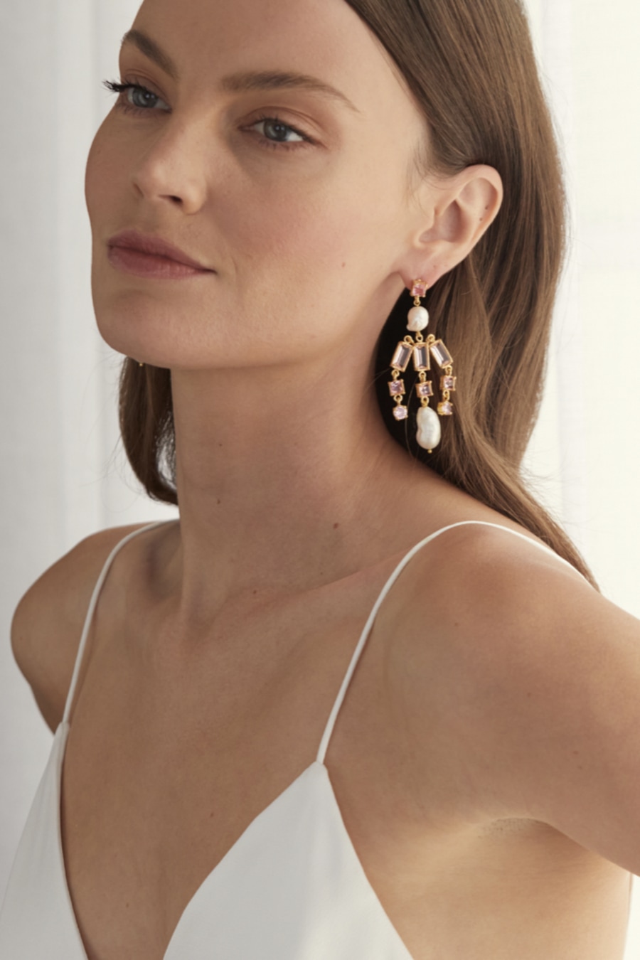 The handcrafted Sofia Earrings in Pale Pink are adorned with pale pink-hued crystals and accented by lustrous freshwater Baroque Pearls.