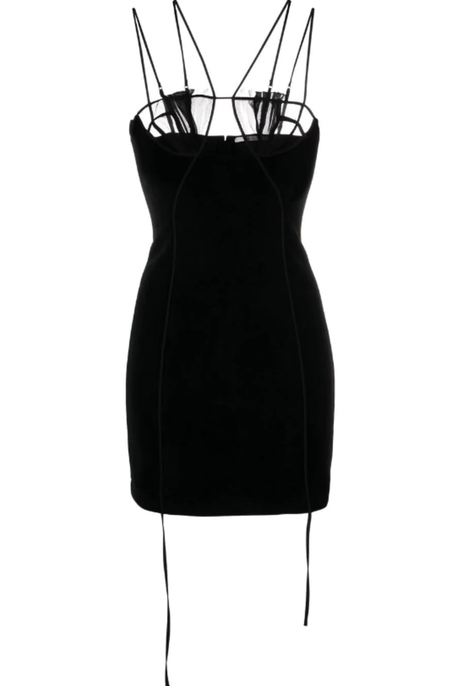 spaghetti-strap minidress from Nensi Dojaka featuring black, cotton blend, semi-sheer panels, spaghetti straps and thigh-length.