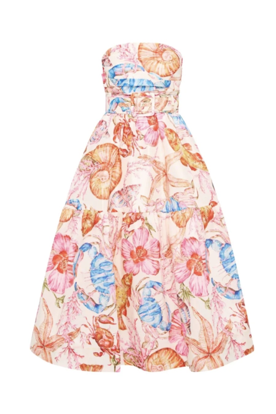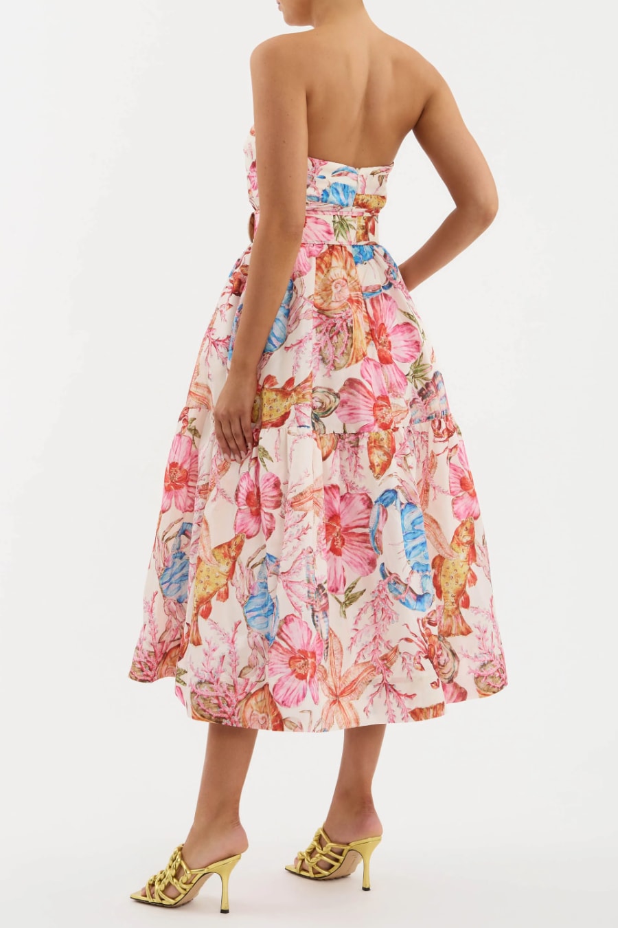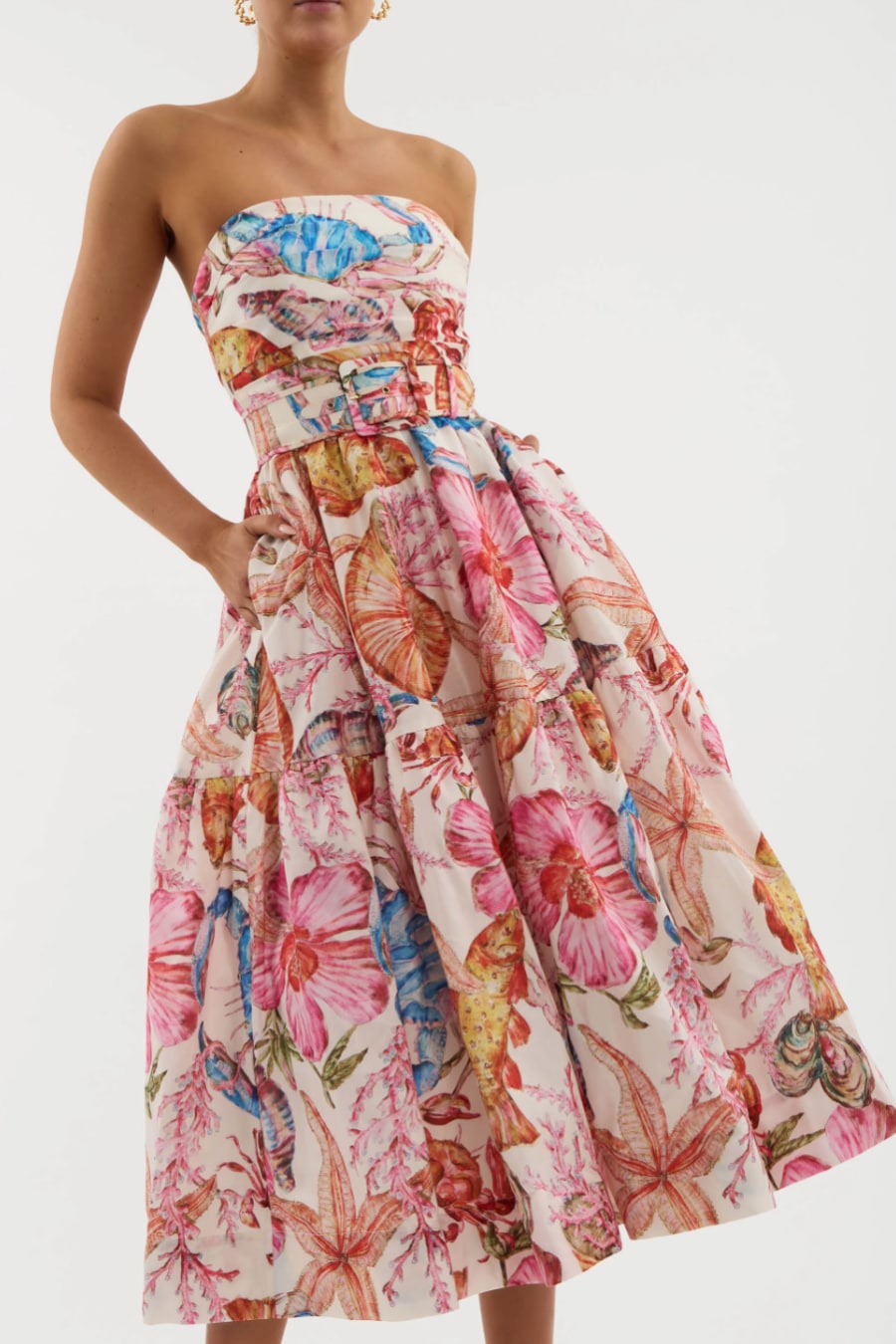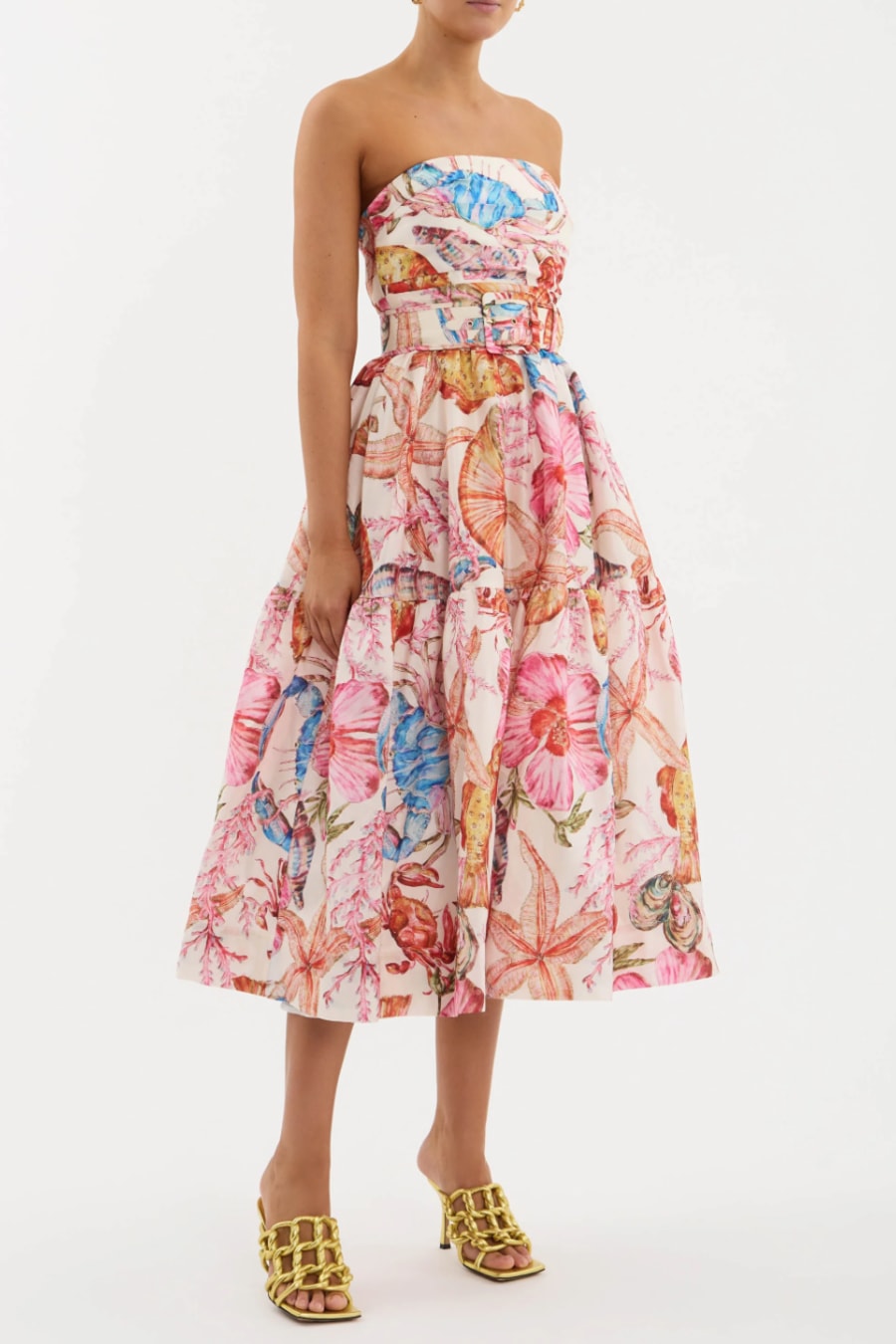 The Summer Seas Midi Dress is a chic and charming choice for your wardrobe. It features an elegant strapless neckline secured with grip tape for support, cinched waist and fitted bodice with tucks, complemented with a self belt creating a flattering silhouette. The inverted tucks and crinoline hem create a beautiful circular shape in the skirt, enhancing its elegance. This dress is fully lined and features a side zip fastening for added comfort and convenience.