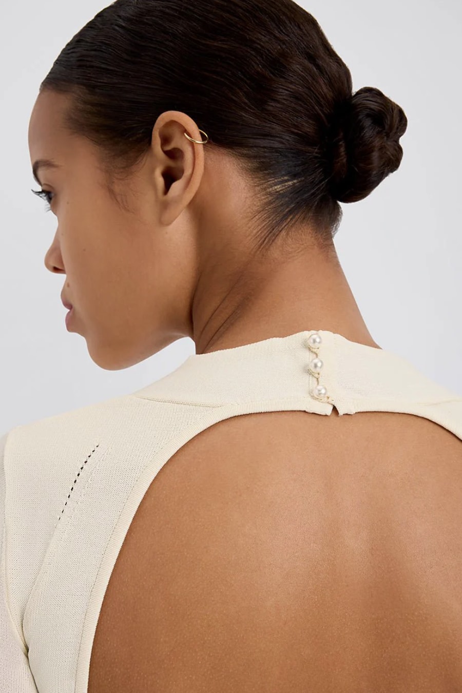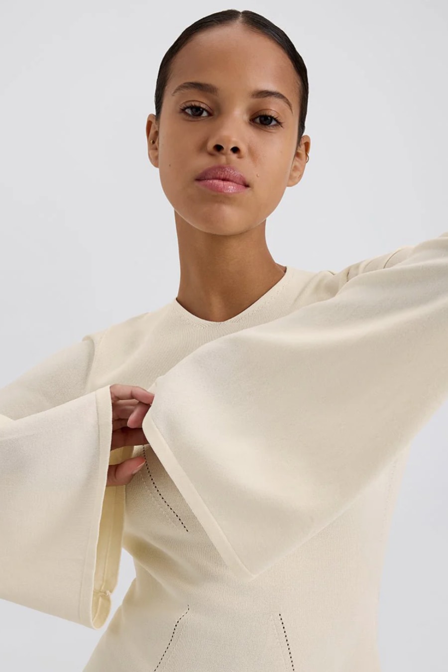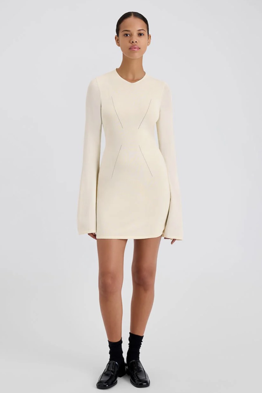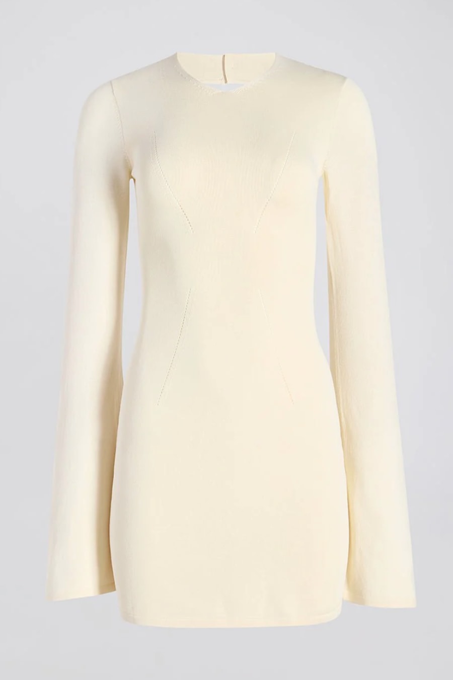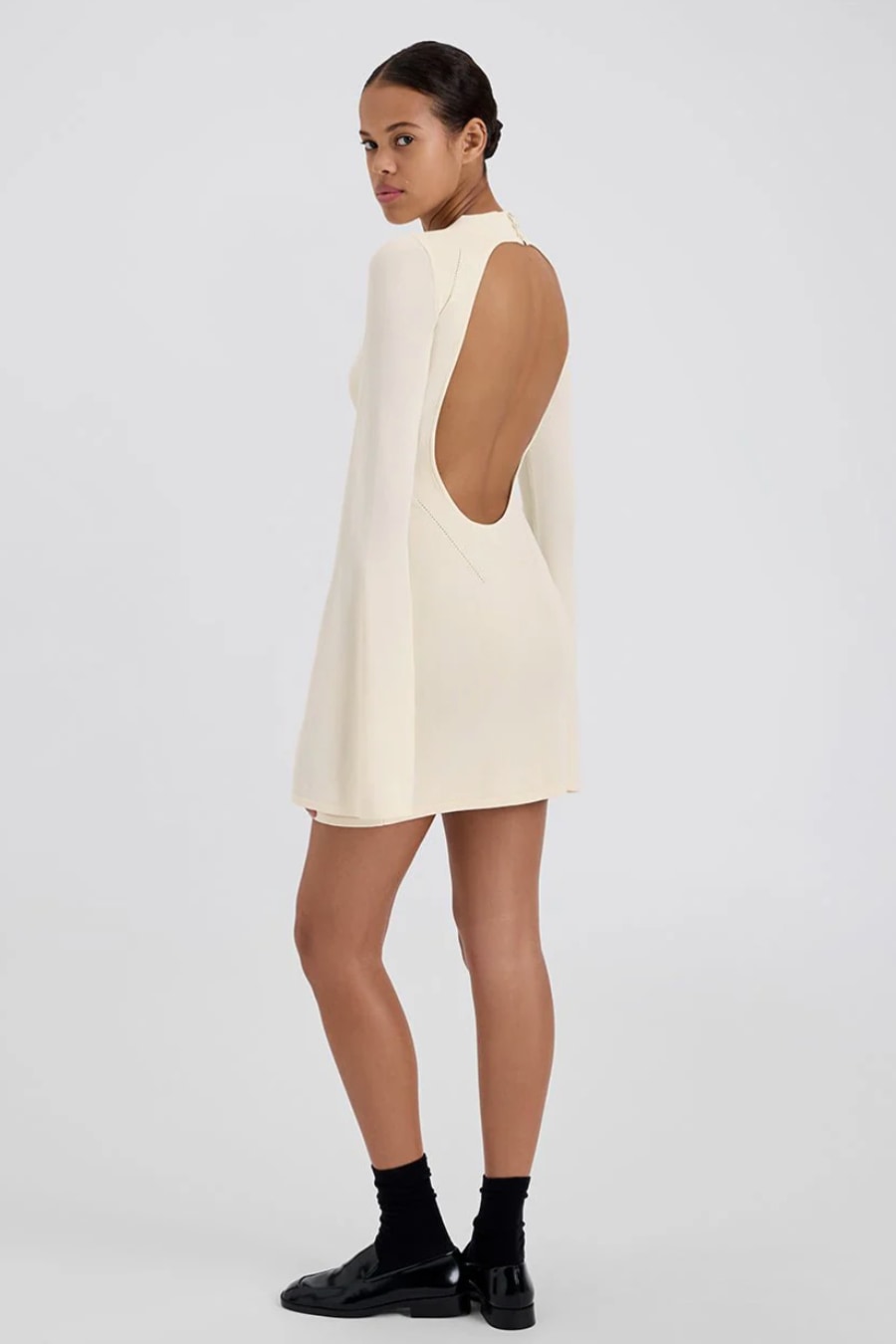 The Narcia Mini Dress, made in a structured viscose knit, features a subtle v neckline, an open back, and bell sleeves. Completed with three iridescent buttons at the back of the neck.