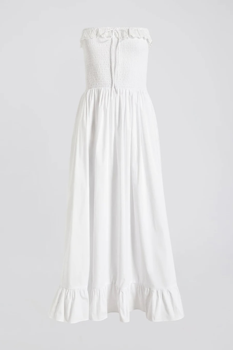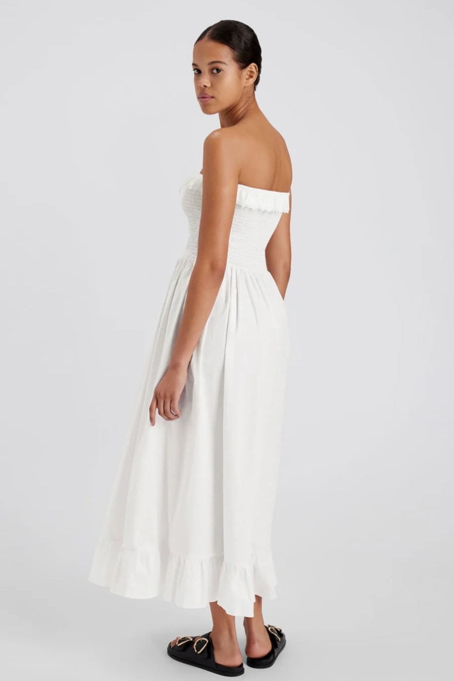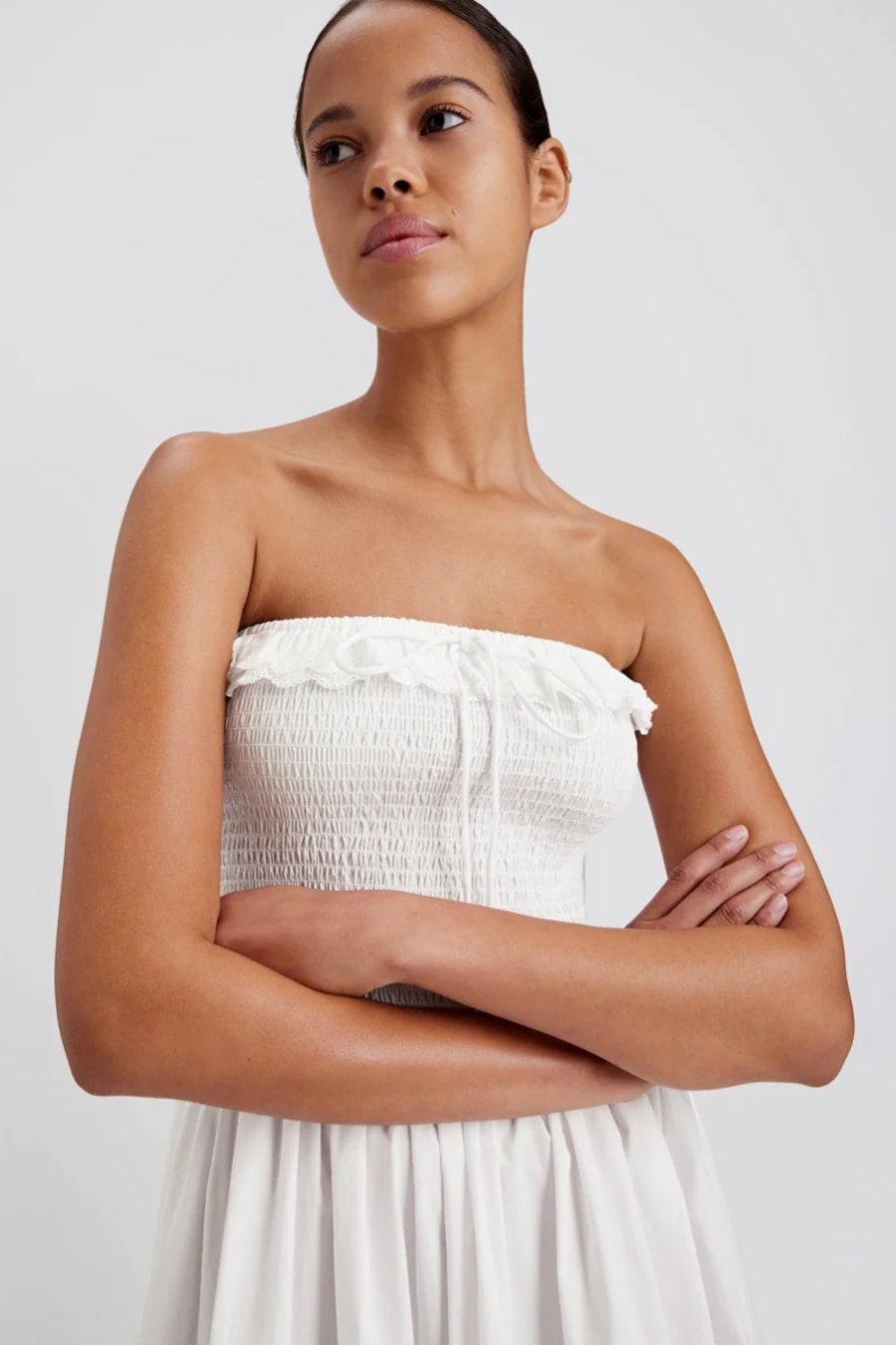 The Nicole Dress, made in cotton voile, features a tiered skirt and a shirred bodice in a midi length. Wear as a cover up with any of our swim.