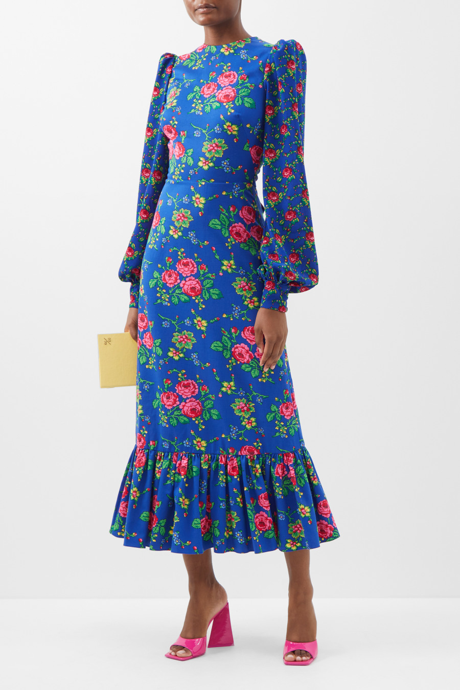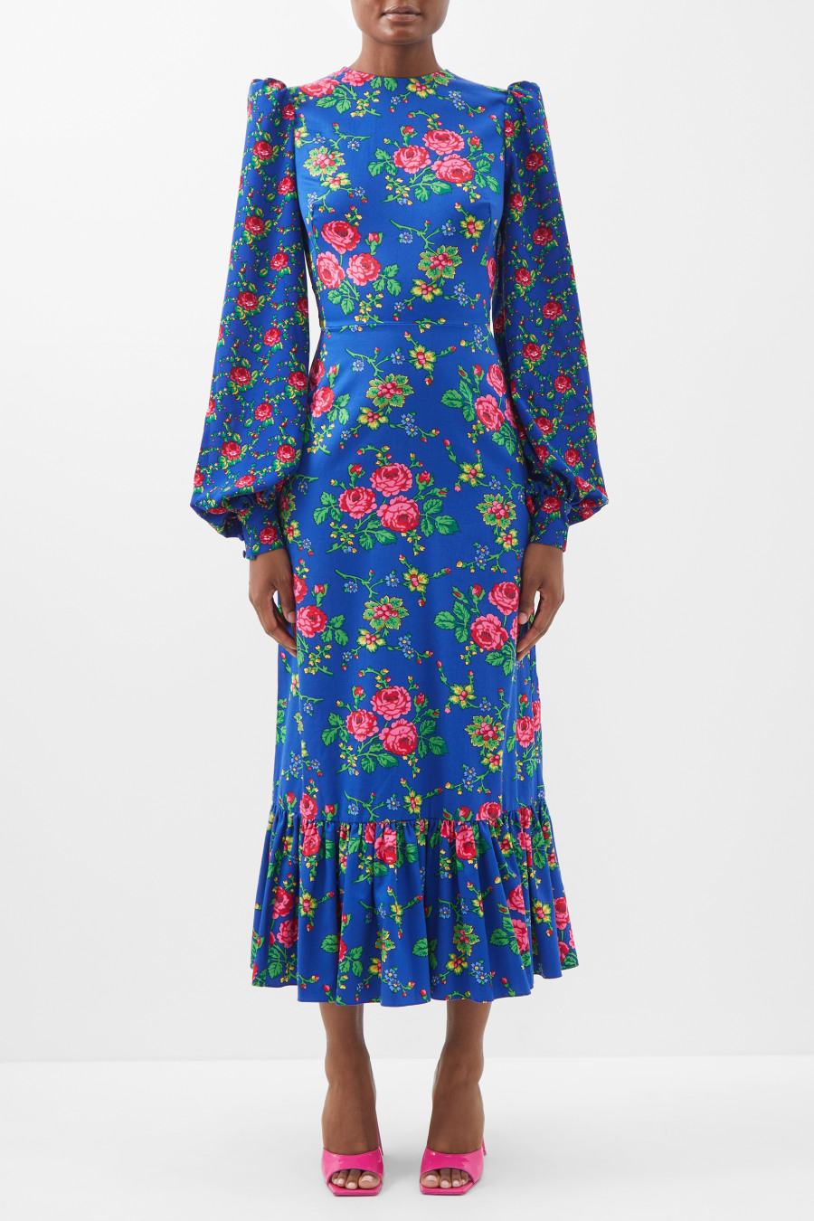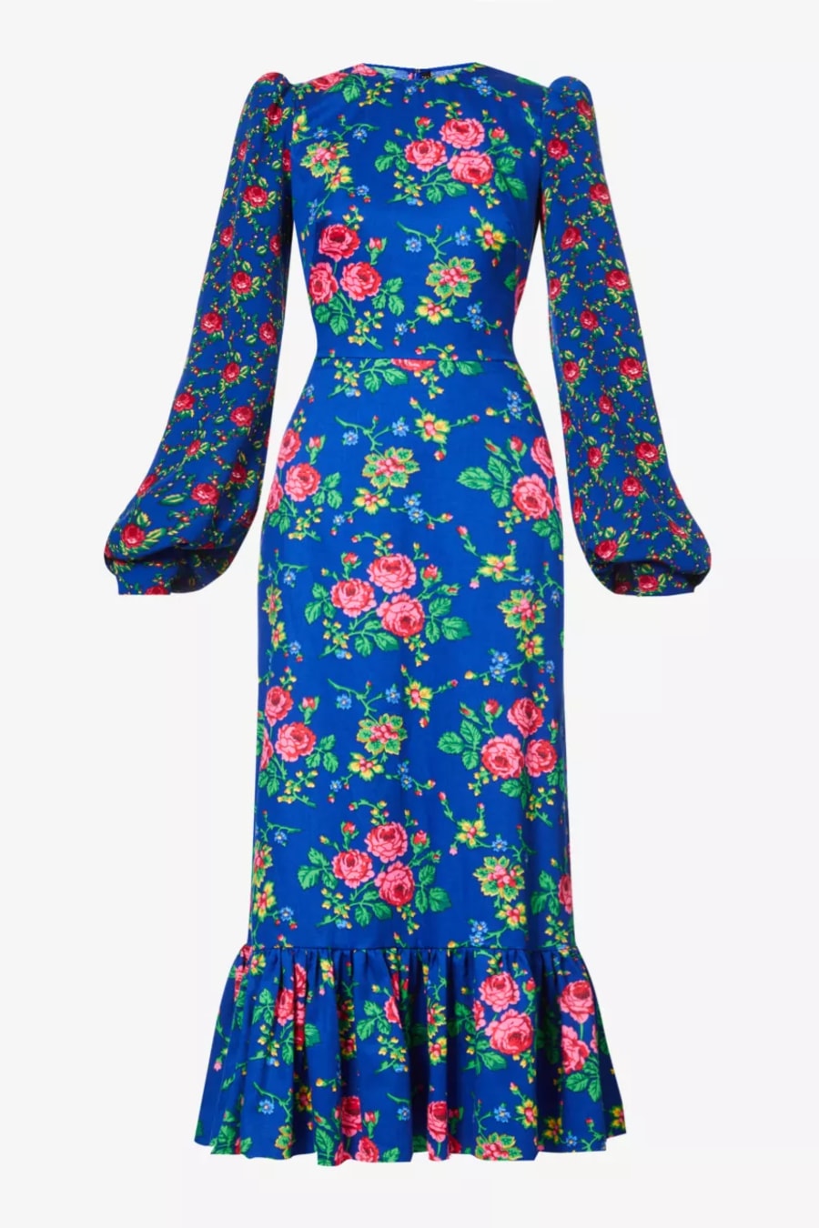The Vampire’s Wife’s blue The Villanelle midi dress is named in homage to the antagonist of the television drama Killing Eve, who was revered for her high-fashion wardrobe and wore this style in season three. The soft cotton follows the label’s signature fitted silhouette with a nipped-in waist balanced by puffed shoulders and voluminous sleeves, before finishing with a ruffle-trimmed hem and tie-fastening sashes on the back.