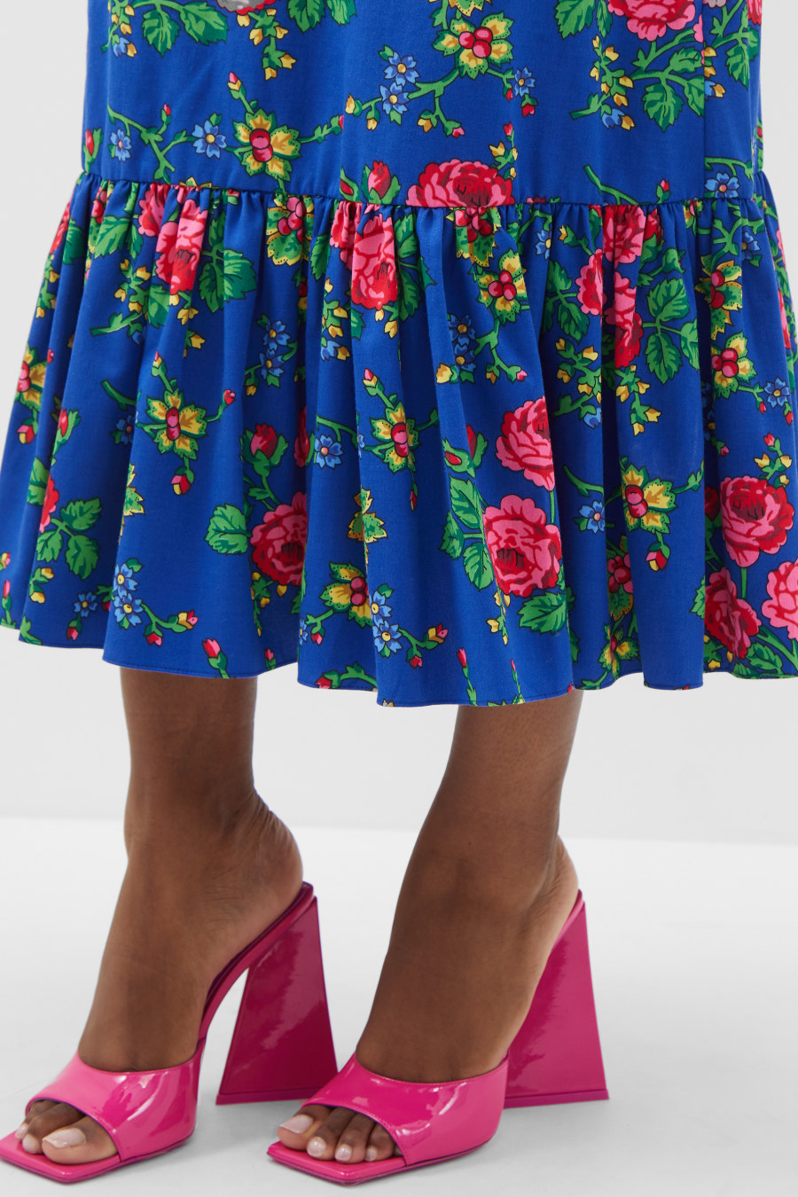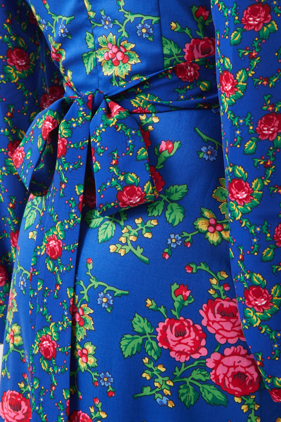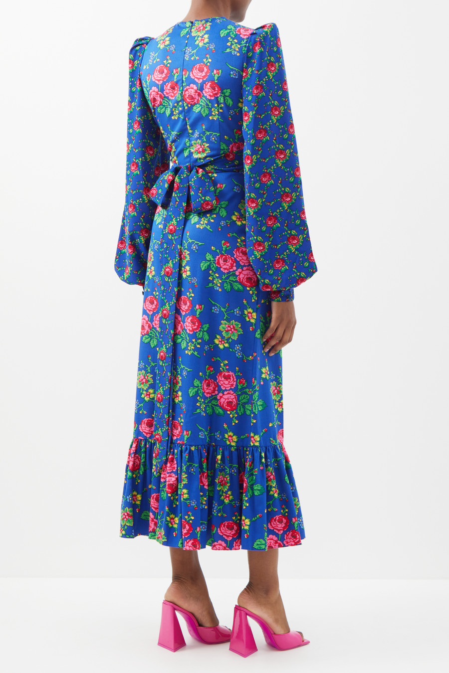 The Vampire’s Wife’s blue The Villanelle midi dress is named in homage to the antagonist of the television drama Killing Eve, who was revered for her high-fashion wardrobe and wore this style in season three. The soft cotton follows the label’s signature fitted silhouette with a nipped-in waist balanced by puffed shoulders and voluminous sleeves, before finishing with a ruffle-trimmed hem and tie-fastening sashes on the back.