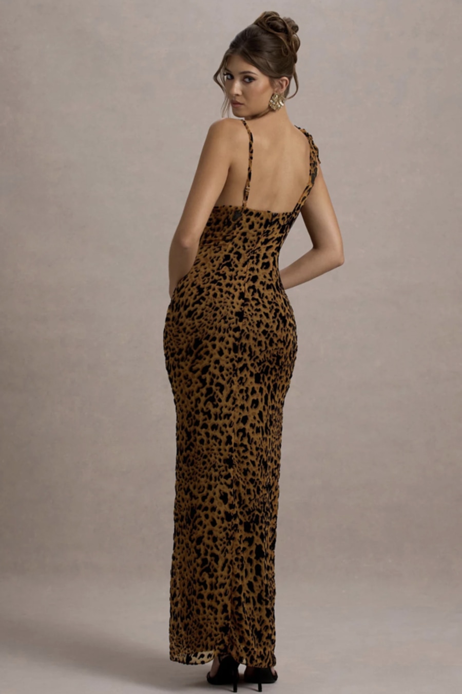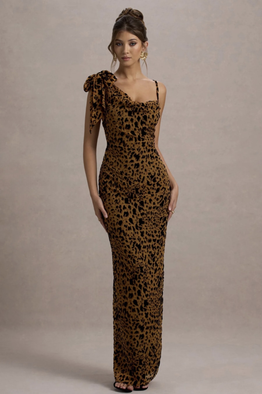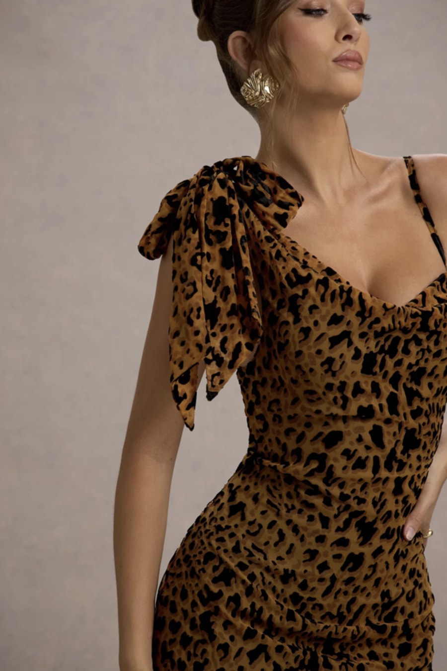 Defined by luxurious textures and bold design, Yasmin is a striking choice for those who love to stand out. Crafted from our premium velvet, this leopard print maxi dress exudes a sense of glamour, with its sultry strappy detailing that elegantly wraps around your silhouette. The look is completed by a statement bow, adding a touch of playful sophistication. Perfect for evening events, keep Yasmin in the spotlight by pairing it with minimalist accessories and sleek stilettos.